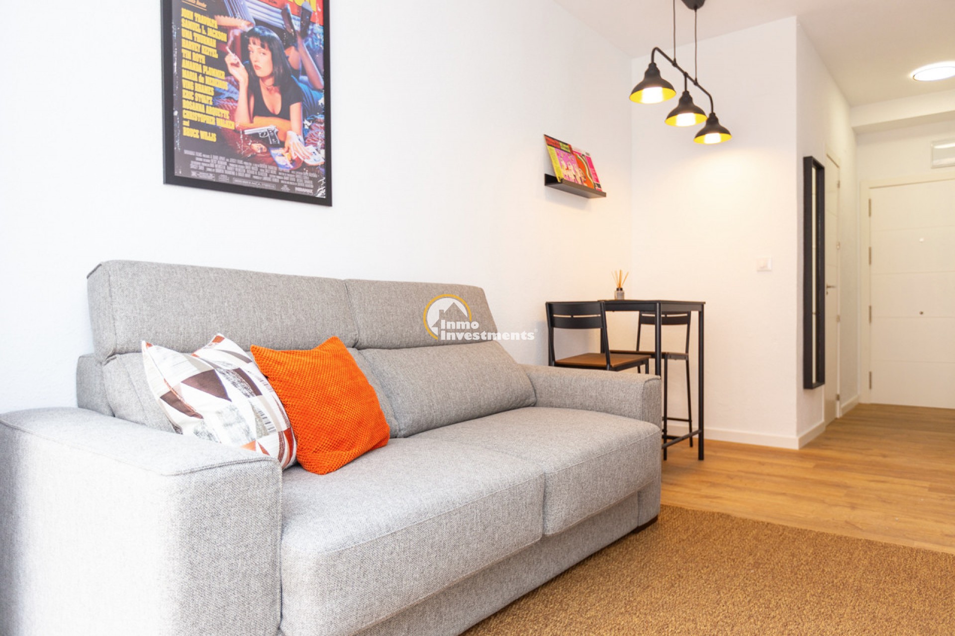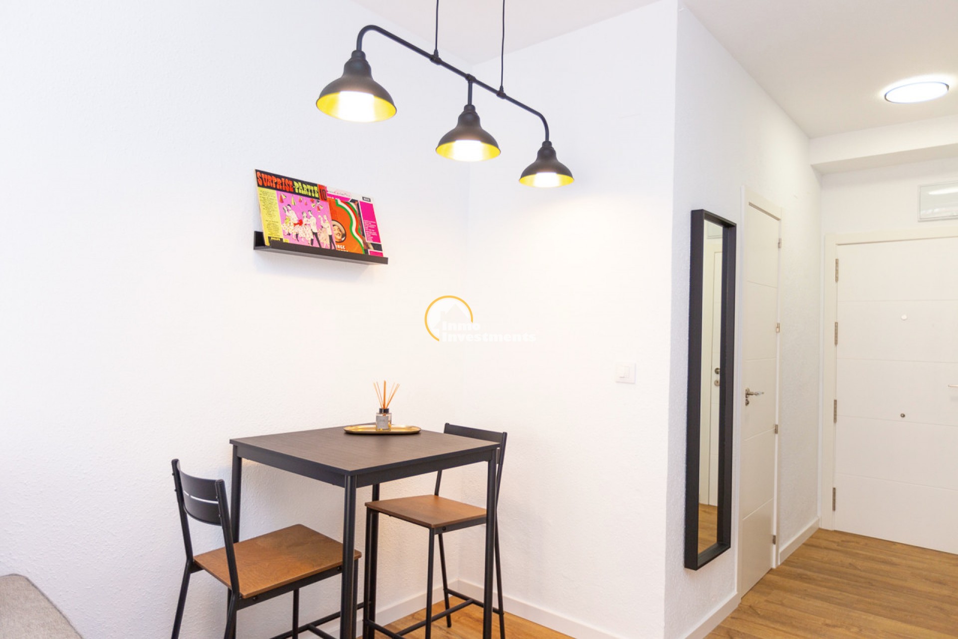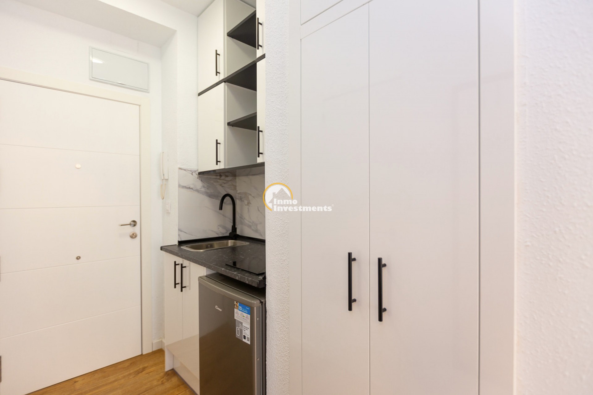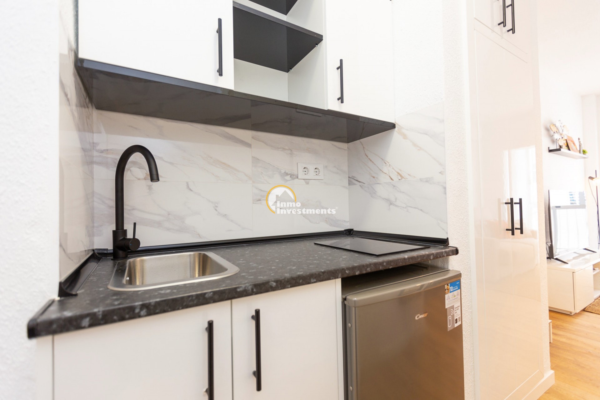 Zum Verkauf steht ein liebevoll und sorgfältig renoviertes Studio-Apartment in Torrevieja, nur wenige Gehminuten vom Playa de los Locos entfernt. Dieses gepflegte Zuhause bietet einen offenen Wohn-/Ess- und Schlafbereich mit Schlafsofa, ein verglaster Wintergarten schafft zusätzlichen Raum zum Entspannen, und die moderne Küchenzeile bietet viel Stauraum und Arbeitsfläche zum Kochen. Ein modernes Duschbad vervollständigt die Wohnung. Das Apartment wurde 2024 komplett in einem modernen und stilvollen Design renoviert, mit vielen Extras wie neuen Wasserleitungen, Elektrik, hochwertigen Einbaumöbeln und Parkettböden. Wird voll möbliert verkauft, alles neu, unbenutzt und im Originalzustand, einschließlich neuer kleiner Elektrogeräte, weißer Ware und einer Klimaanlage für warme und kalte Luft. Gelegen in einer sicheren, gepflegten Wohnanlage mit Aufzug für die Bewohner. Die Gemeinschaft bietet eine Tiefgarage; auch wenn diese Wohnung keinen eigenen Stellplatz hat, stehen derzeit Garagenplätze zur Miete zur Verfügung.