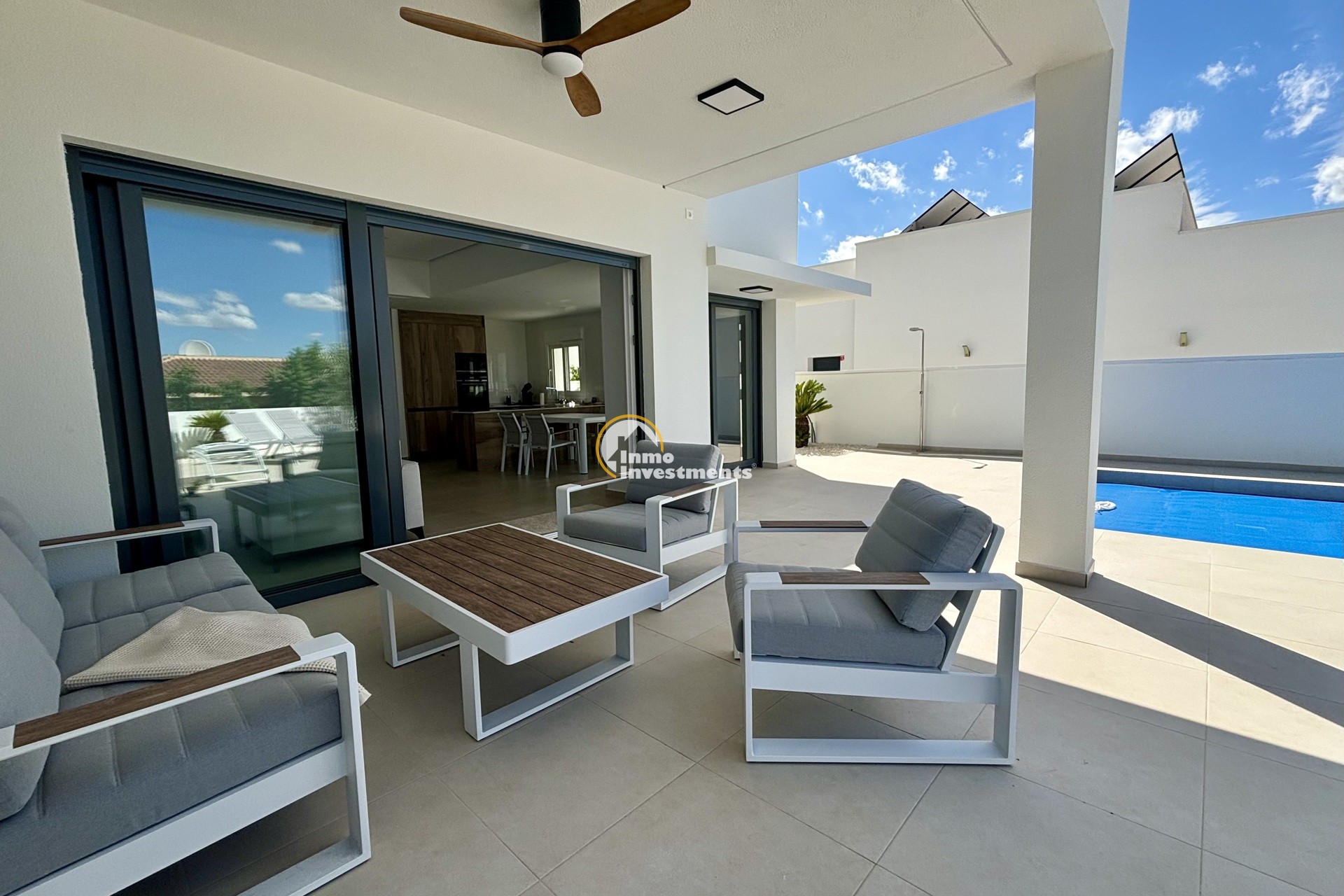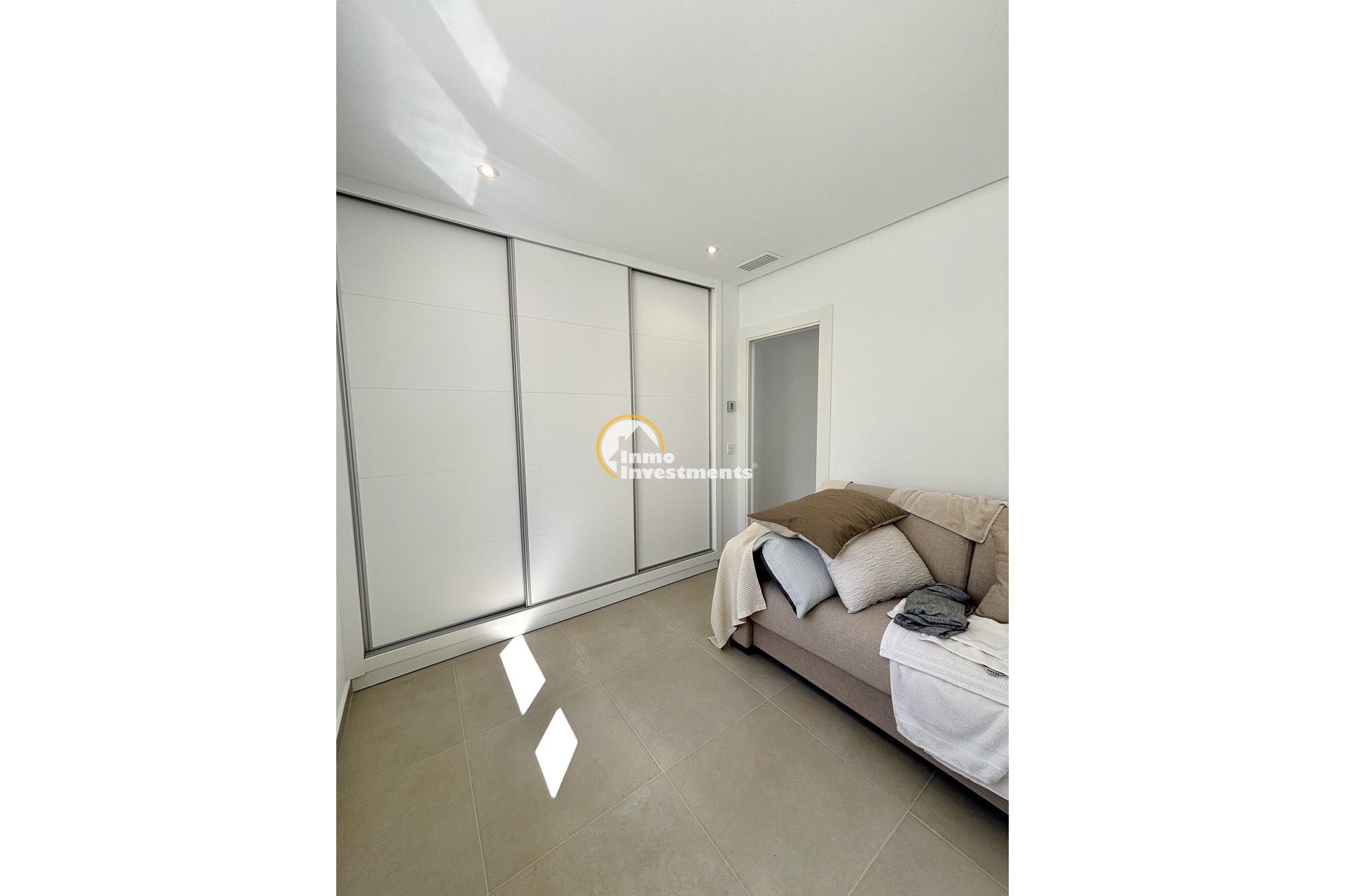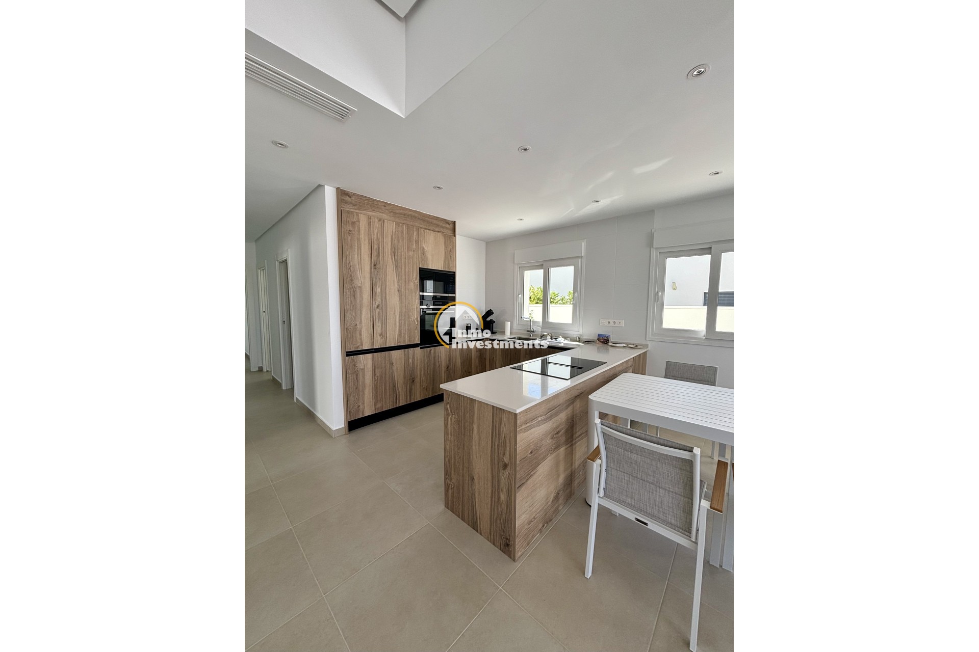 Das Innere jeder Villa wurde so gestaltet, dass es eine komfortable und funktionale Aufteilung bietet, wobei der Schwerpunkt auf Helligkeit und Geräumigkeit liegt: Offenes Wohn-Esszimmer mit großen Fenstern, die natürliches Licht hereinlassen und direkt auf die Terrasse und den Swimmingpool führen. Offene Küche mit modernem Design, ausgestattet mit hochwertigen Schränken, Arbeitsflächen aus Feinsteinzeug und Geräten auf dem neuesten Stand der Technik. 3 geräumige Schlafzimmer mit Einbauschränken und hochwertigen Ausstattungen. 2 moderne Bäder mit Waschbecken, Design-Armaturen und Duschabtrennungen aus gehärtetem Glas. Energieeffiziente Schüco-Fenster, die die Wärme- und Schalldämmung verbessern. Optional: Privates Solarium mit Panoramablick und zusätzlichem Platz zum Entspannen oder zur Schaffung eines Chill-out-Bereichs. Optional: Abstellraum für zusätzlichen Komfort und Stauraum. Vollständig installierte, kanalisierte Klimaanlage, die zu jeder Jahreszeit thermischen Komfort garantiert.