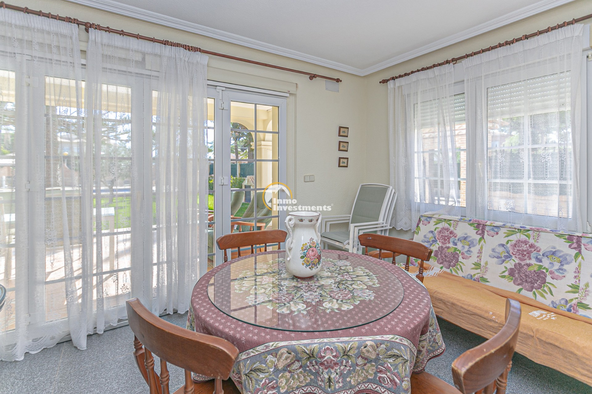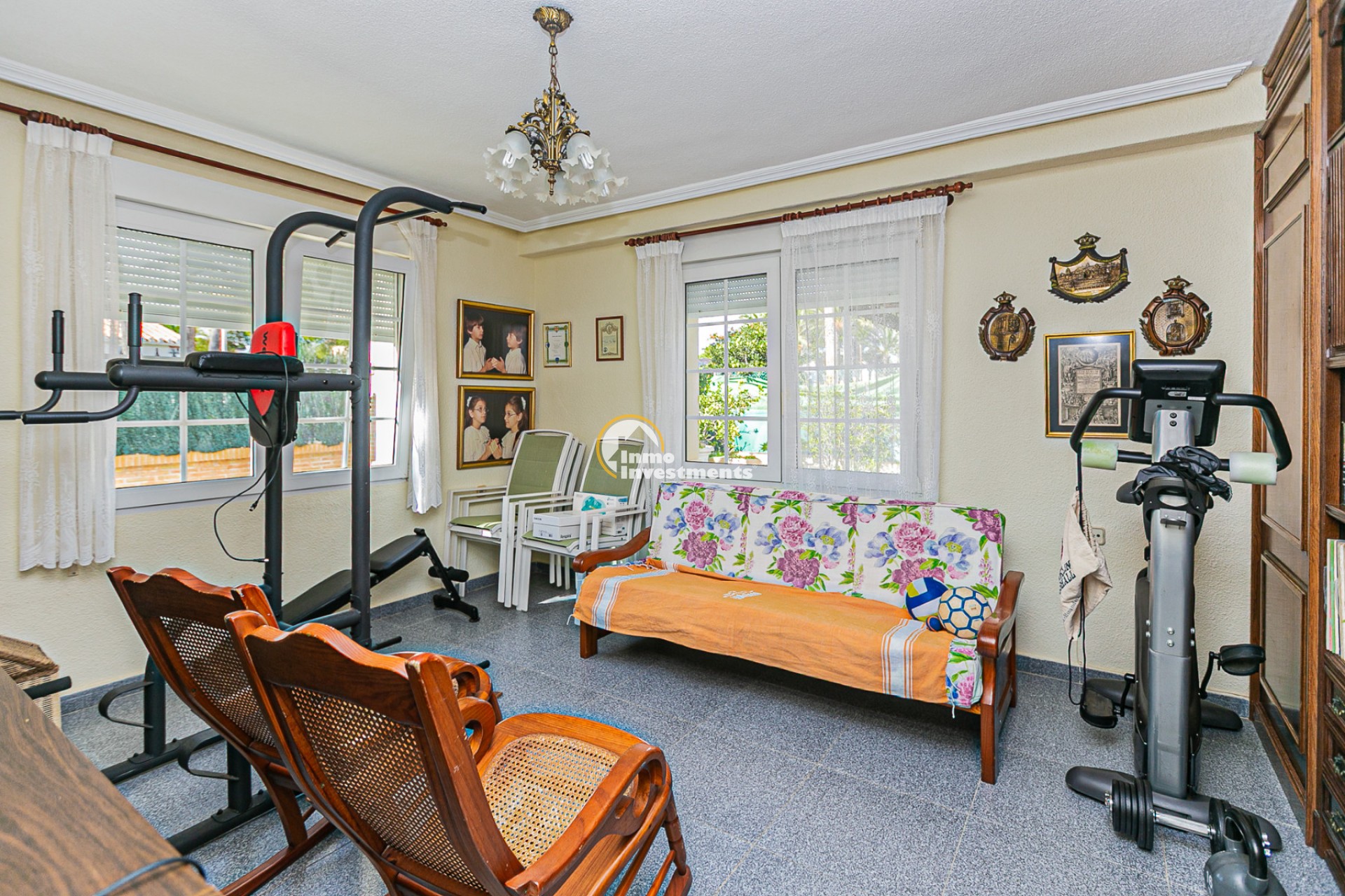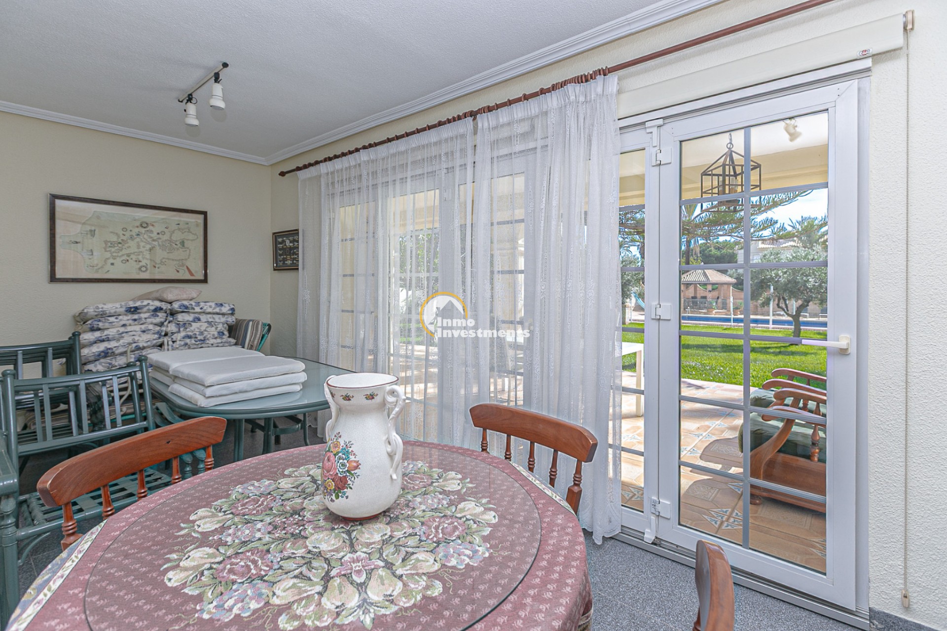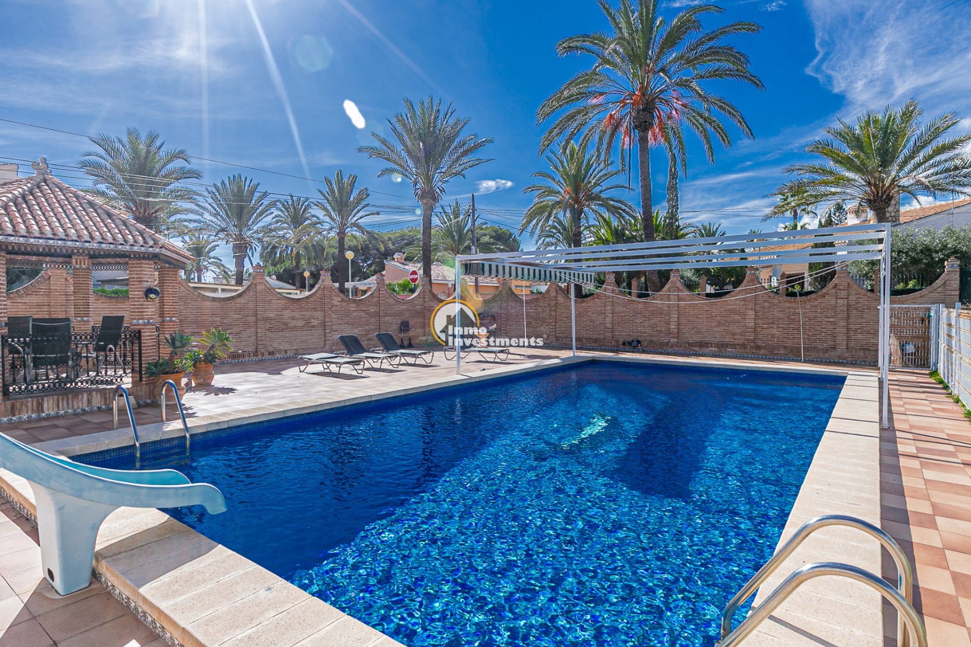 Der Außenbereich ist ein wahres Refugium. Ein gepflegter mediterraner Garten umgibt den privaten Swimmingpool und bietet die perfekte Umgebung zum Sonnenbaden, Entspannen oder für gesellige Abende im Freien. Mehrere Terrassen und überdachte Veranden laden dazu ein, das ganze Jahr über das milde Klima zu genießen. Eine Grillzone und Parkmöglichkeiten auf dem Grundstück runden das Angebot ab.