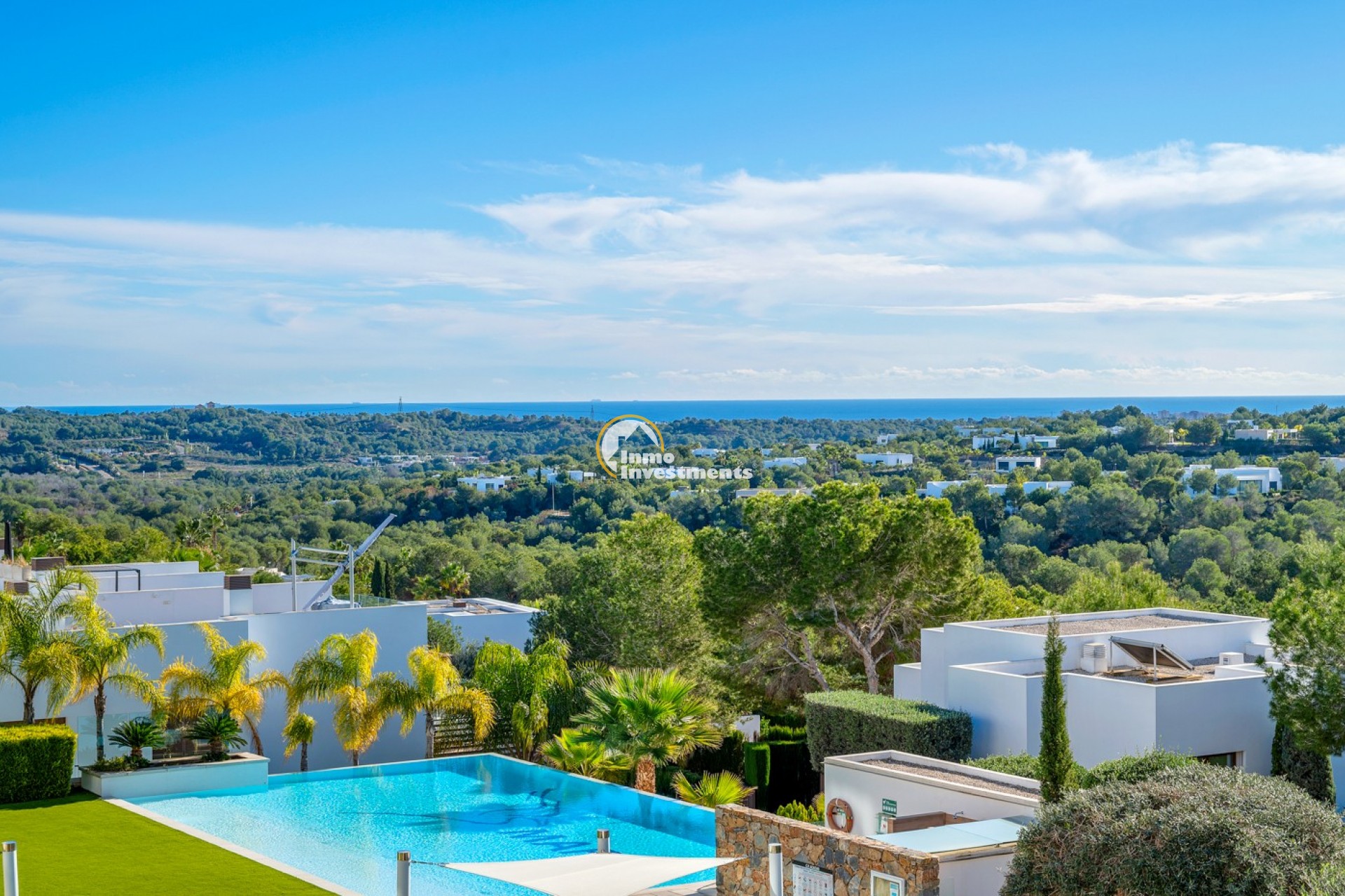 Von der Terrasse aus genießen Sie einen beeindruckenden Panoramablick auf den Golfplatz und das Meer sowie einen direkten Blick auf den wunderschönen Infinity Pool, der sich harmonisch in die Umgebung einfügt und ein Gefühl von Luxus und Ruhe vermittelt. Dank der günstigen Ausrichtung ist die Wohnung den ganzen Tag über lichtdurchflutet.