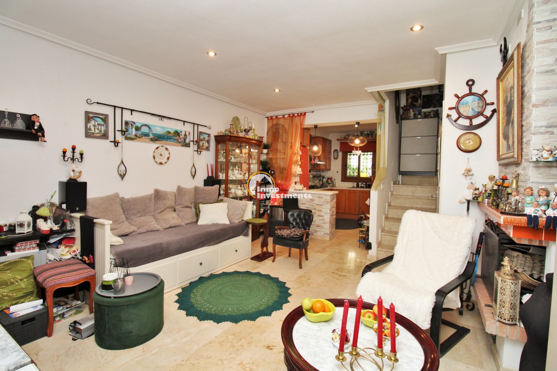 Im Erdgeschoss gibt es eine geflieste Terrasse an der Vorderseite, ideal zum Sitzen im Freien, die in einen hellen Wohn-Essbereich mit Innentreppe führt. Im hinteren Bereich befinden sich die ausgestattete Küche mit Zugang zu einem privaten Patio sowie ein Gäste-WC.