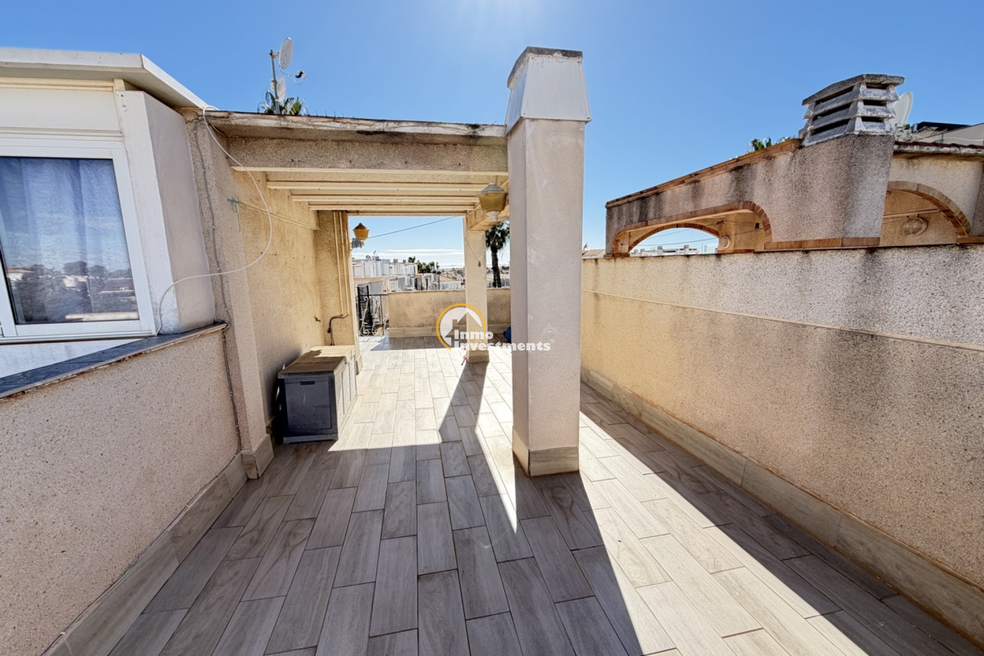 Im ersten Stock befinden sich zwei helle und gut geschnittene Schlafzimmer, beide mit Einbauschränken. Das Hauptschlafzimmer verfügt über einen privaten Balkon mit Blick auf den Gemeinschaftspool und die Gärten und bietet zudem über eine Wendeltreppe Zugang zum Dachsolarium. Das Solarium ist ein herausragendes Merkmal des Hauses und bietet einen Panoramablick auf die Umgebung sowie einen Blick auf das Meer in der Ferne – ein fantastischer Ort zum Entspannen oder für gesellige Stunden.
