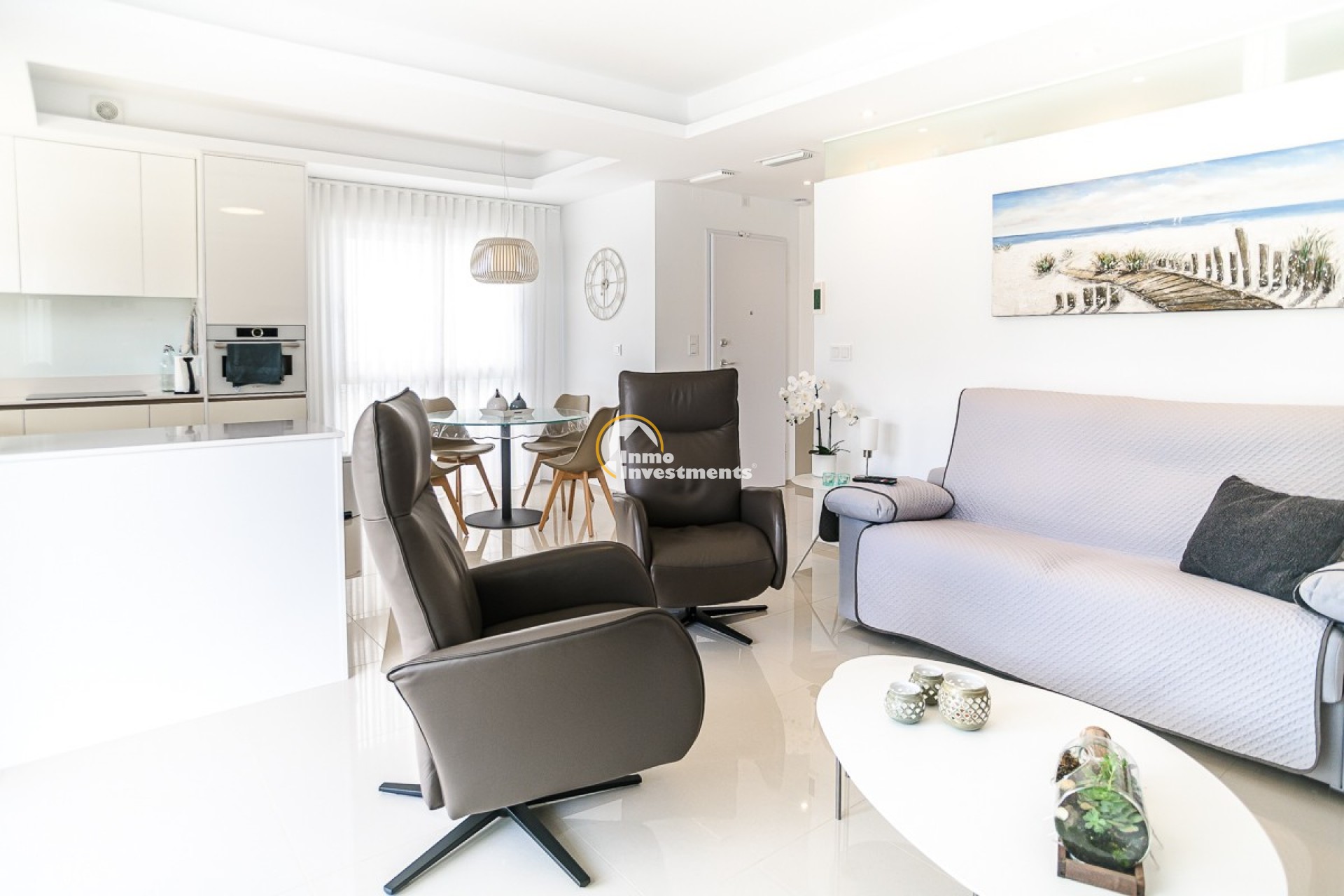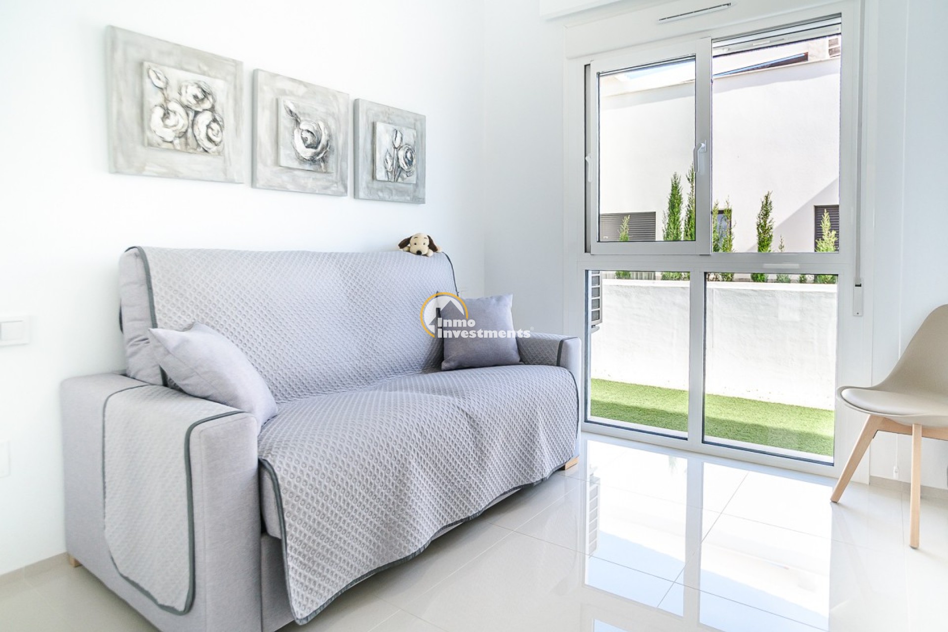 Im Inneren erwarten Sie zwei geräumige Schlafzimmer mit Einbauschränken und zwei moderne Badezimmer. Das helle und offene Wohnzimmer geht fließend in die voll ausgestattete Küche über. Vom Wohnzimmer aus gelangen Sie direkt auf die große private Terrasse – ideal für einen Kaffee in der Morgensonne, ein gemütliches Barbecue oder einfach zum Entspannen im Freien. Auf der Rückseite befindet sich eine weitere Terrasse, auf der Sie die Morgensonne ungestört genießen können.