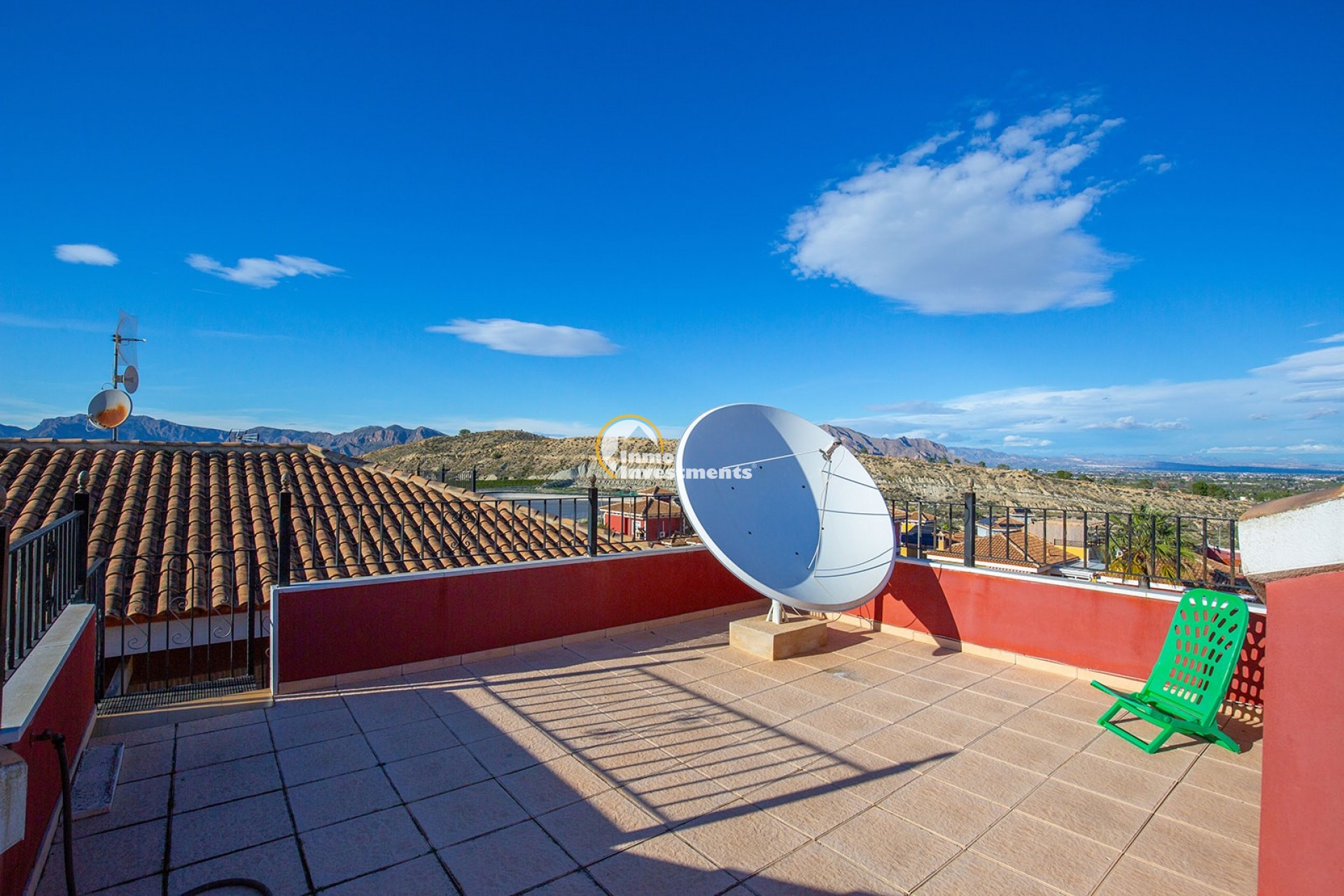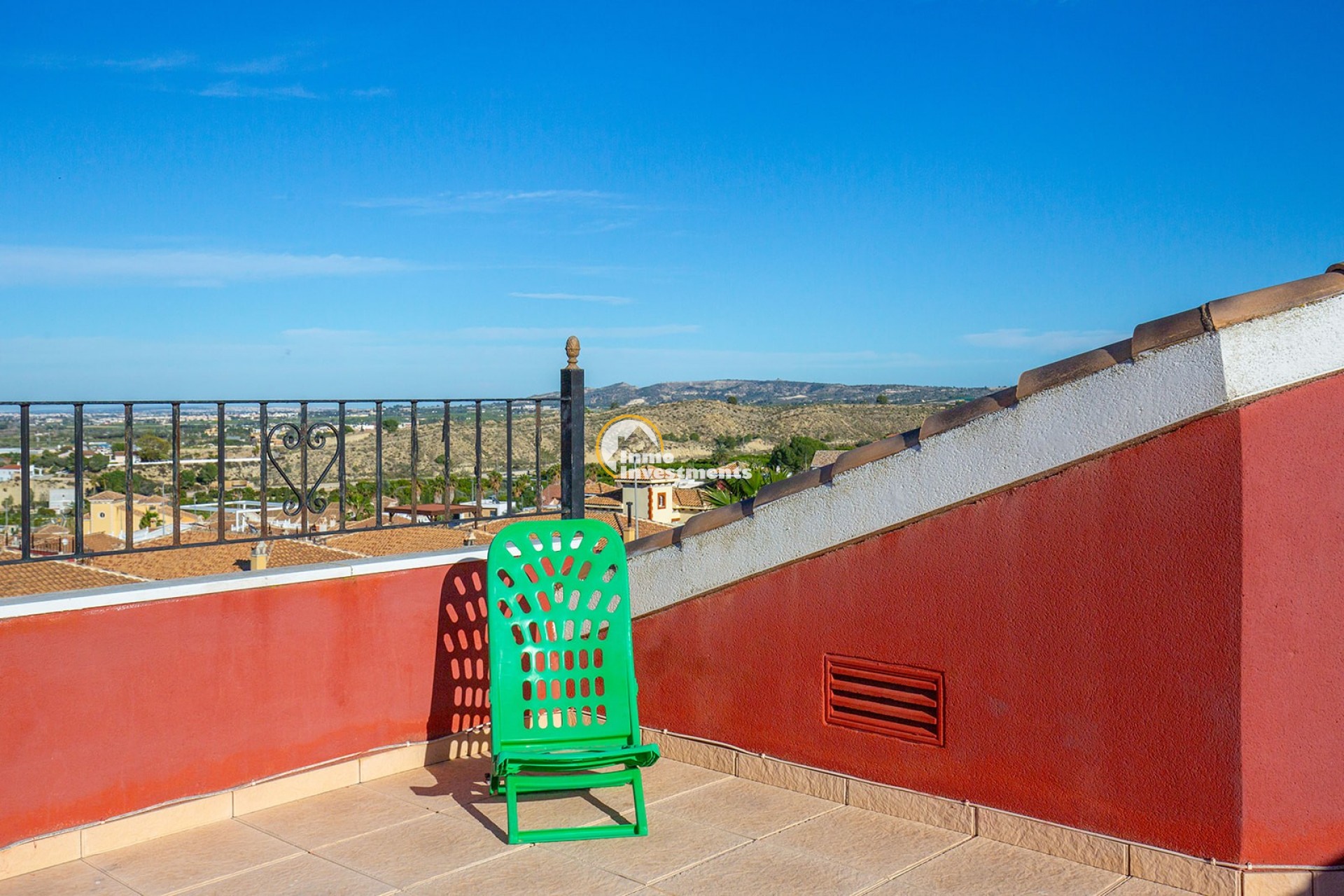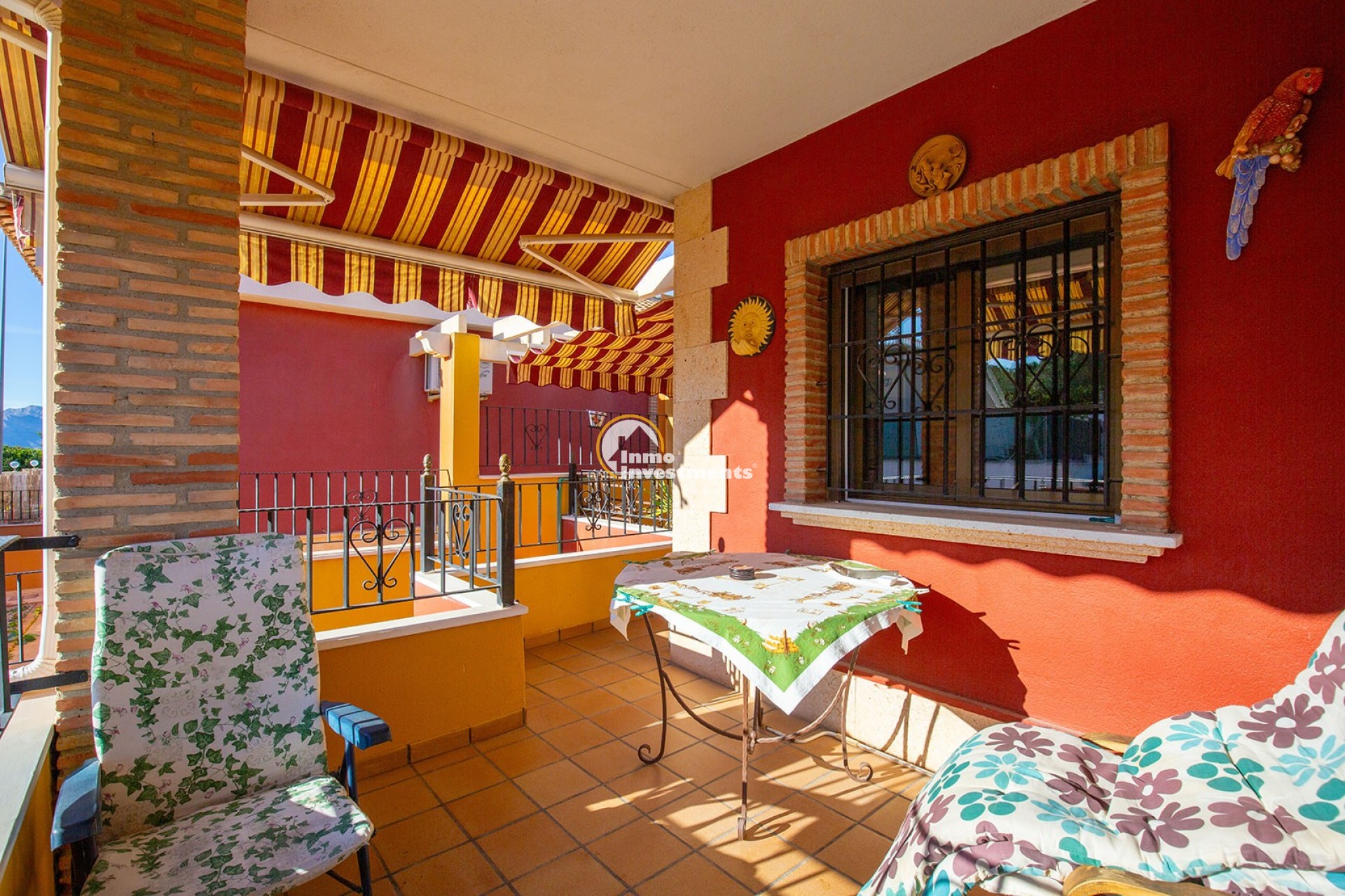 An der Vorderseite der Villa bietet eine große private Terrasse zusätzlichen Außenwohnraum, perfekt zum Entspannen oder für gesellige Stunden. Die traditionelle spanische Architektur mit ihrem Ziegeldach und der warmtonigen Fassade fügt sich harmonisch in die umliegende Nachbarschaft ein.