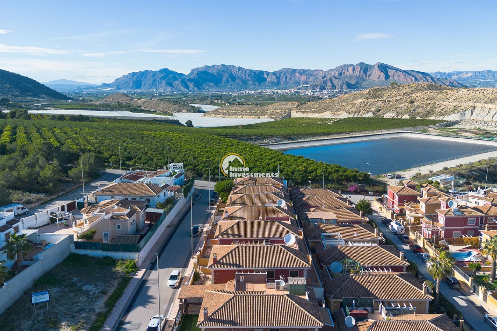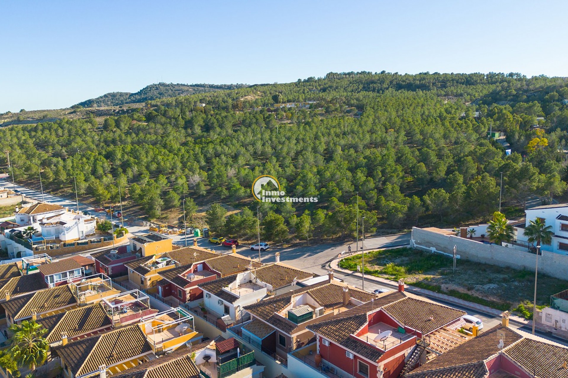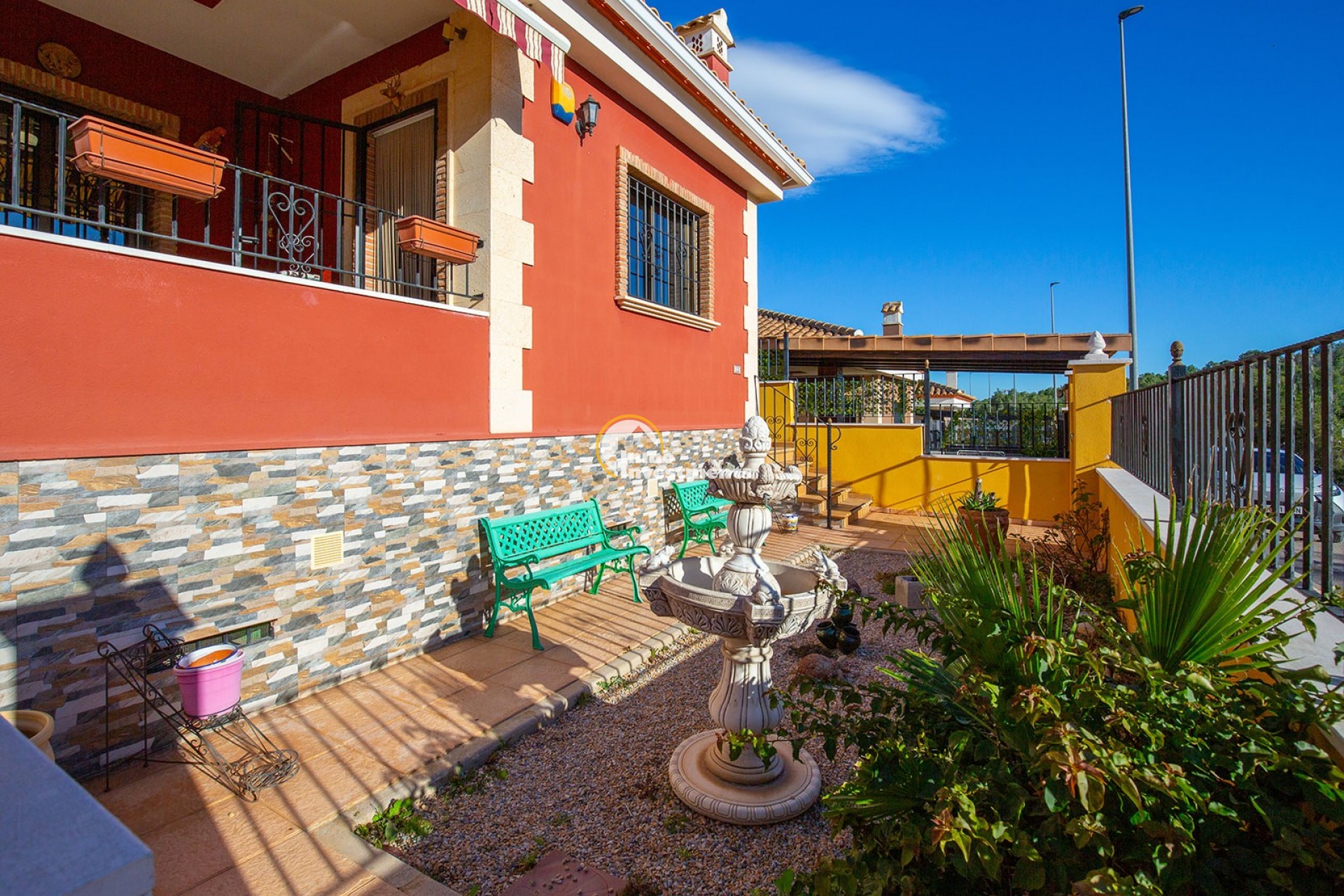 An der Vorderseite der Villa bietet eine große private Terrasse zusätzlichen Außenwohnraum, perfekt zum Entspannen oder für gesellige Stunden. Die traditionelle spanische Architektur mit ihrem Ziegeldach und der warmtonigen Fassade fügt sich harmonisch in die umliegende Nachbarschaft ein.