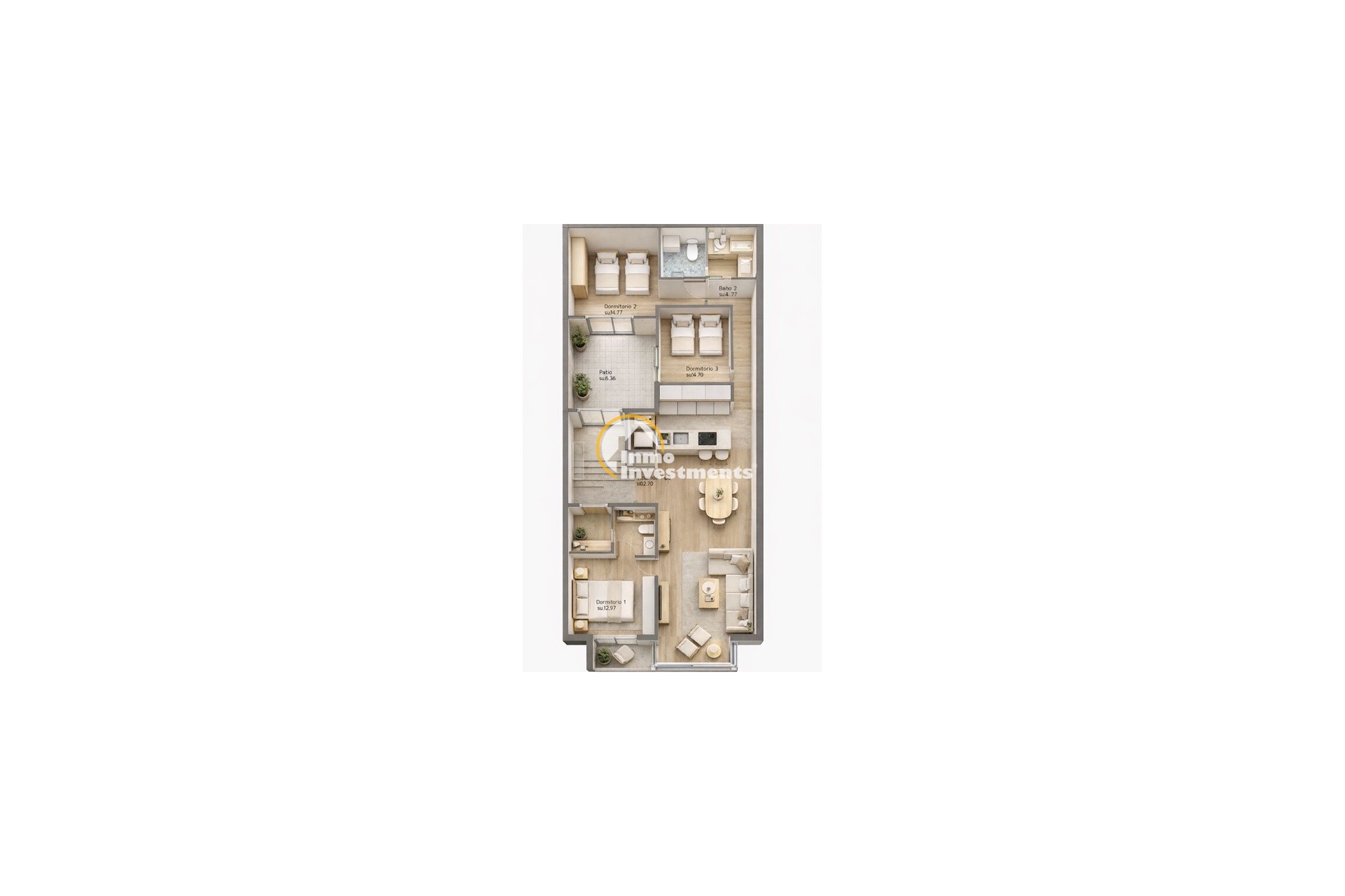 Die Apartments mit drei Schlafzimmern bieten ca. 103.70 m² Wohnfläche und umfassen einen offenen Wohn- und Essbereich mit einer voll ausgestatteten Küche, drei großzügige Schlafzimmer und zwei moderne Badezimmer. Die Immobilien werden mit einer Reihe von Ausstattungsmerkmalen verkauft, darunter eine gepanzerte Eingangstür, eine vollständig eingerichtete Designerküche mit integrierten Geräten, motorisierte Rollläden, hocheffiziente Warm- und Kaltklimaanlage sowie Designer-LED-Beleuchtung.