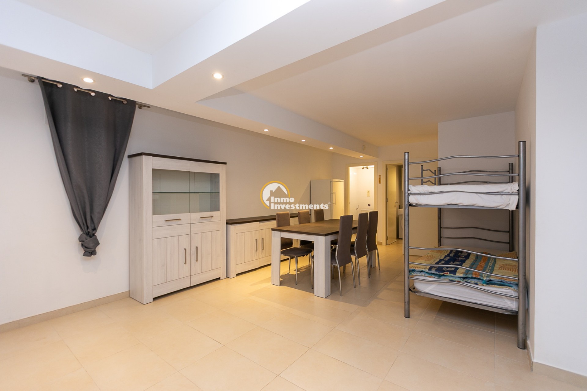 El acceso principal se realiza por una pequeña escalera que conduce a un porche acristalado, ideal como zona de estar adicional. En la planta principal encontramos un luminoso salón-comedor, una cocina totalmente equipada con electrodomésticos, un primer dormitorio con aire acondicionado y un baño con ducha y ventana al exterior.