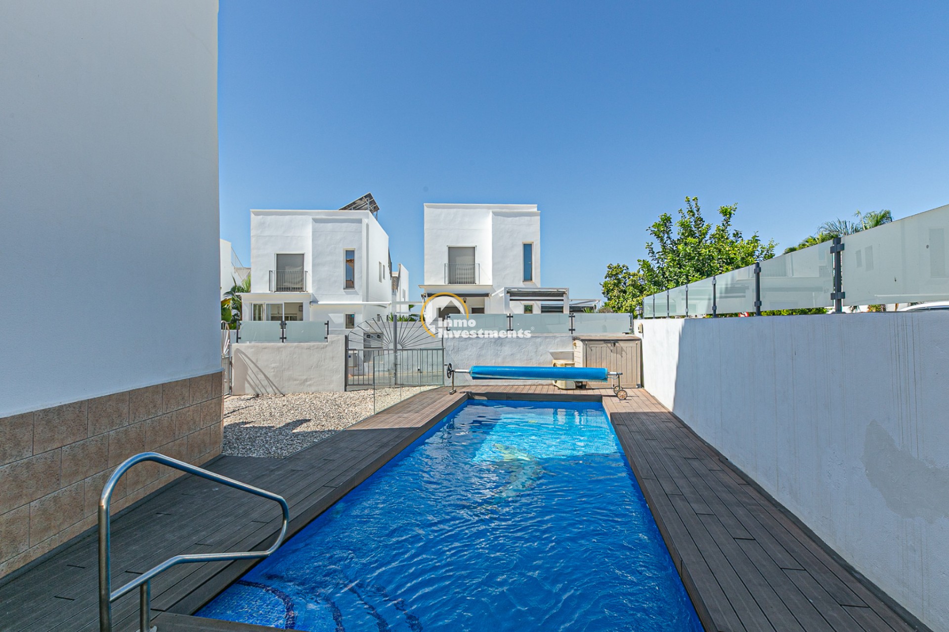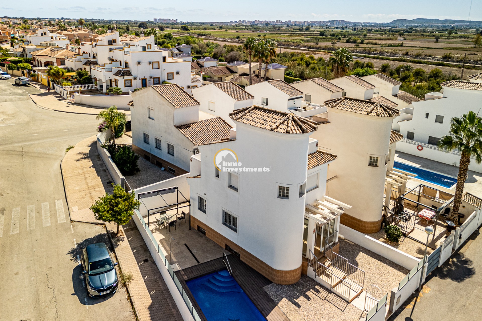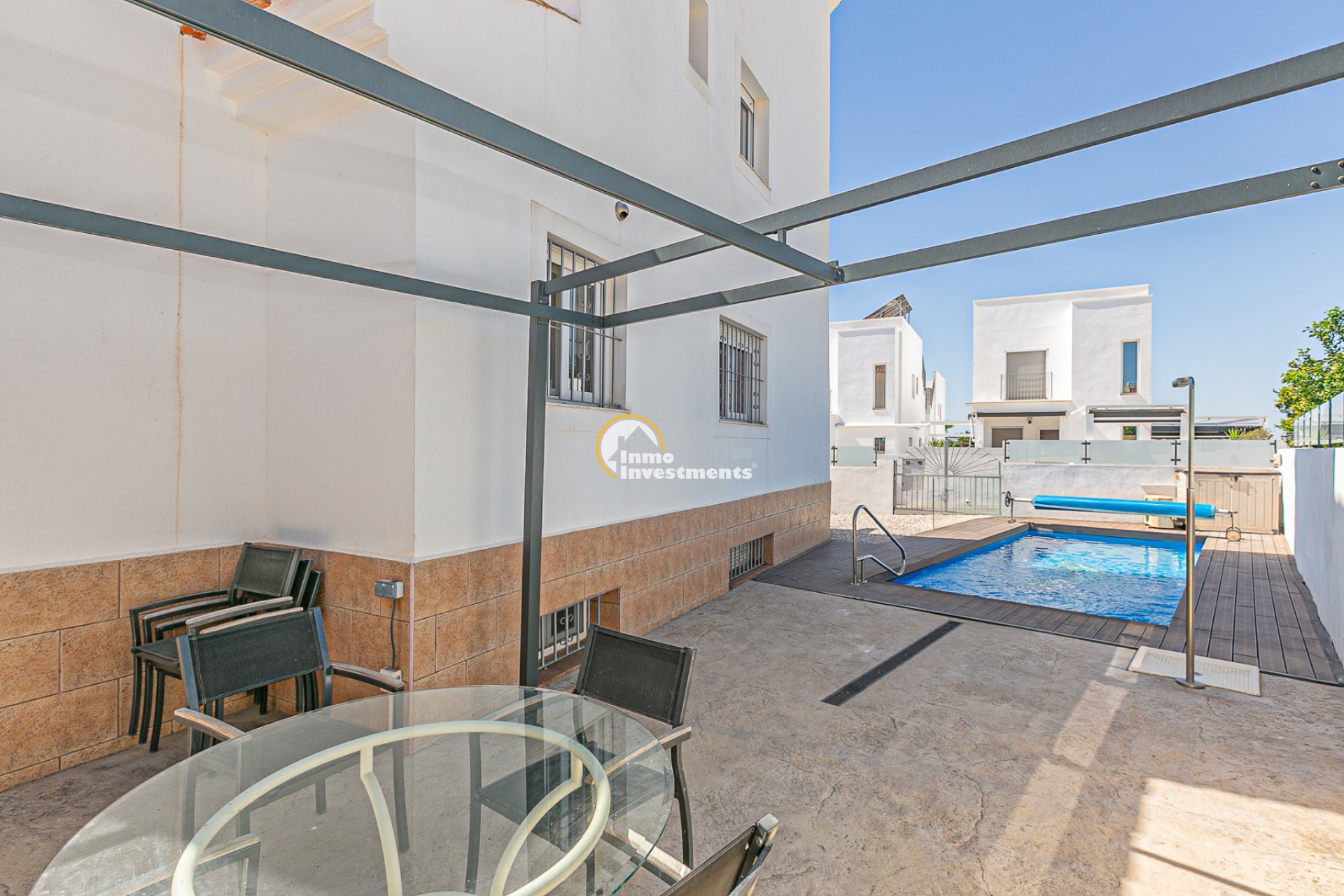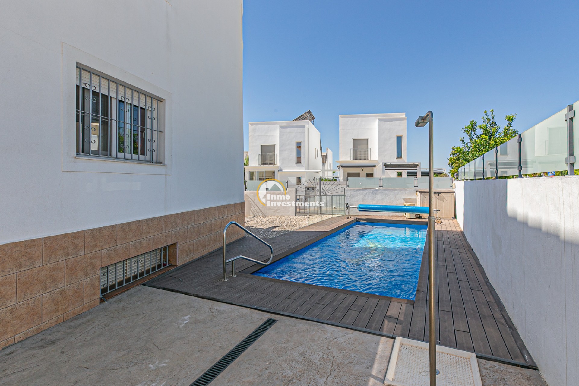 La vivienda cuenta con una superficie construida de 143,30 m² sobre una parcela en esquina de 245,40 m², totalmente independiente. En el exterior dispone de una piscina privada climatizada con bomba de calor y cubierta de lámina, además de acceso a una piscina comunitaria. La parcela, de fácil mantenimiento, convierte este hogar en la opción perfecta para disfrutar del clima mediterráneo.