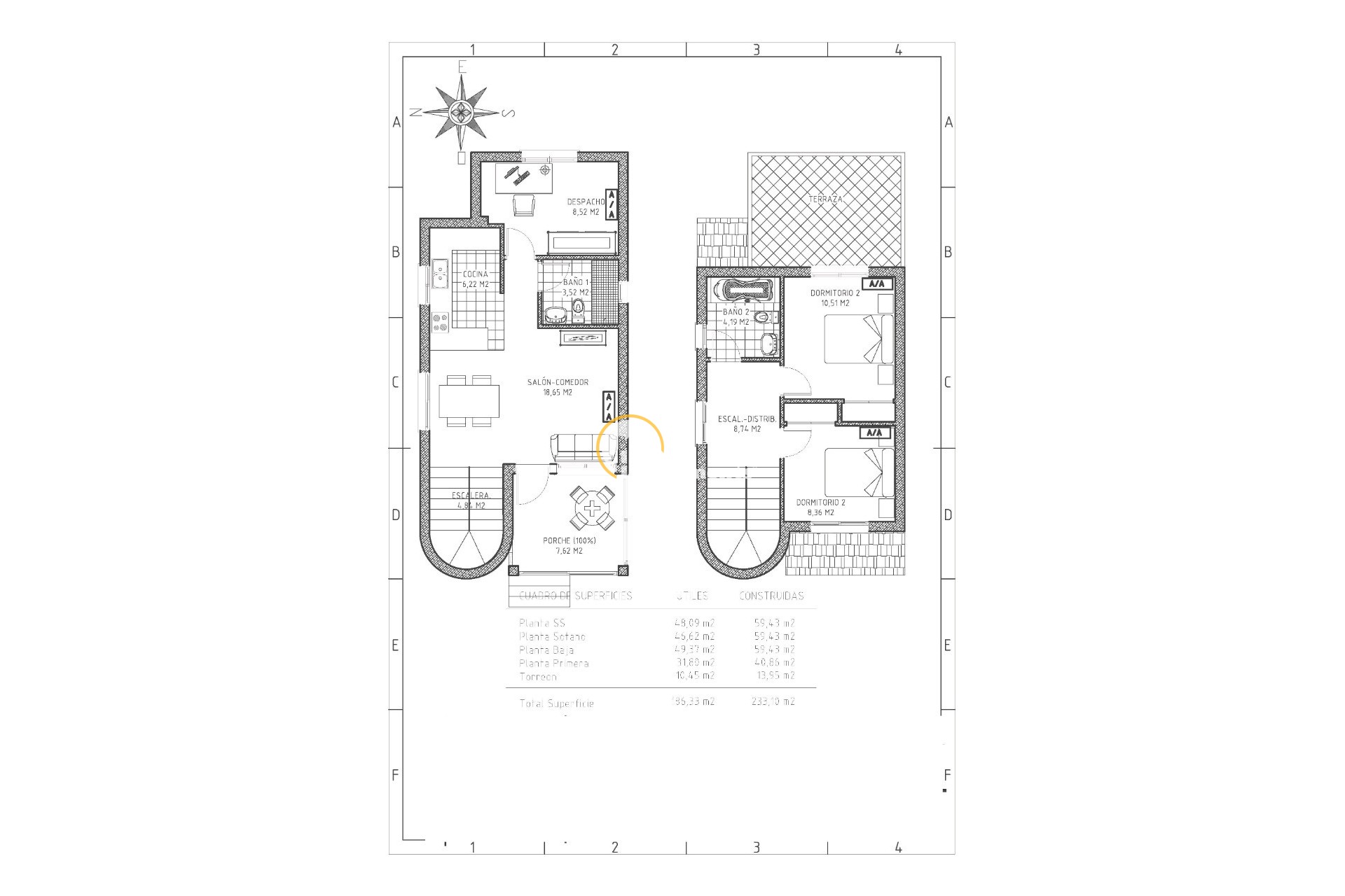 En la planta superior se ubican dos dormitorios más, ambos con armarios empotrados y aire acondicionado; uno de ellos con acceso a una terraza. También hay un baño completo con ducha y, en la última planta, un solárium con vistas abiertas.