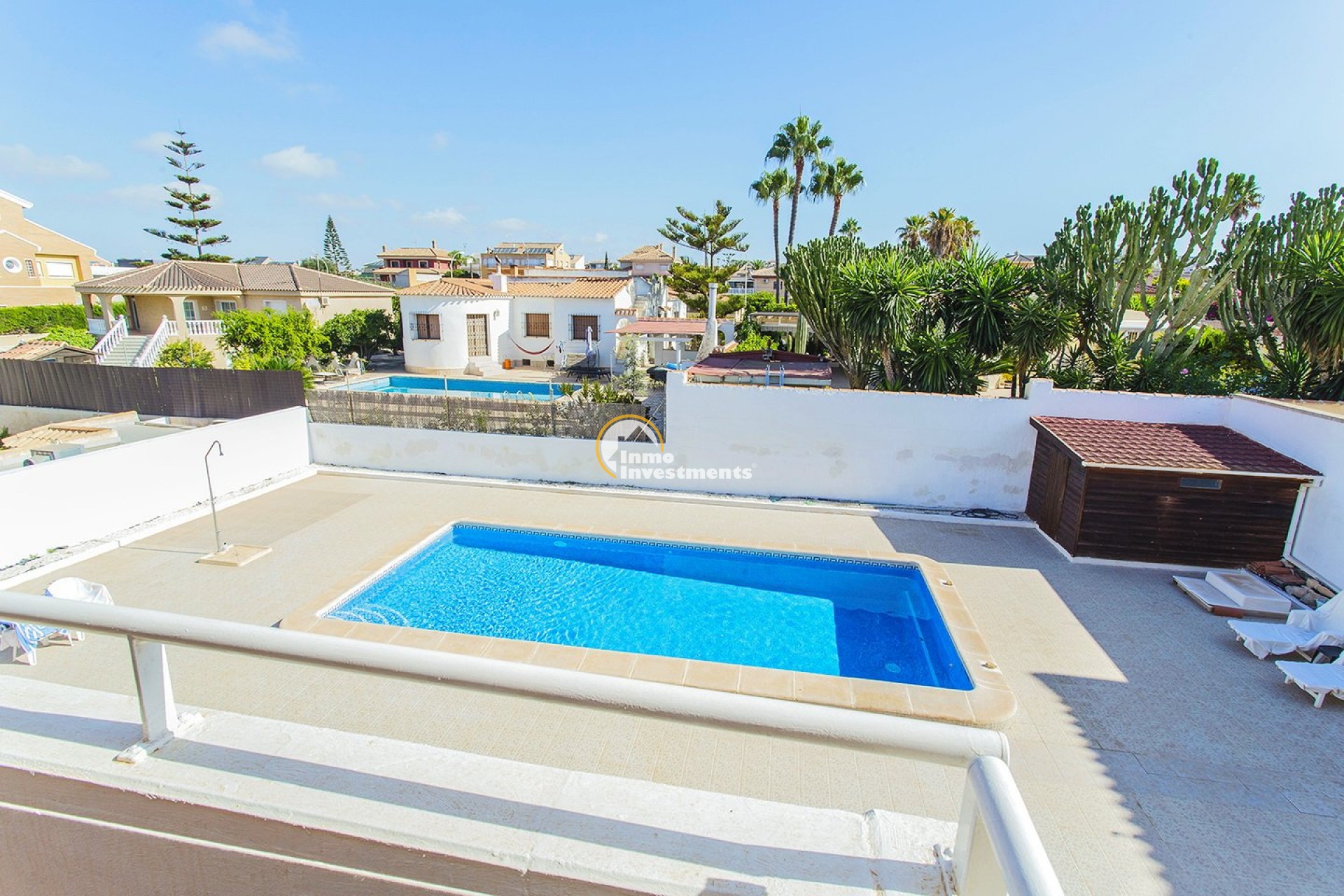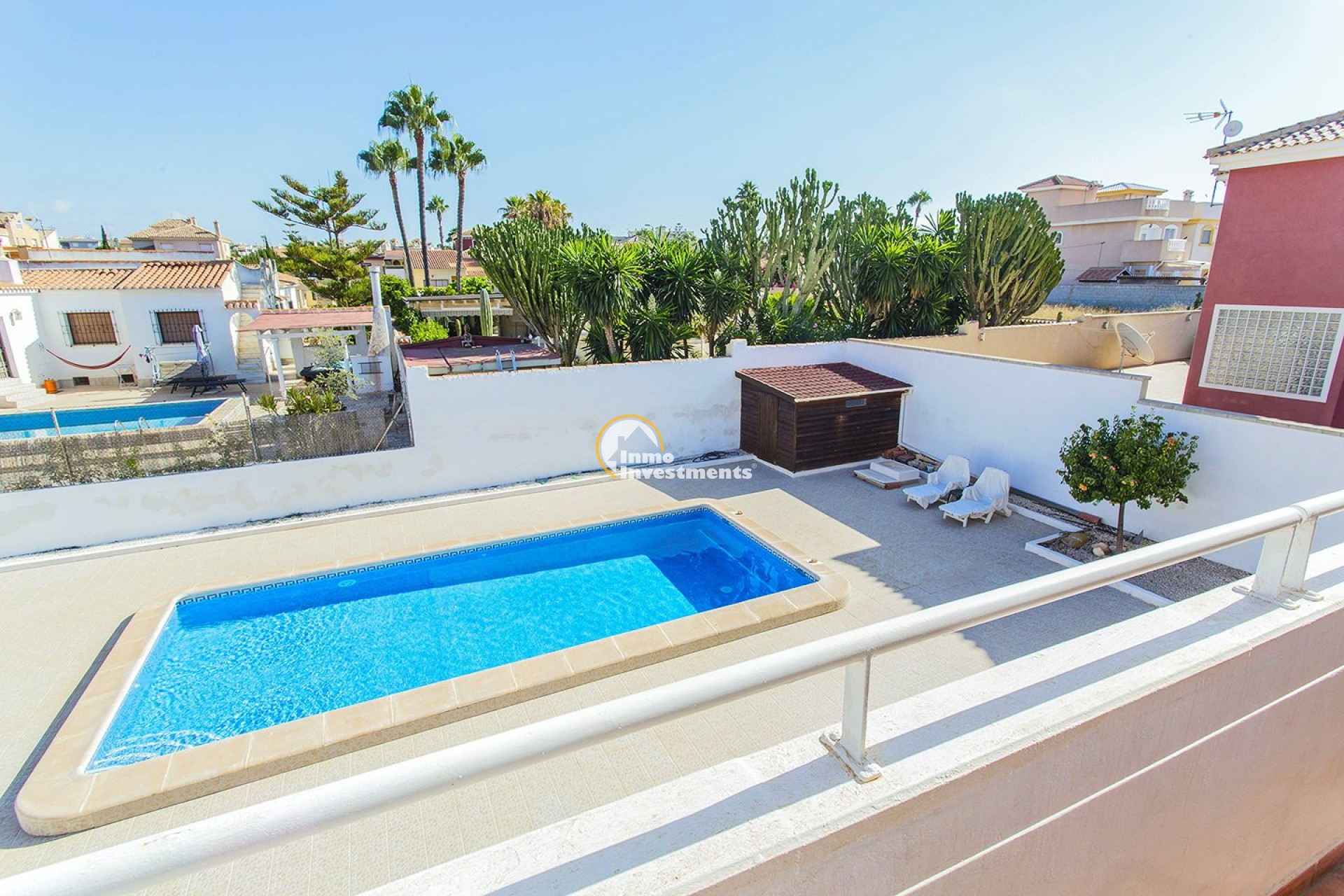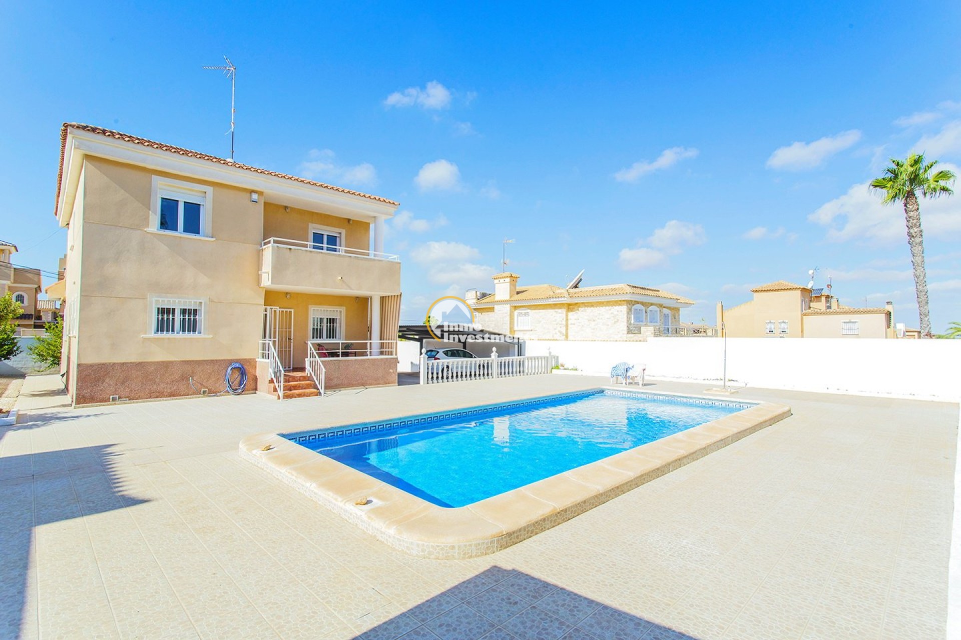Se vende Chalet soleado con piscina y parking para 5 coches en Aguas Nuevas, Torrevieja. Chalet de 220 m2 esta distribuido de la siguiente manera, en la primera planta se encuentra el salón-comedor amplio con un porche de unos 20 m2, cocina equipada independiente con una galería y con salida a una terraza abierta con vistas a la piscina, un dormitorio con armario empotrado, un baño completo con plato de la ducha. En la segunda planta se encuentran cuatro dormitorios con armarios empotrados. Todos los dormitorios tienen balcón con diferentes orientaciones. También uno de los cuartos tiene baño suite. Superficie de la parcela unos 816 m2. En la parcela alrededor de la casa hay una piscina privada con zona de barbacoas y arboles plantados. Chalet está ubicado al lado de todos los servicios tales como tiendas, cafeterías, restaurantes, farmacia y supermercados.
