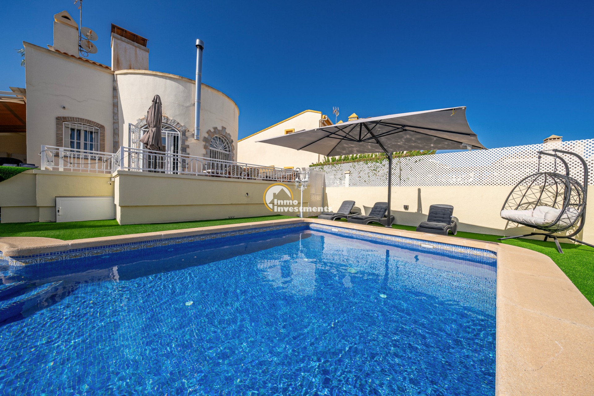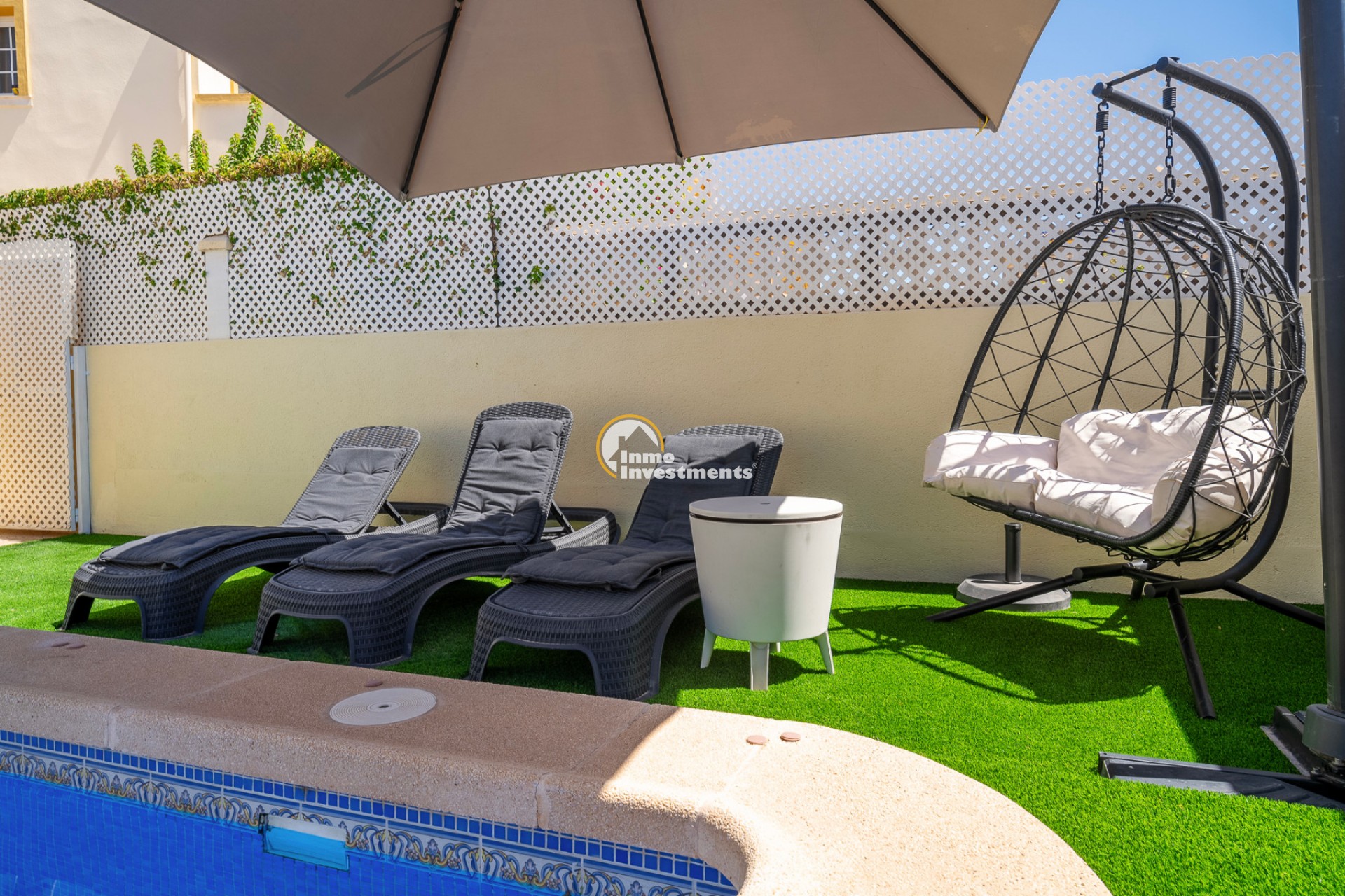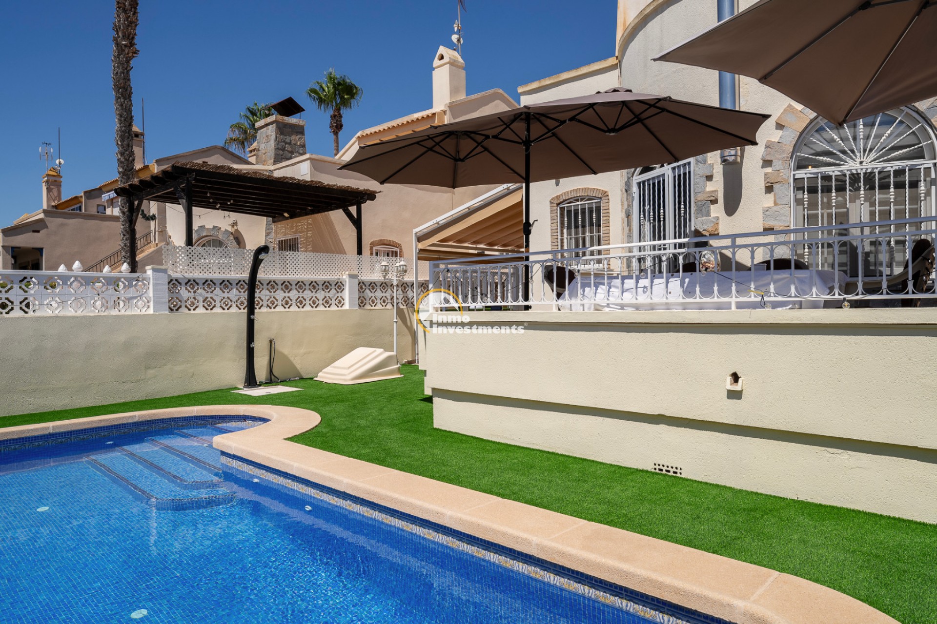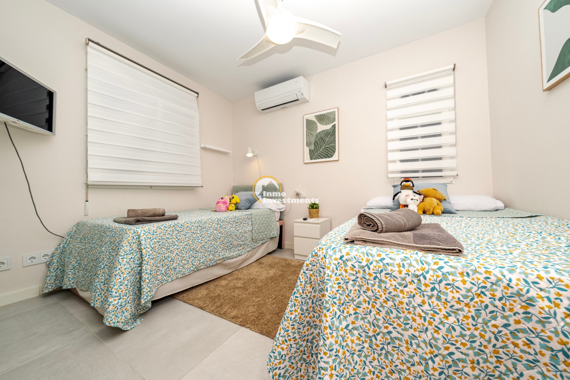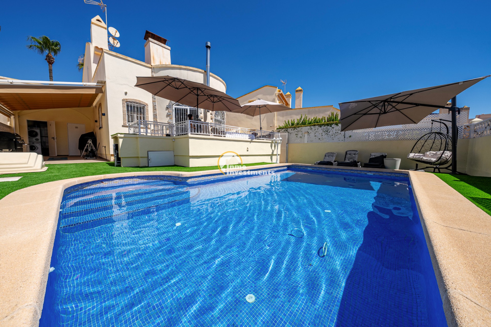 En el interior, la villa ofrece 74 m² de espacio habitable bien distribuido. Dispone de dos dormitorios dobles y dos baños modernos, lo que la hace adecuada para parejas, familias pequeñas o dos parejas compartiendo. La propiedad está amueblada y lista para su uso. Un lavadero y un trastero independiente aportan una funcionalidad adicional, especialmente para estancias más largas o para guardar equipamiento de playa, bicicletas o palos de golf.