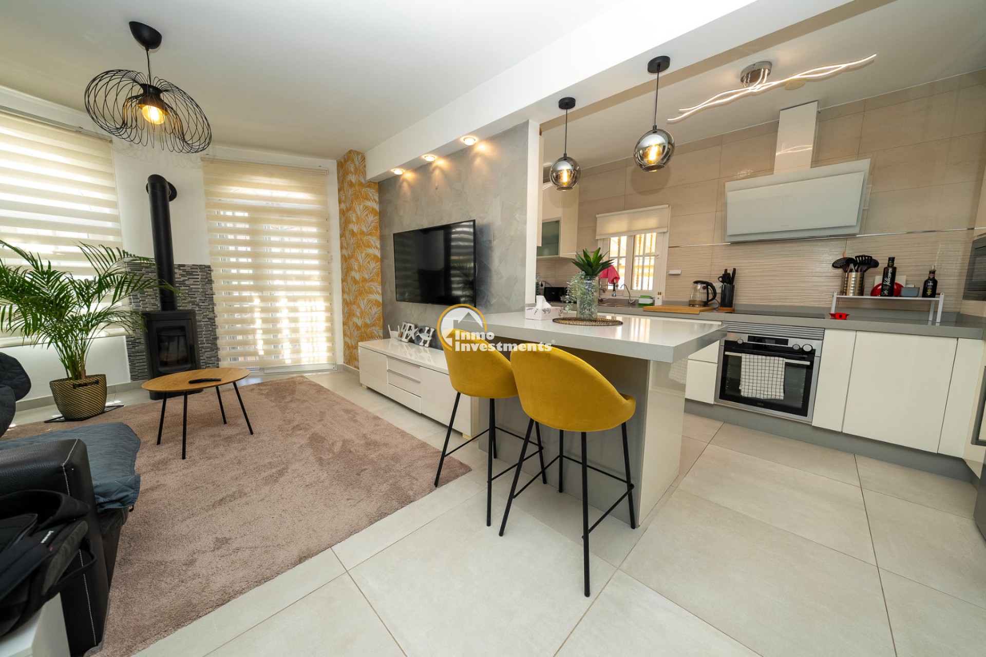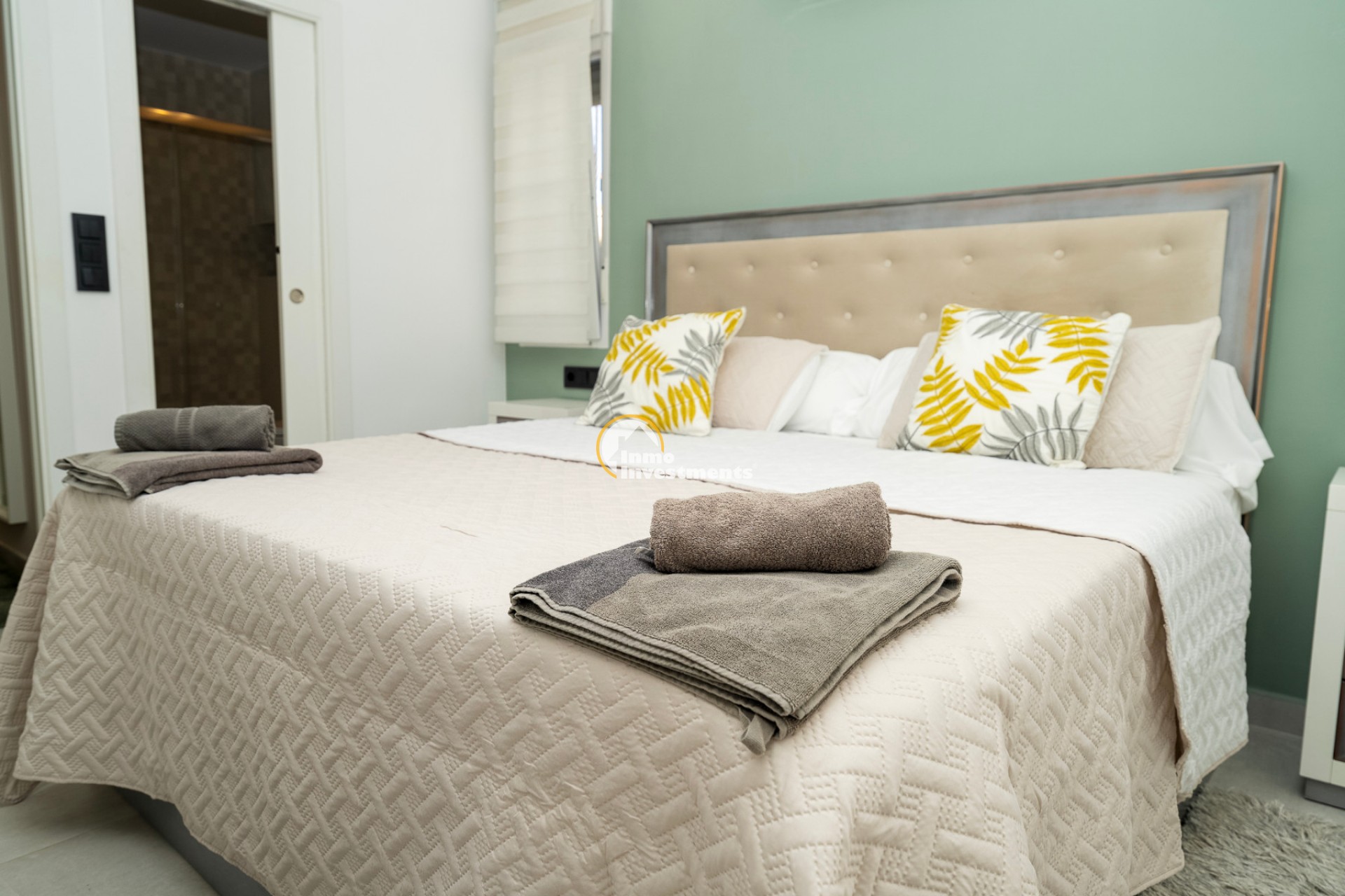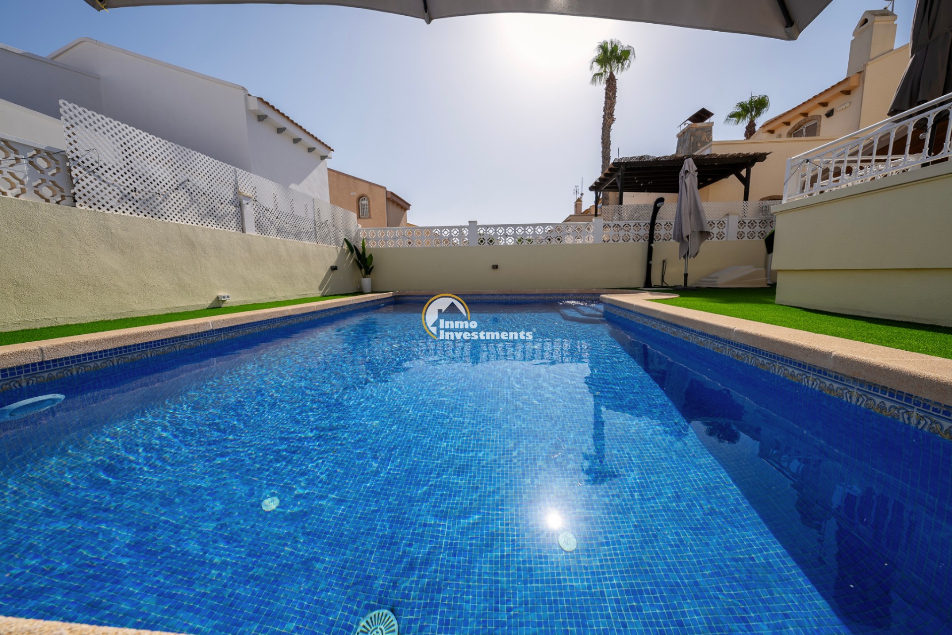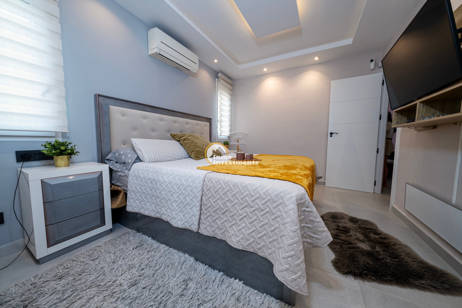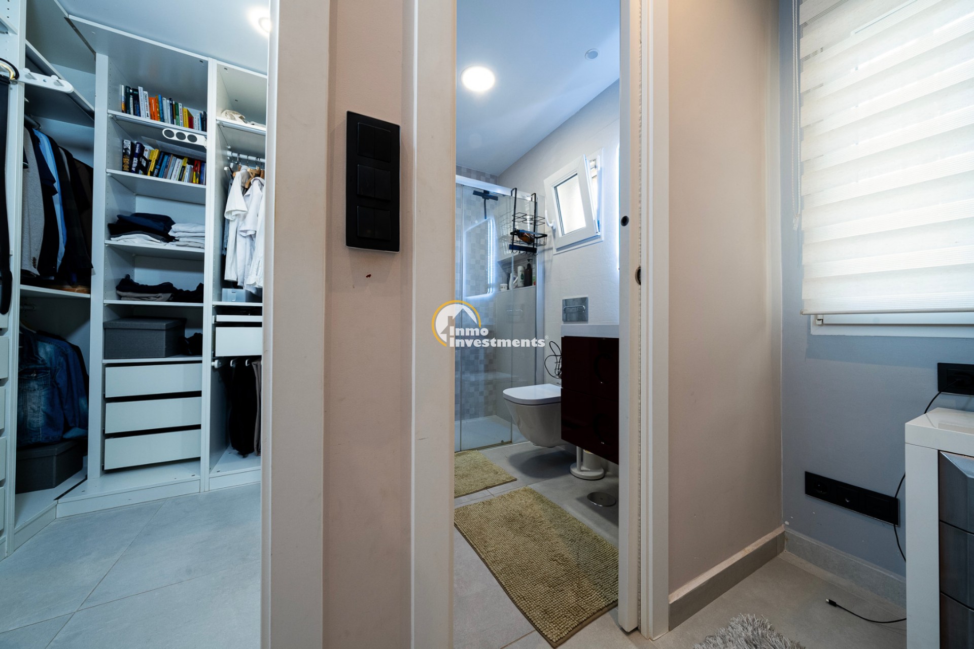 En el interior, la villa ofrece 74 m² de espacio habitable bien distribuido. Dispone de dos dormitorios dobles y dos baños modernos, lo que la hace adecuada para parejas, familias pequeñas o dos parejas compartiendo. La propiedad está amueblada y lista para su uso. Un lavadero y un trastero independiente aportan una funcionalidad adicional, especialmente para estancias más largas o para guardar equipamiento de playa, bicicletas o palos de golf.
