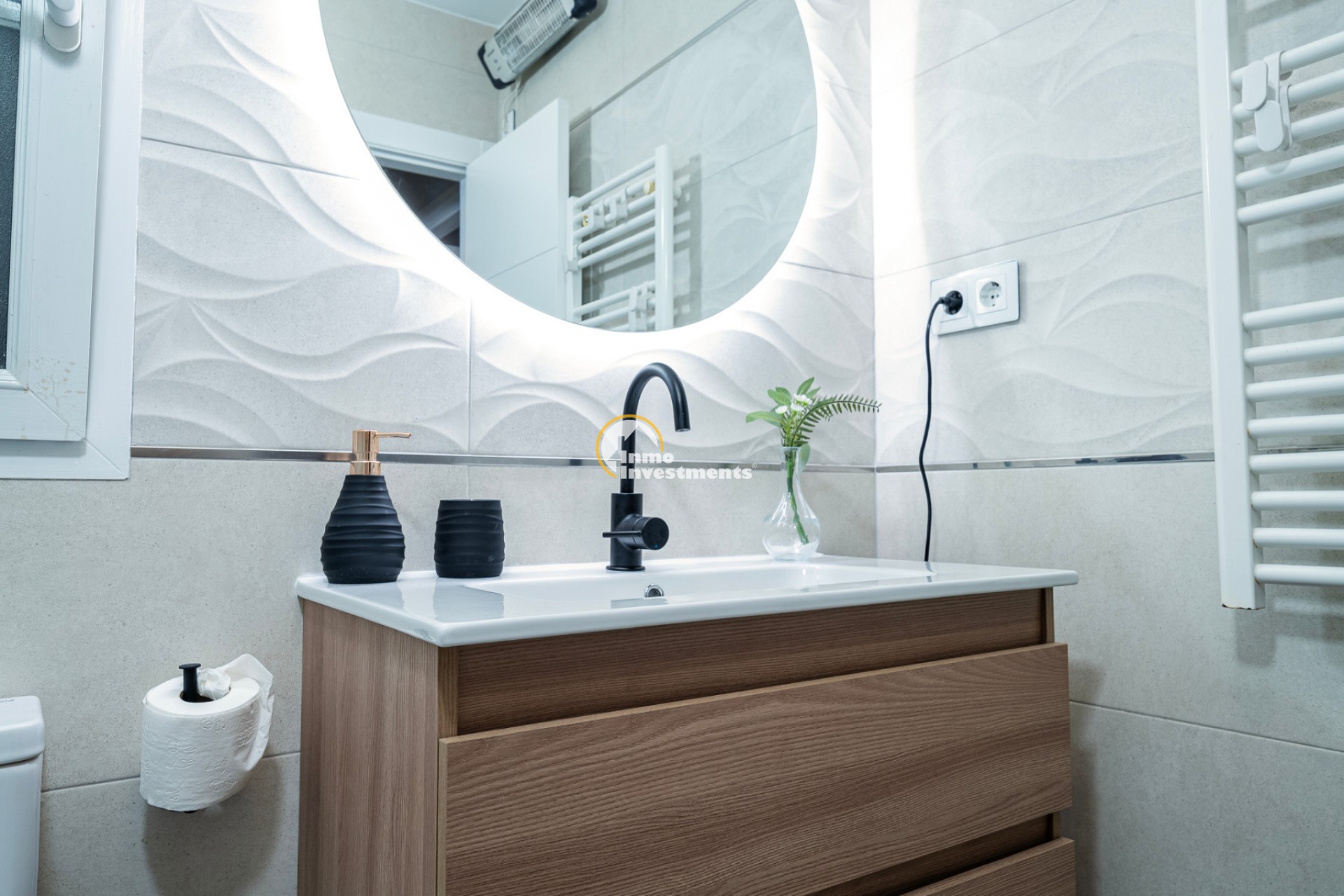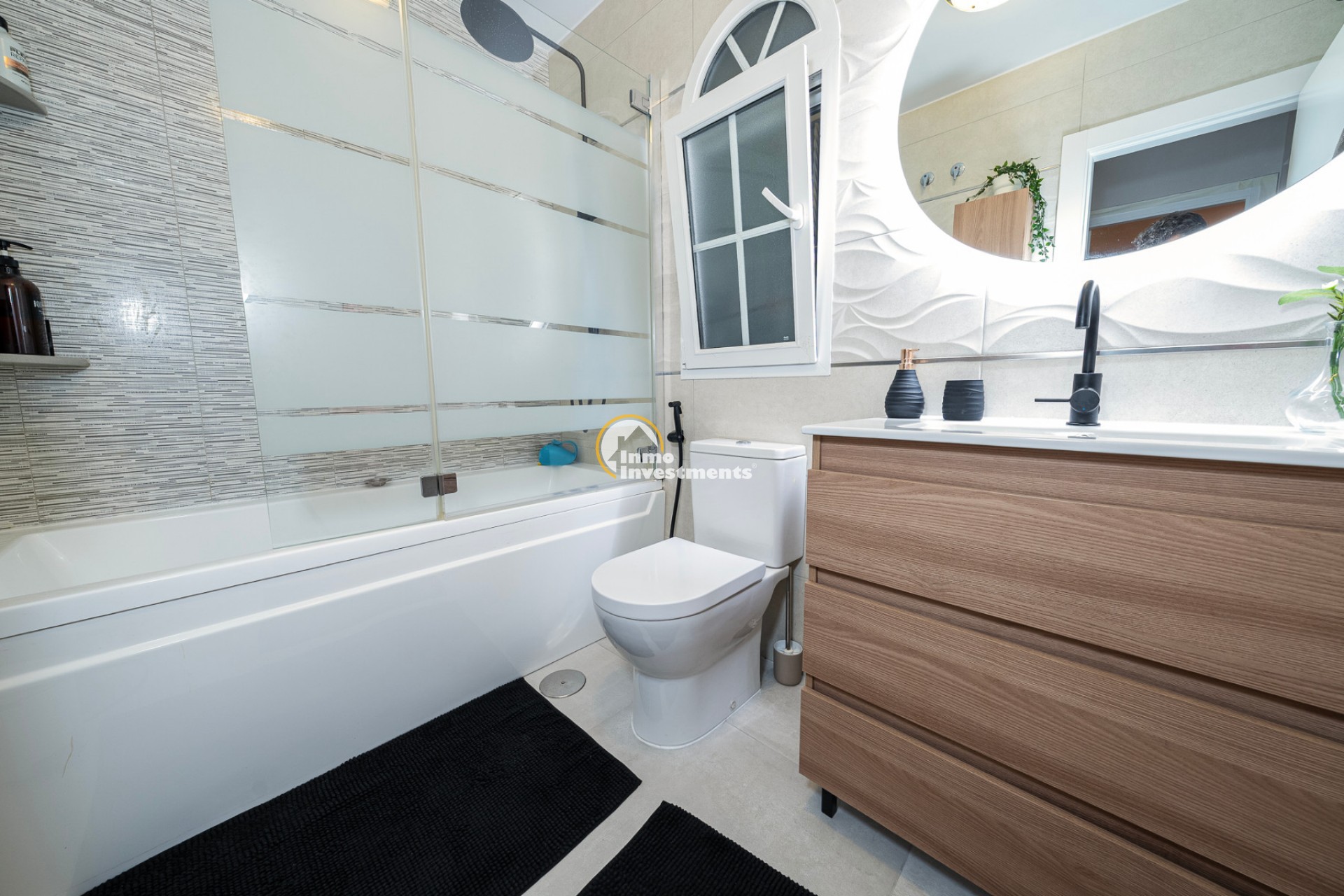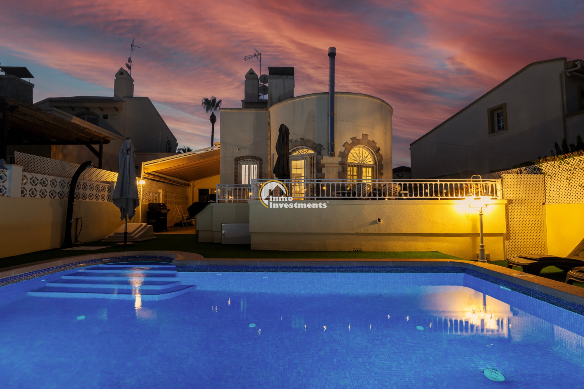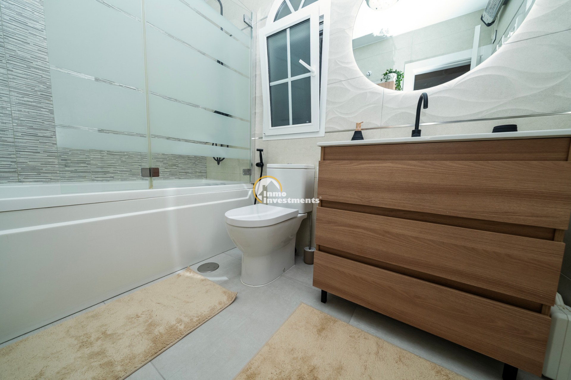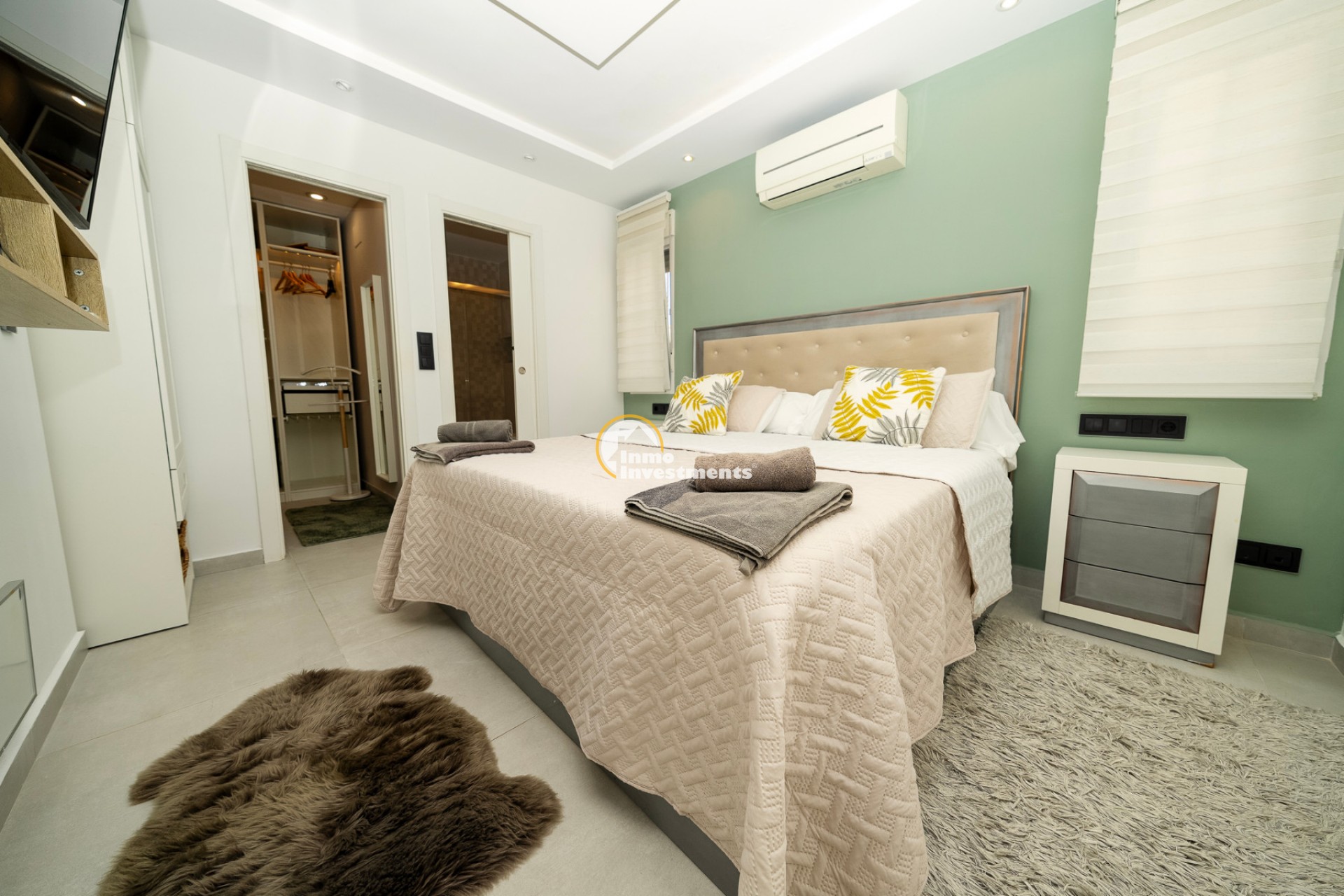 En el interior, la villa ofrece 74 m² de espacio habitable bien distribuido. Dispone de dos dormitorios dobles y dos baños modernos, lo que la hace adecuada para parejas, familias pequeñas o dos parejas compartiendo. La propiedad está amueblada y lista para su uso. Un lavadero y un trastero independiente aportan una funcionalidad adicional, especialmente para estancias más largas o para guardar equipamiento de playa, bicicletas o palos de golf.