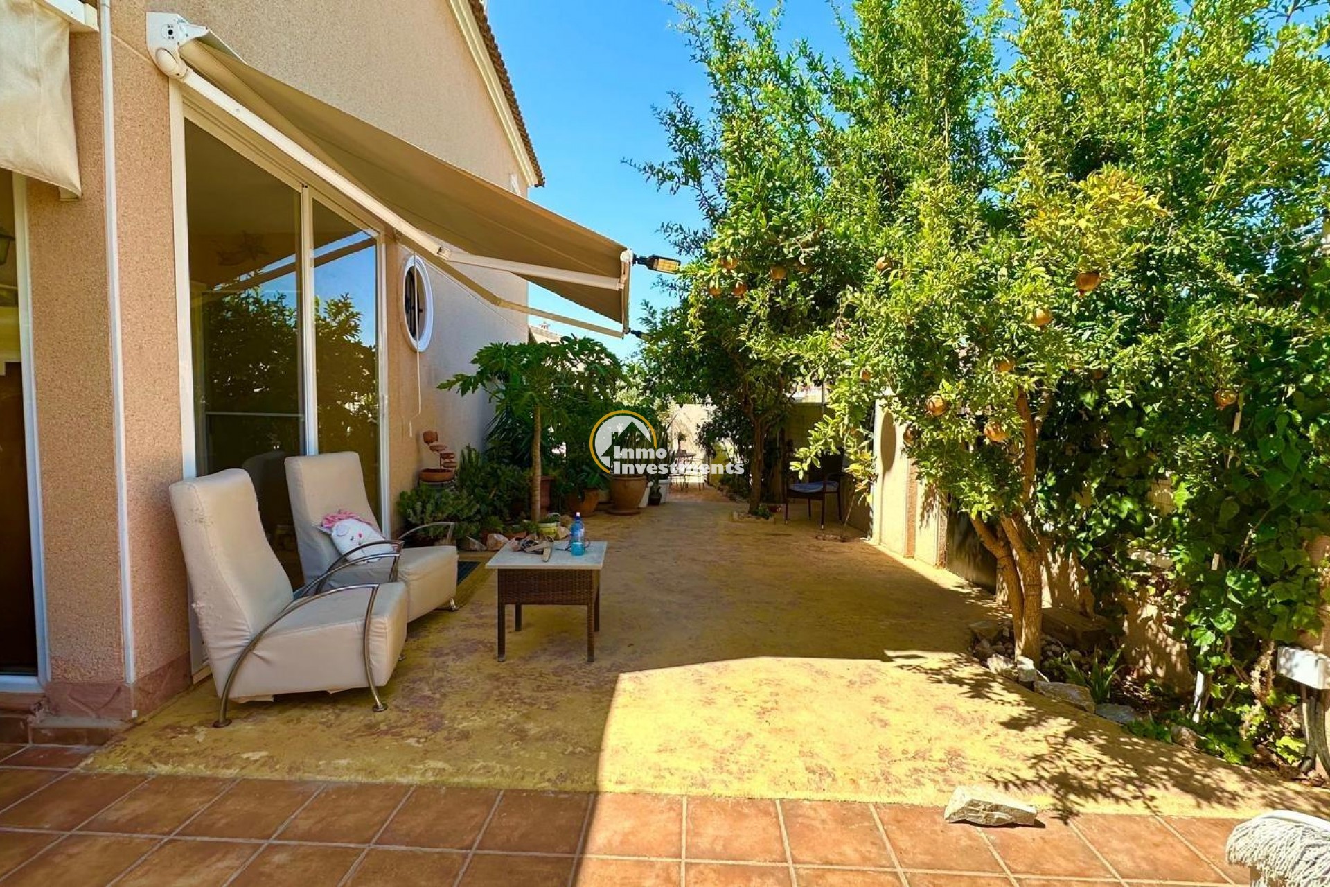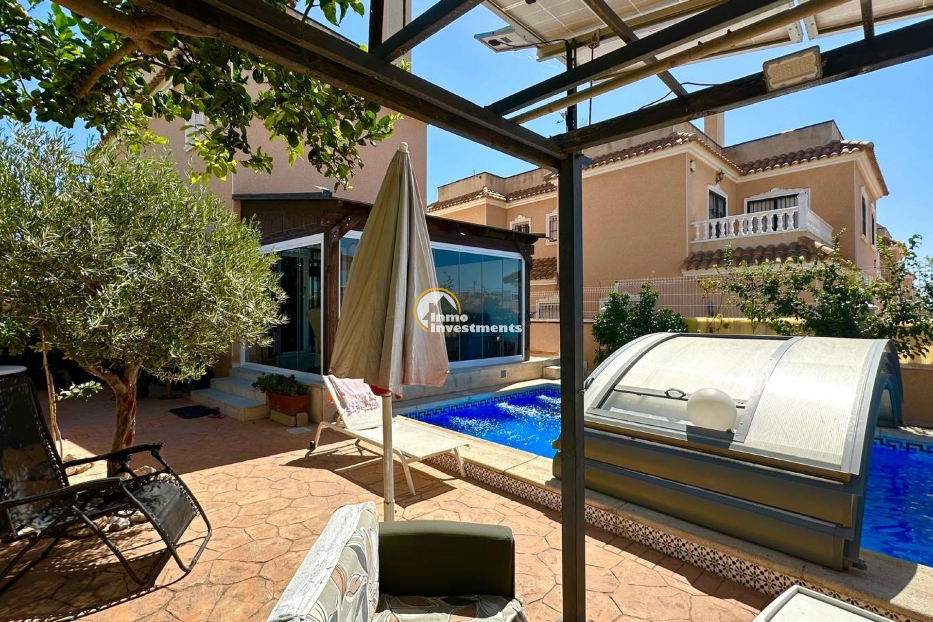 ~Chalet Independiente en Esquina con Piscina Propia y Solárium – A tan solo 1 km del mar~~Te presentamos esta magnífica propiedad situada en una exclusiva urbanización residencial a tan solo un kilómetro de la costa. Se trata de un chalet independiente en esquina que ofrece privacidad, confort y una excelente calidad de vida tanto para residencia habitual como para segunda vivienda cerca del mar.~~Distribución y espacios exteriores~~Con una parcela de 200 m2 y 119 m2 construidos, esta vivienda se distribuye en tres plantas que maximizan el espacio y la funcionalidad. La propiedad cuenta con acceso para vehículo y aparcamiento dentro de la parcela, así como con su propia piscina privada, todo rodeado por un jardín bien mantenido y zonas de terraza ideales para disfrutar del aire libre.~~Además, forma parte de una urbanización que ofrece también piscina comunitaria, brindando más opciones de ocio sin salir del entorno.~~Primera planta: zonas comunes y confort~~Al acceder a la vivienda nos recibe un hall acristalado que aporta luminosidad y amplitud desde el primer momento. En esta planta se encuentra un moderno cuarto de baño completo, una cocina independiente de diseño actual, completamente equipada con electrodomésticos de calidad, una despensa adicional y un salón comedor amplio y luminoso. Desde el salón se accede a una terraza acristalada con vistas directas a la piscina privada y al jardín, creando un ambiente perfecto para reuniones familiares o momentos de relax.~~Segunda planta: zona de descanso~~En la planta superior encontramos tres habitaciones dobles, todas con armarios empotrados. La habitación principal cuenta con su propio cuarto de baño en suite, garantizando intimidad y comodidad. Además, hay un segundo baño completo que da servicio al resto de habitaciones.~~Tercera planta: solárium y trastero~~La tercera planta alberga un práctico trastero y un amplio solárium privado, ideal para tomar el sol, colocar una zona chill-out o incluso un pequeño huerto urbano. Desde aquí se pueden disfrutar de vistas despejadas y un entorno tranquilo.~~Extras y eficiencia energética~~La vivienda está equipada con aire acondicionado en todas las estancias para asegurar el máximo confort durante todo el año. Además, dispone de placas solares ya instaladas, lo que contribuye a un consumo energético más eficiente, reduciendo significativamente los costes eléctricos y promoviendo un estilo de vida más sostenible.~~Resumen de características:~~Chalet independiente en esquina~~Parcela de 200 m2~~119 m2 construidos~~Piscina privada y piscina comunitaria~~3 plantas~~3 habitaciones con armarios empotrados~~3 baños (1 en suite)~~Cocina independiente equipada~~Salón comedor + terraza acristalada~~Trastero y solárium privado~~Aire acondicionado en todas las estancias~~Placas solares para autoconsumo~~Parking dentro de la parcela~~A solo 1 km del mar~~Una vivienda perfecta para quienes buscan espacio, privacidad y un entorno tranquilo con todos los servicios cerca y el mar a solo unos minutos.~~¿Te gustaría agendar una visita o recibir más información? Estamos a tu disposición.