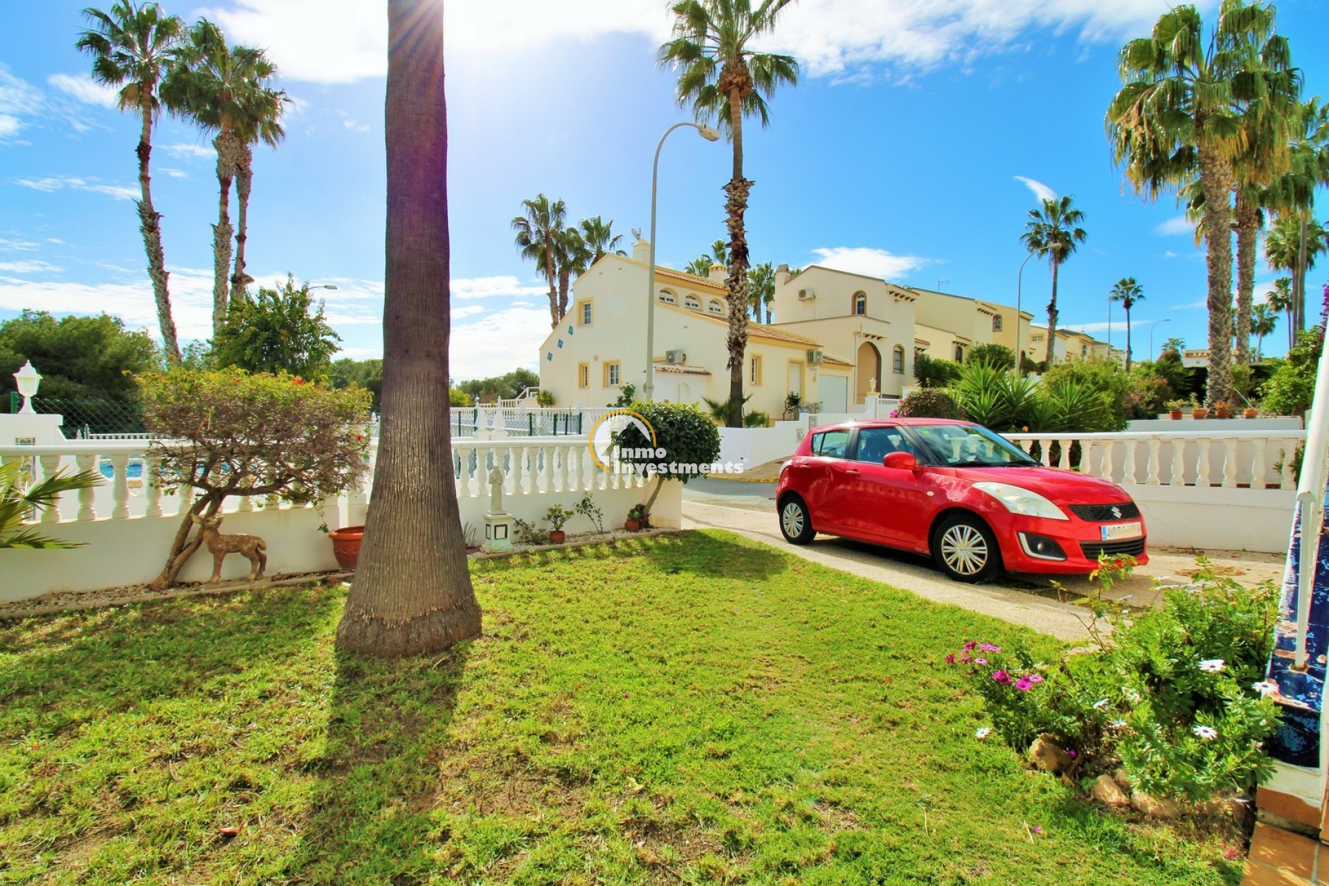 La propriété dispose d’un jardin entourant l’avant et l’arrière avec parking privé, ainsi qu’une terrasse surélevée offrant une vue dégagée sur la piscine, idéale pour profiter de l’extérieur.