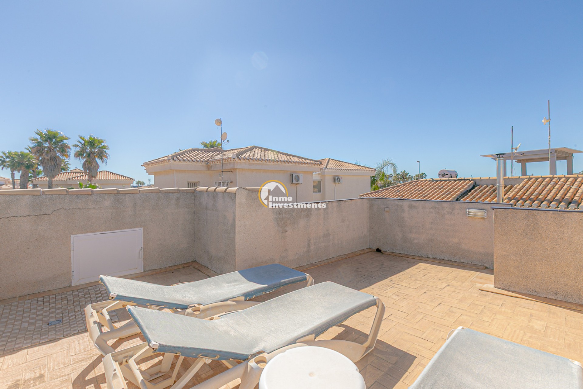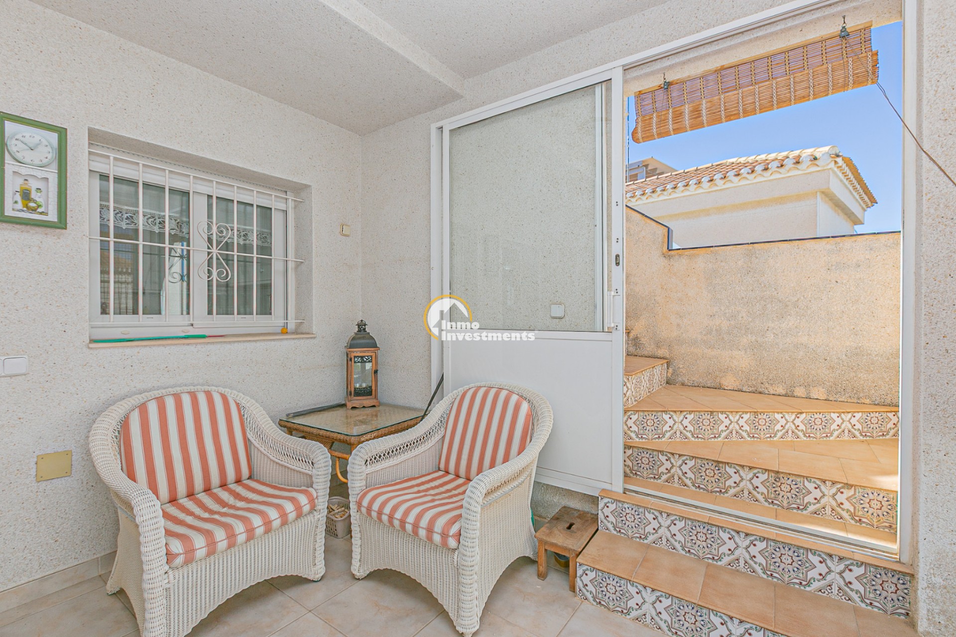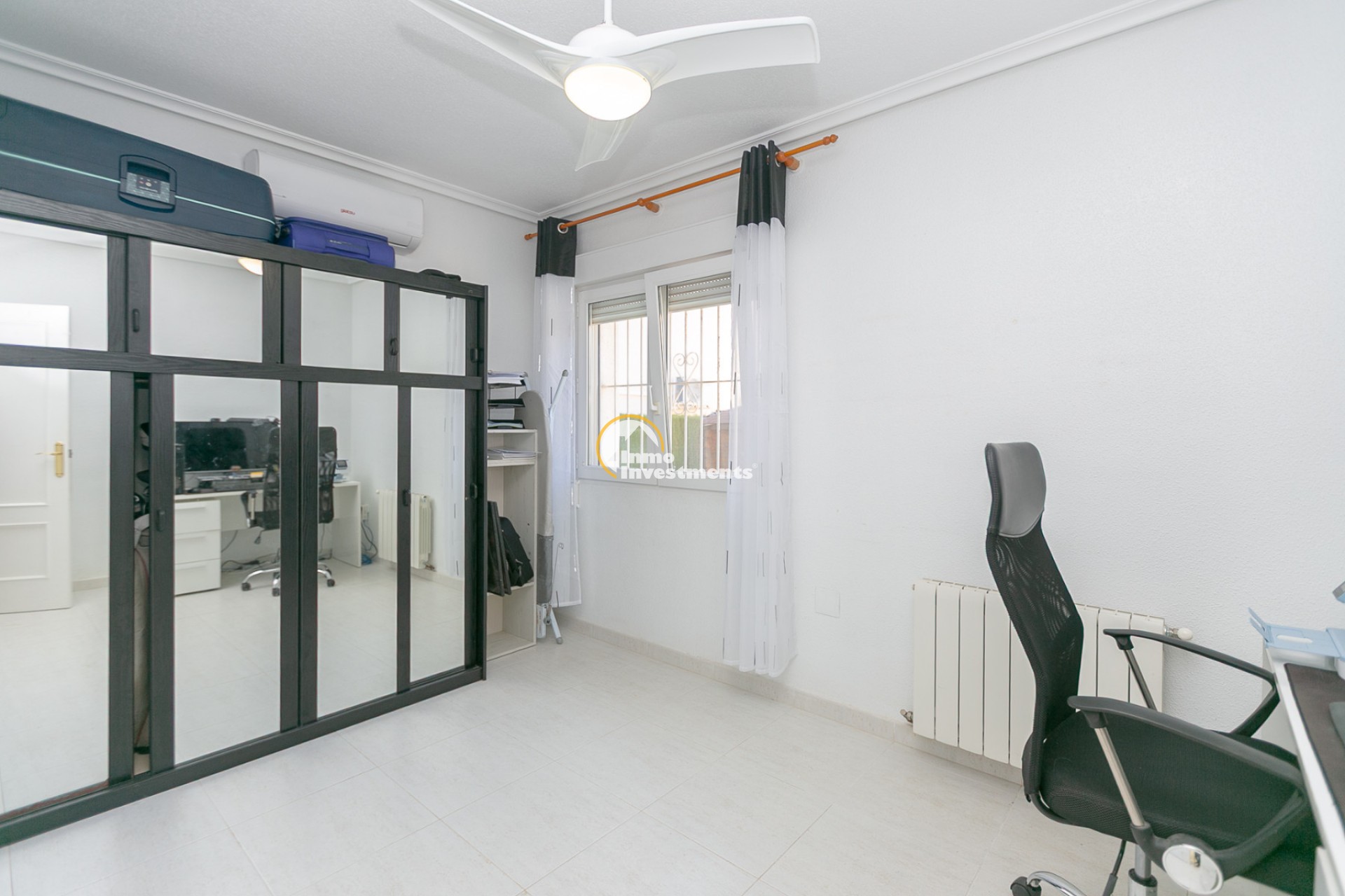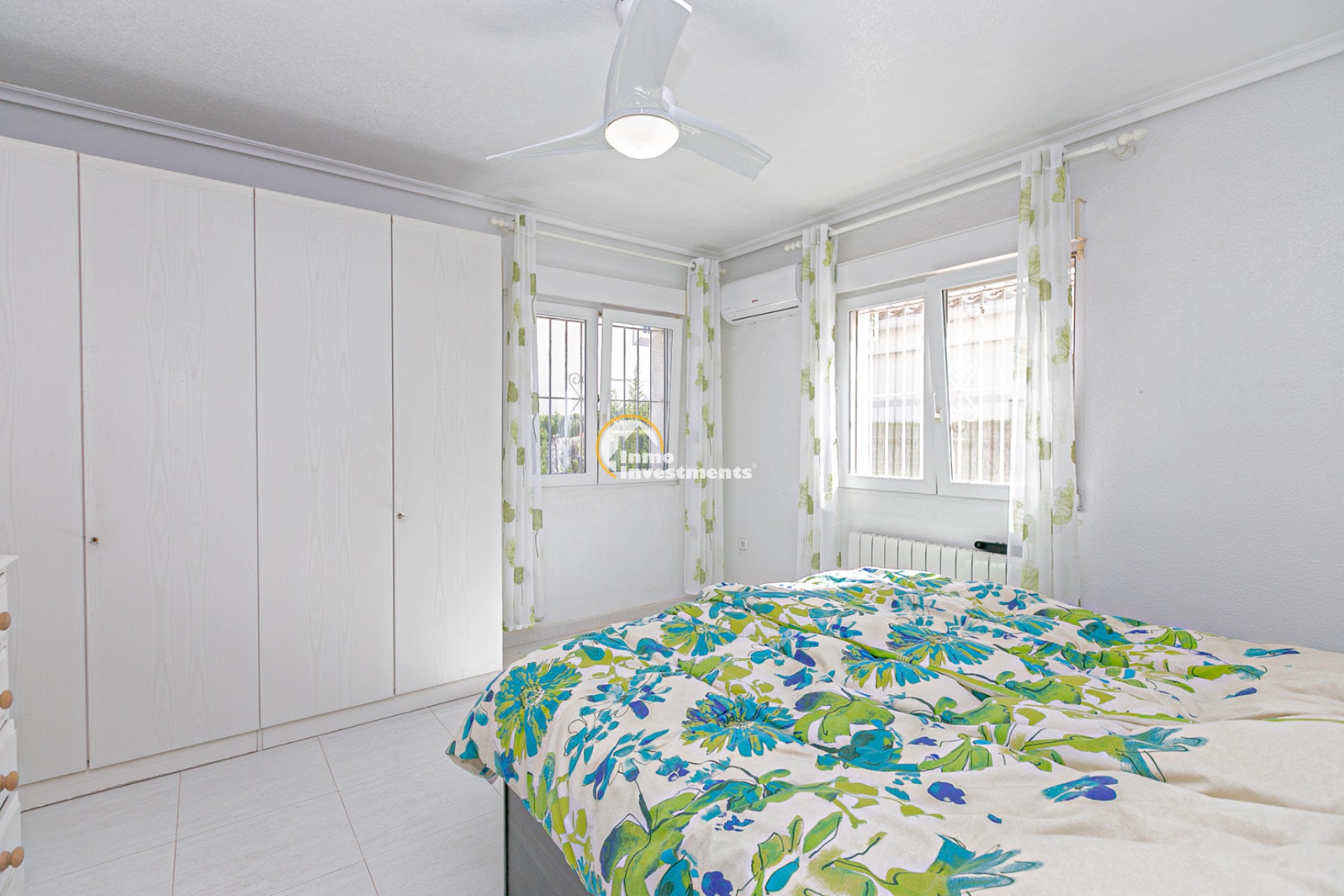 Au rez-de-chaussée, vous trouverez un salon lumineux avec climatisation et ventilateur de plafond, ainsi qu’une salle à manger confortable. La maison comprend deux chambres avec climatisation et ventilateurs, ainsi qu’une salle de bain avec douche à l’italienne.