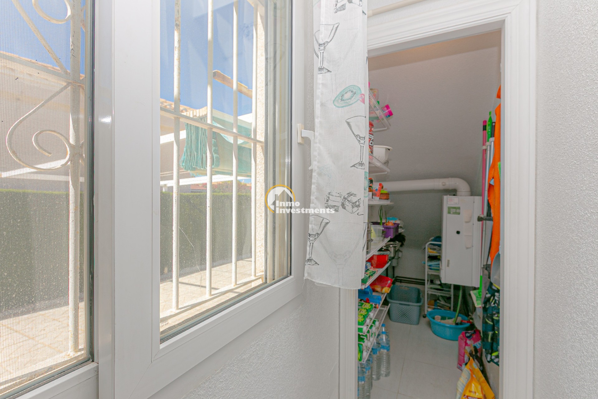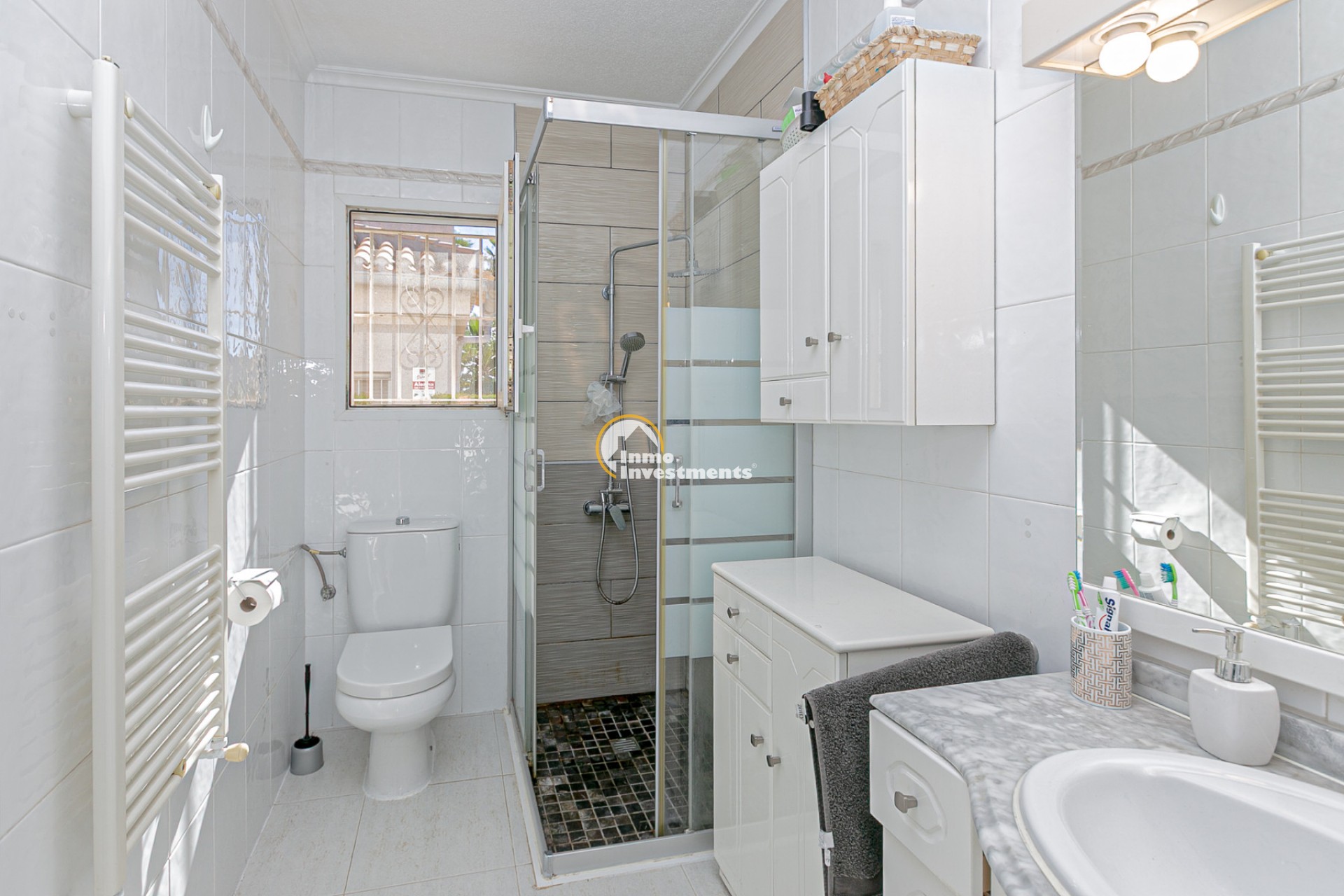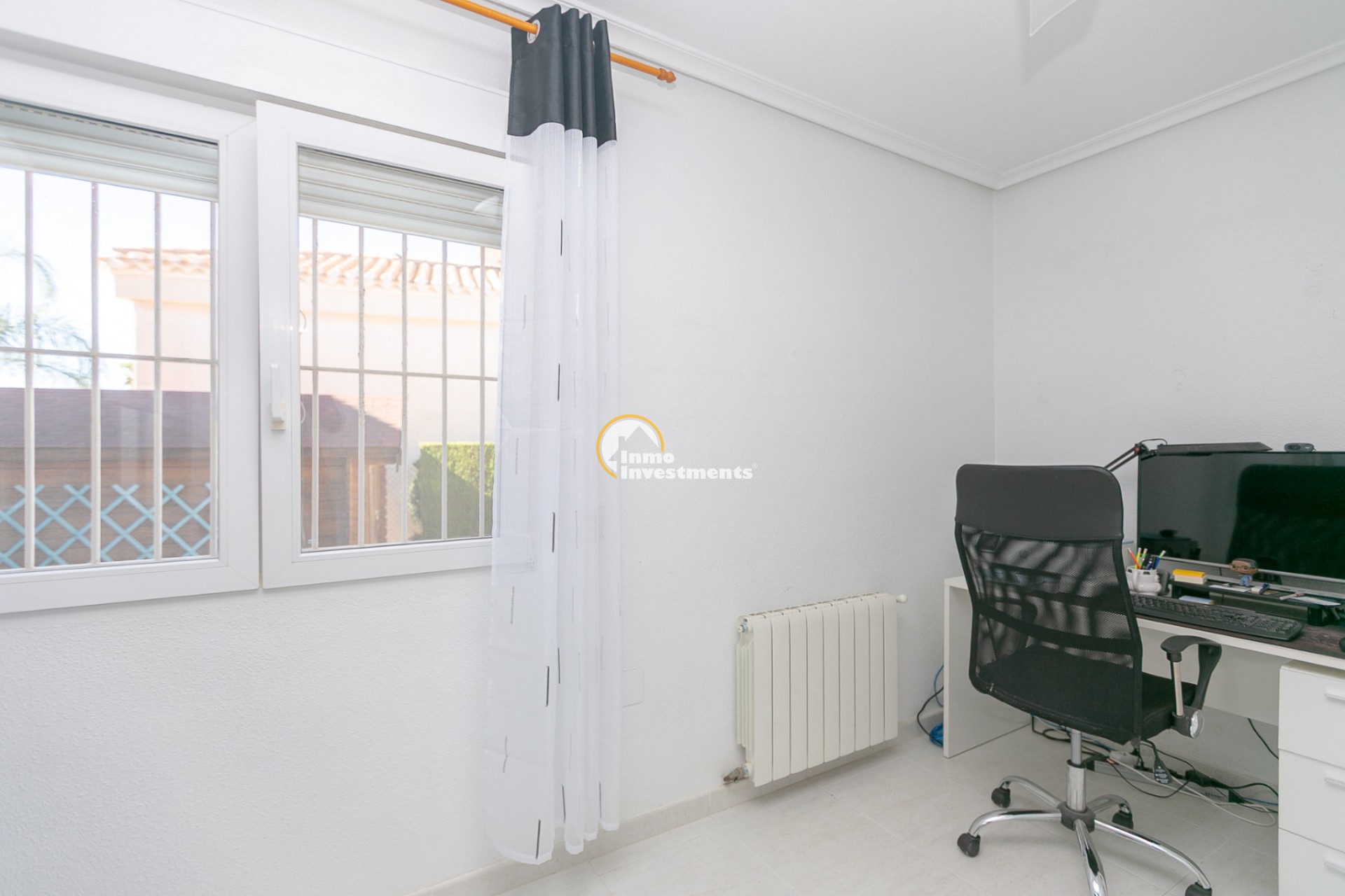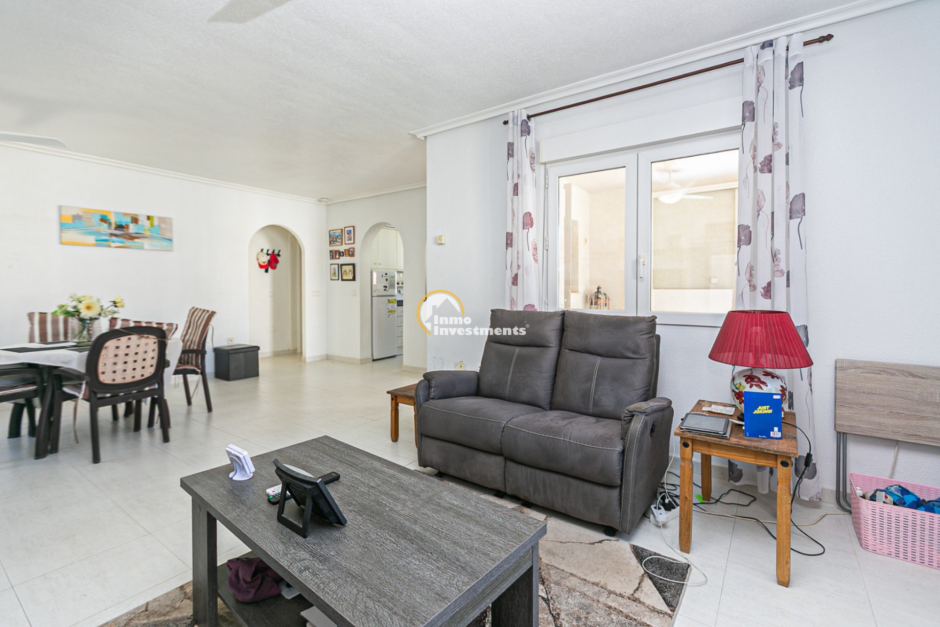 Au rez-de-chaussée, vous trouverez un salon lumineux avec climatisation et ventilateur de plafond, ainsi qu’une salle à manger confortable. La maison comprend deux chambres avec climatisation et ventilateurs, ainsi qu’une salle de bain avec douche à l’italienne.