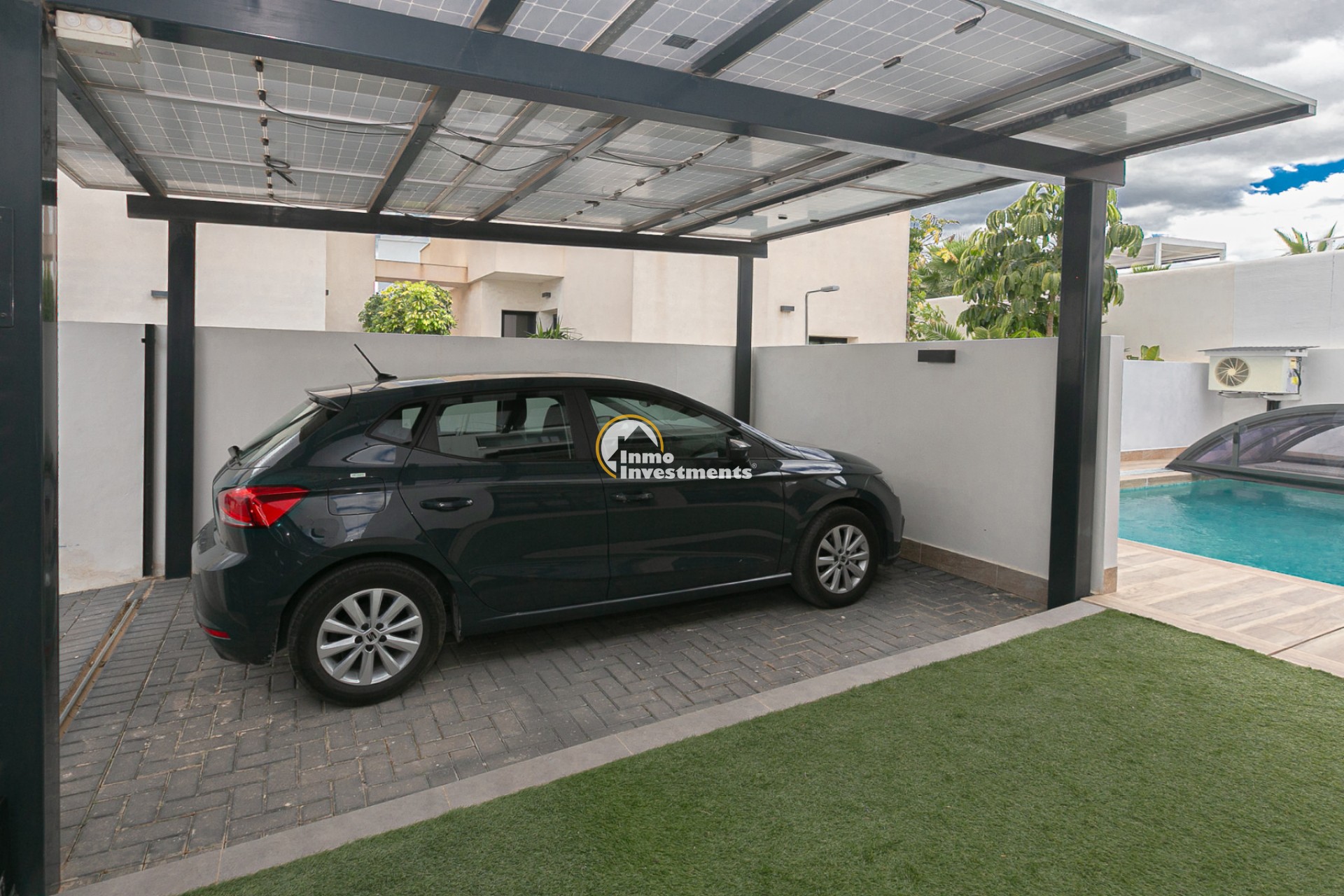 À l’entrée, nous trouvons une zone de stationnement couverte grâce à une structure avec panneaux solaires (16 panneaux d’une puissance de 7,36 kW), ce qui apporte efficacité énergétique et économies importantes. Ensuite, nous sommes accueillis par un jardin soigneusement conçu, élégant et nécessitant très peu d’entretien, équipé d’un système d’arrosage automatique Gardena.
