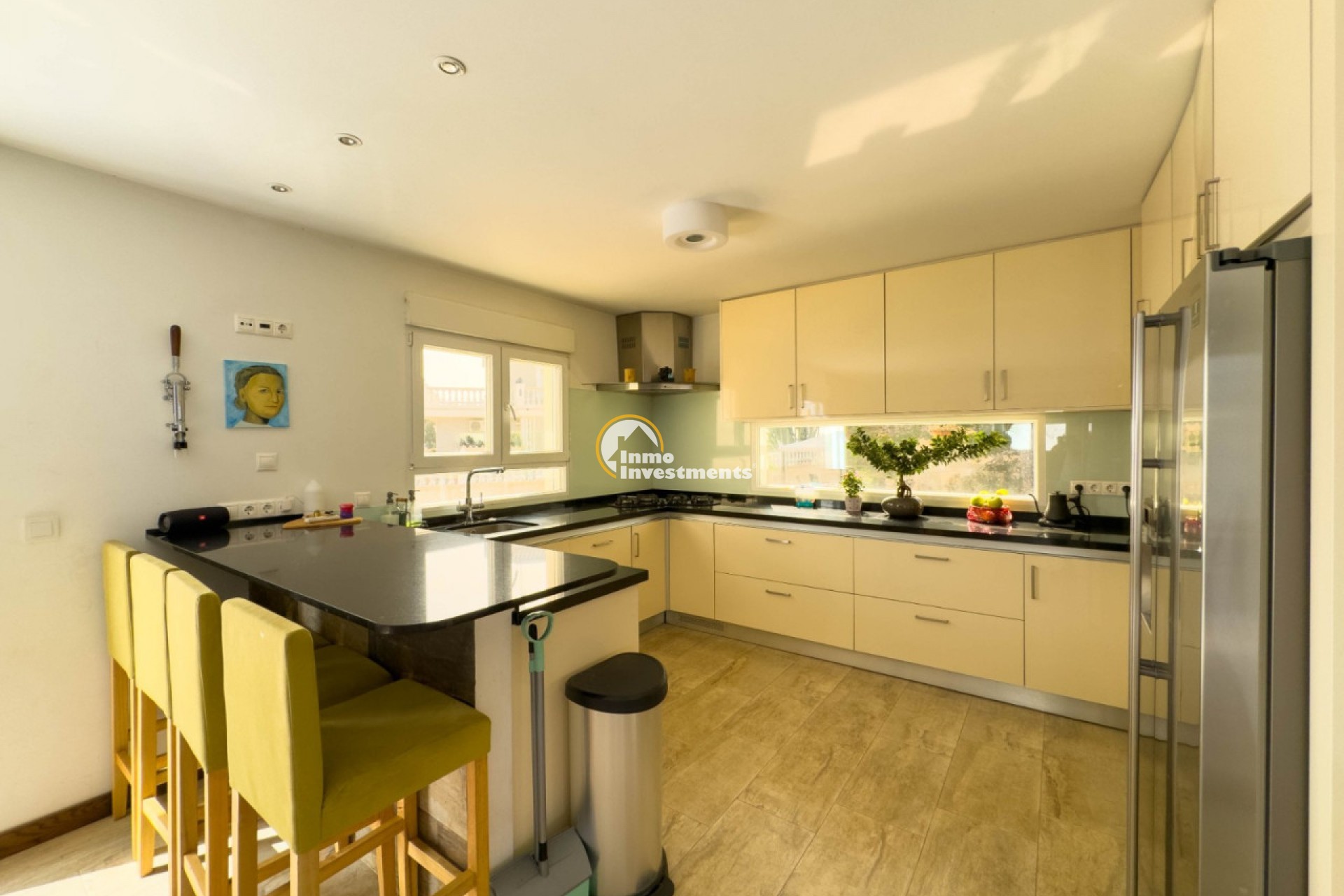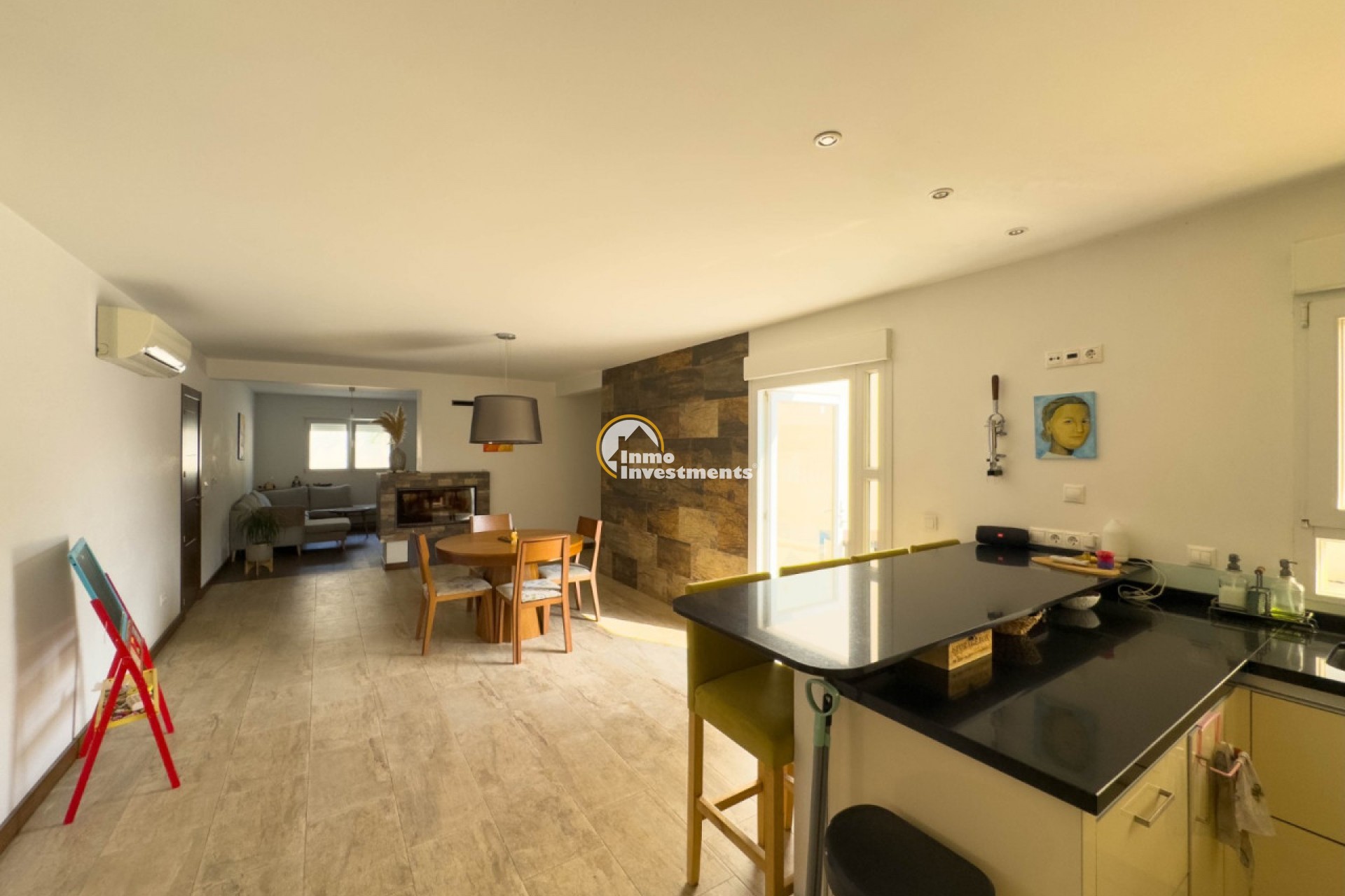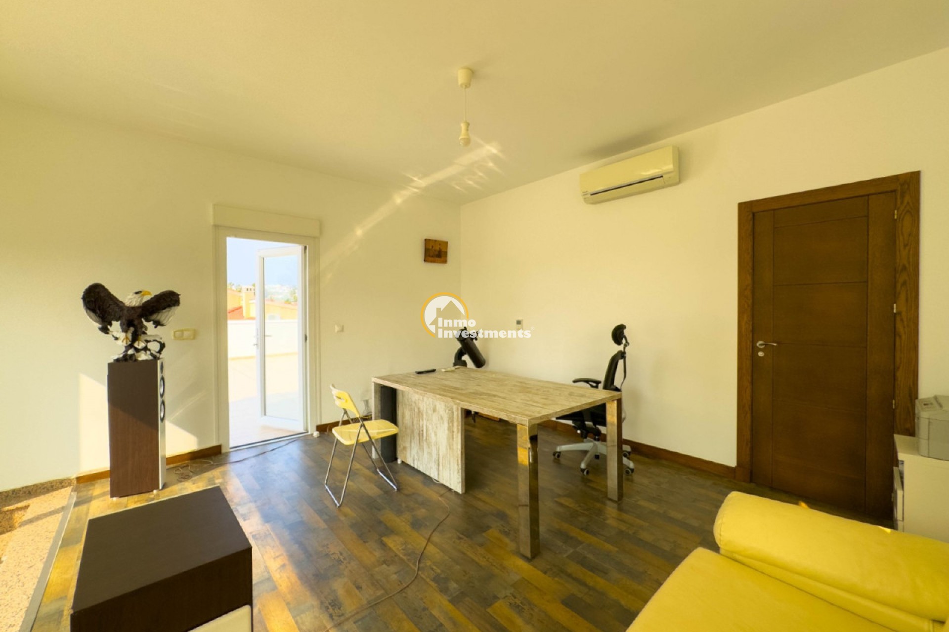 Binnen vindt u een ruime en lichte woon-eetkamer met houtkachel, een volledig ingerichte open keuken met eethoek, drie slaapkamers, een kleedkamer, drie badkamers en een toilet. Daarnaast beschikt het over een kantoor met uitzicht op de groene omgeving van het pand, een terras van 120 m² op de eerste verdieping en een solarium op de tweede verdieping.