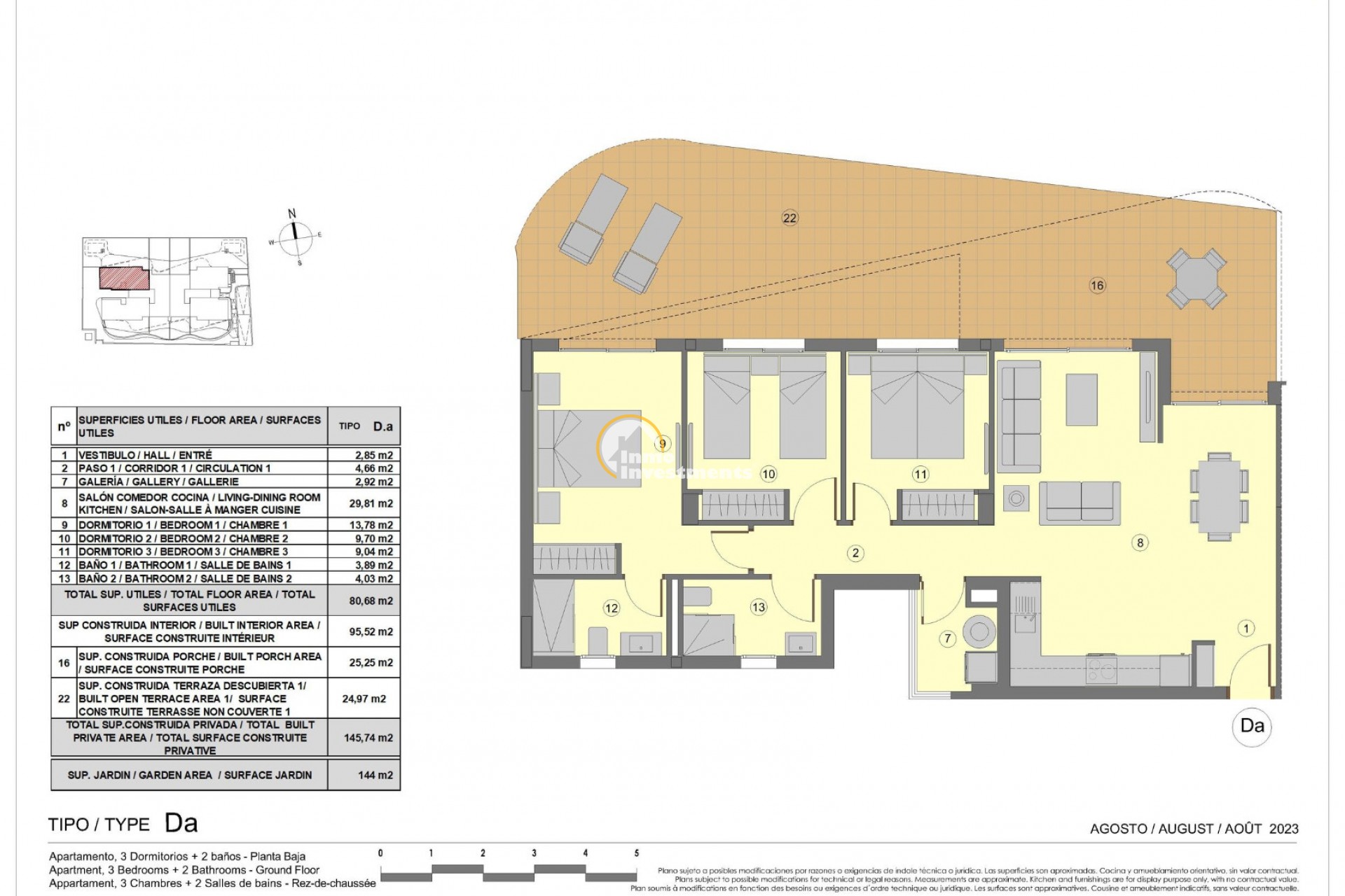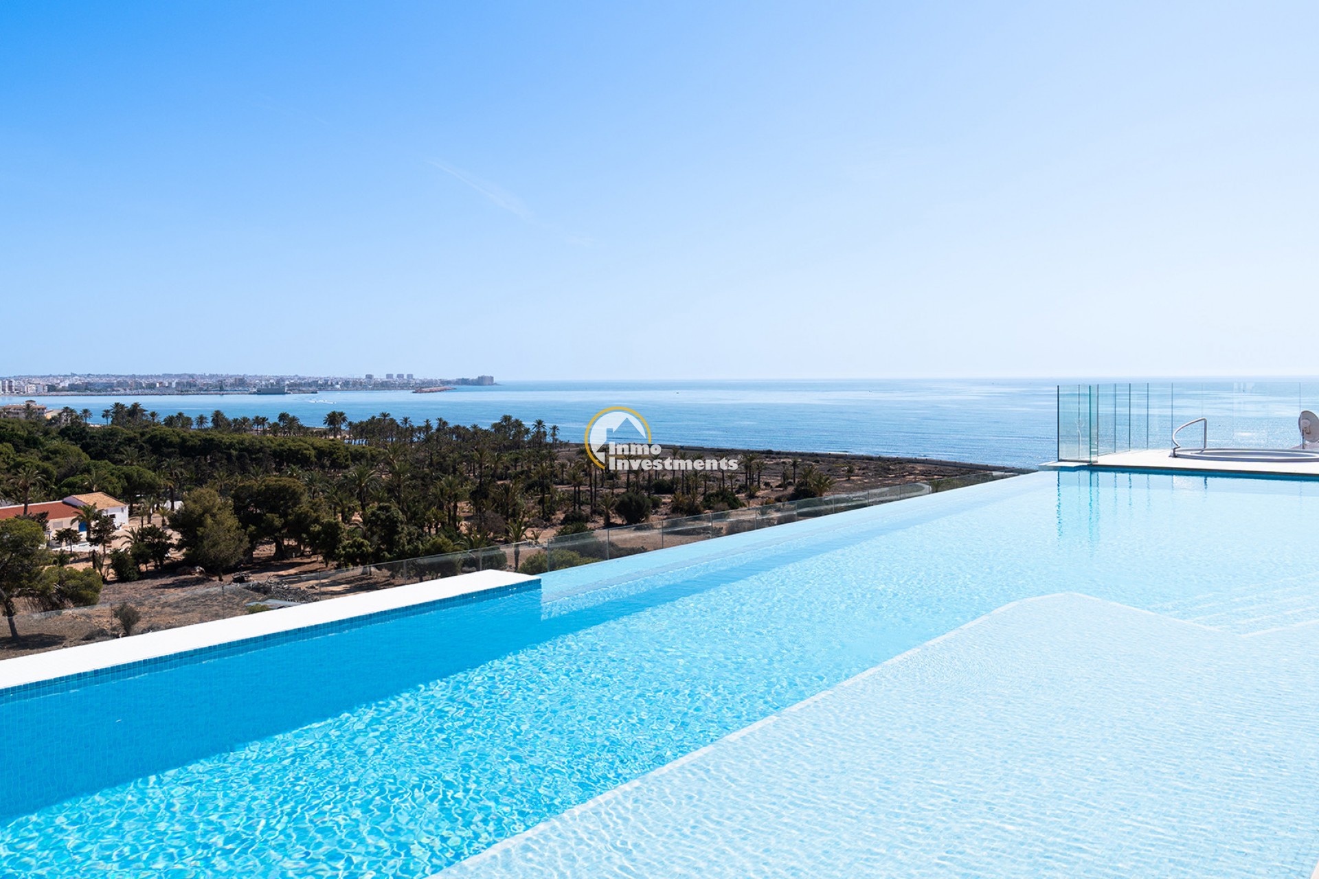 Key ready ground floor apartment located in the privileged area of Rocío del Mar-Punta Prima: next to the Lo Ferris Protected Natural Area, just 300 meters from Cala Piteras beach and just 5 minutes from Torrevieja. The development will have a total of 36 apartments with 2 and 3 bedrooms with 2 bathrooms and with extraordinary sea views from most of them. The common areas will be located on the roof terrace, an ideal place to enjoy the best sunrise or sunset thanks to its 360º views, Infinity pool with jacuzzi and chill out area. The property on the ground-floor offers a living space of 96m2 and comprise a spacious living and dining area with an open kitchen, 3 bedrooms and 2 bathrooms. Host friends and family or relax on your private 141m2 garden. Contact us for further information!