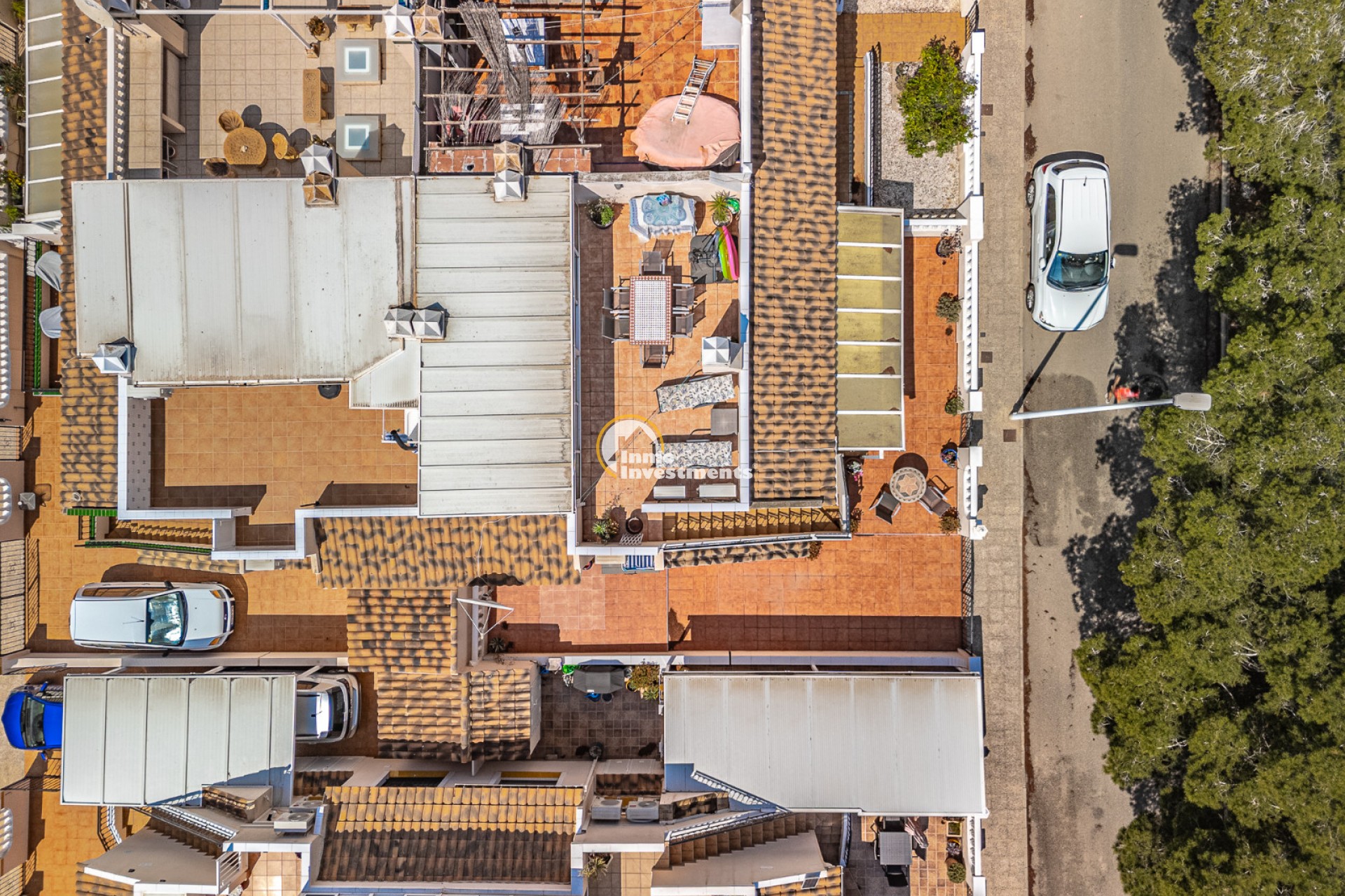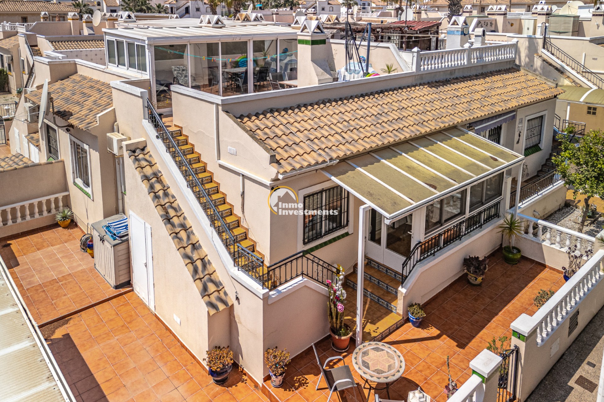 Well located quad villa for sale in the sough after Residential Oporto complex in the heart of Los Dolses. This single level home offers 2 double bedrooms, 2 bathrooms, open concept living/dining with fireplace (electric fire) and fully fitted kitchen. A glazed front terrace offers the perfect place for taking advantage of the winter sun. Boasting a super sunny main side terrace and patio garden, plus terrace and shady parking at the front of the property . External stairs lead up to the sunny solarium with glazed terrace which again is perfect for taking advantage of the winter sun and acts as a useful storage area. Sold fully furnished (minus personal items) with many extras including air conditioning, security shutters and grilles. The community offers super lush gardens and 2 swimming pools for residents.