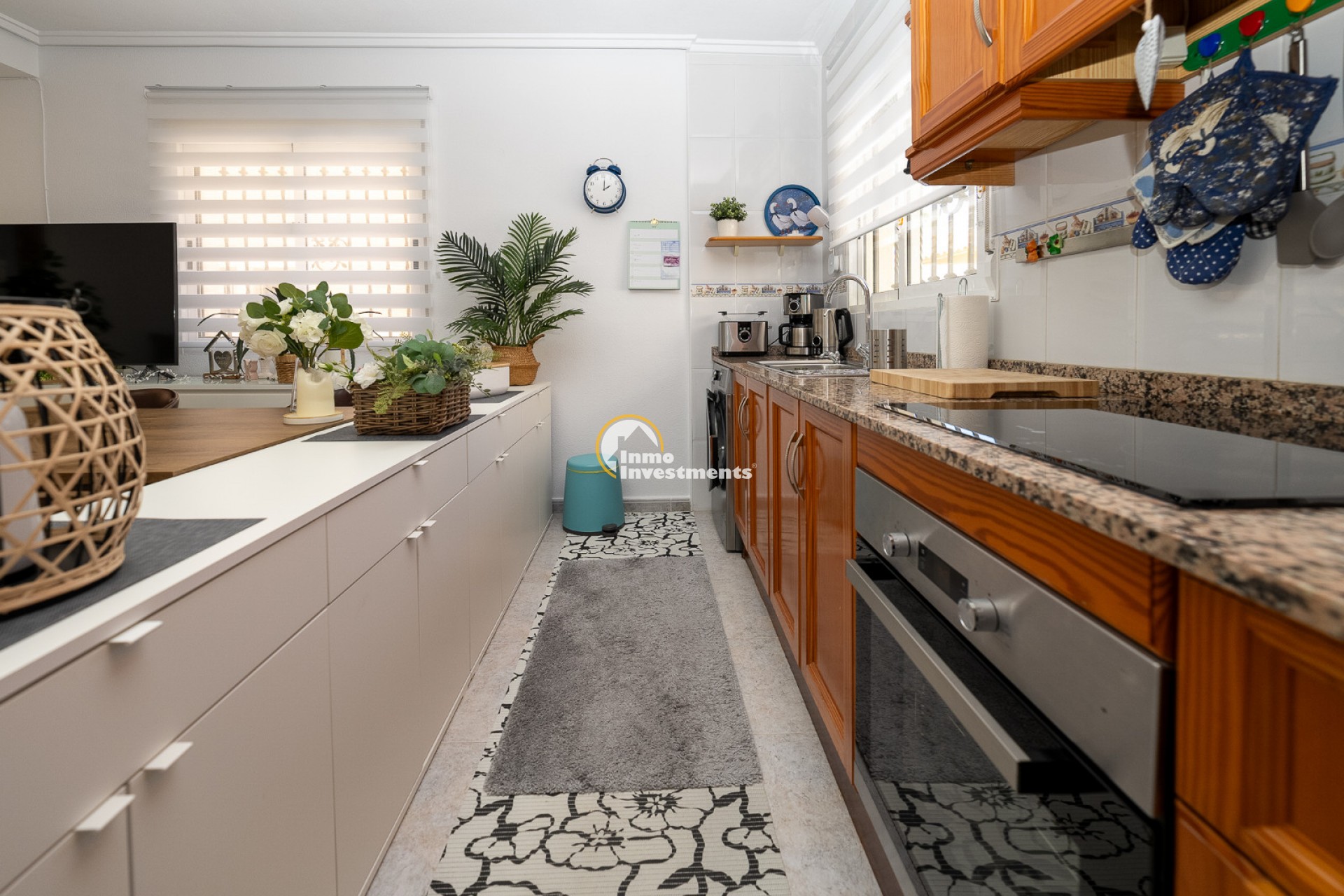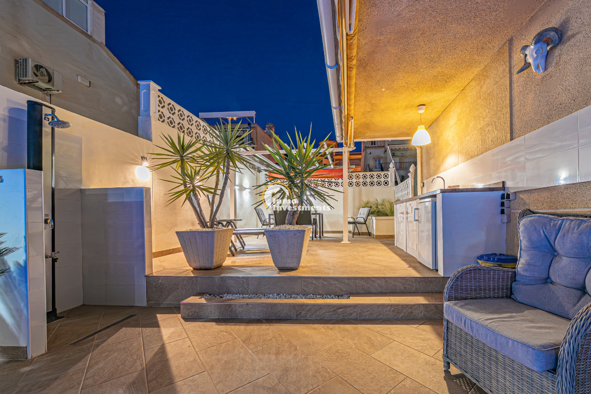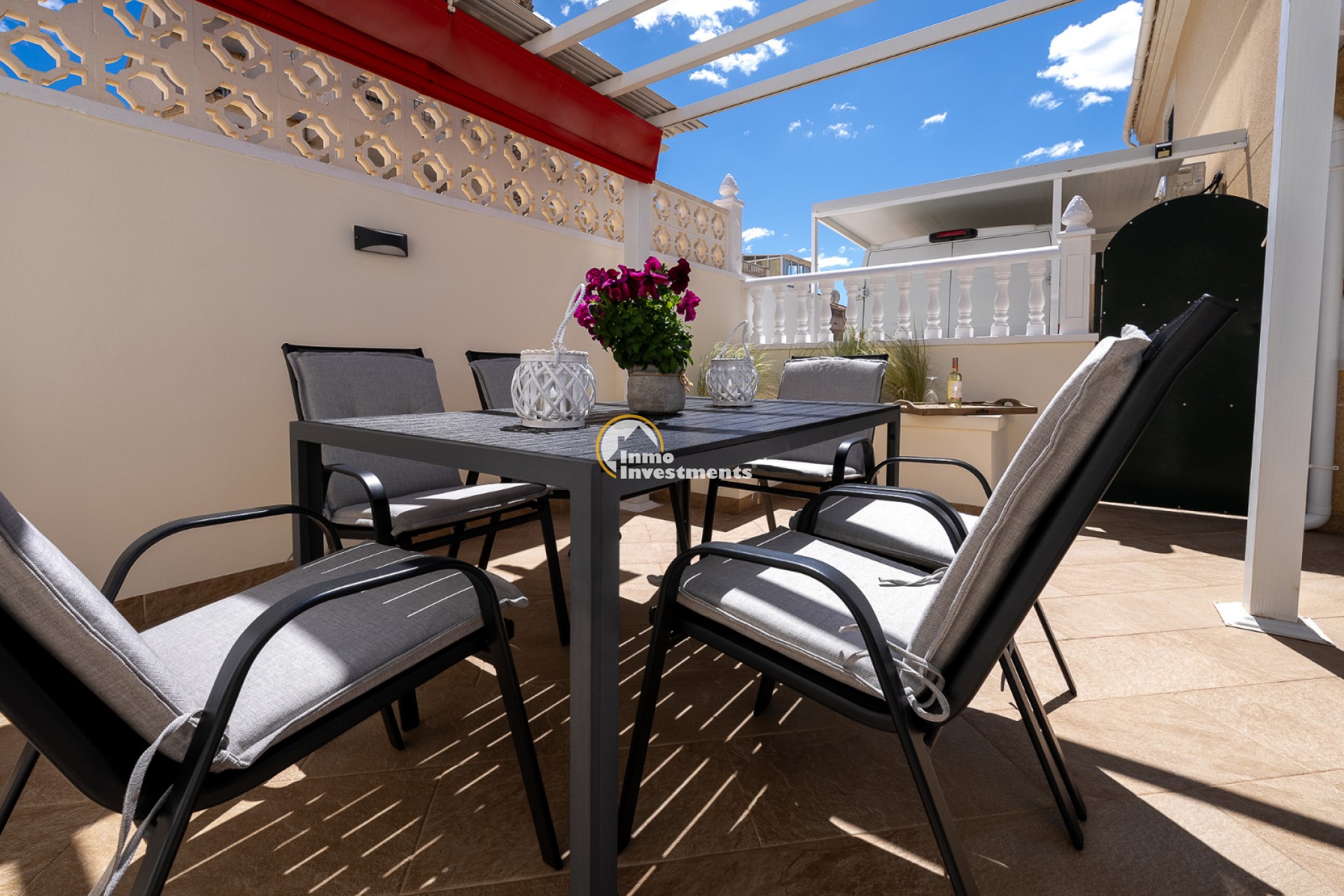The upper floor features a bright and inviting lounge and dining area, a fully equipped kitchen, two spacious double bedrooms, and two modern bathrooms. From the lounge, step directly onto your private roof terrace, complete with a pergola – the perfect spot to unwind on warm Mediterranean evenings. A glazed balcony/conservatory adds to the living space, ideal for relaxing with a book or enjoying morning coffee year-round.