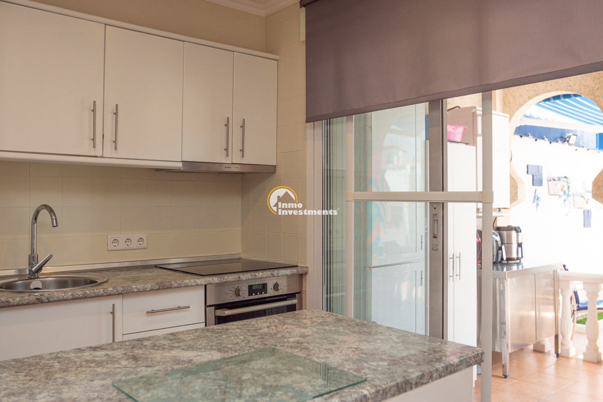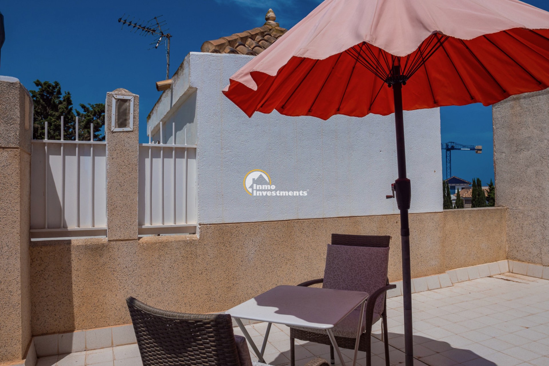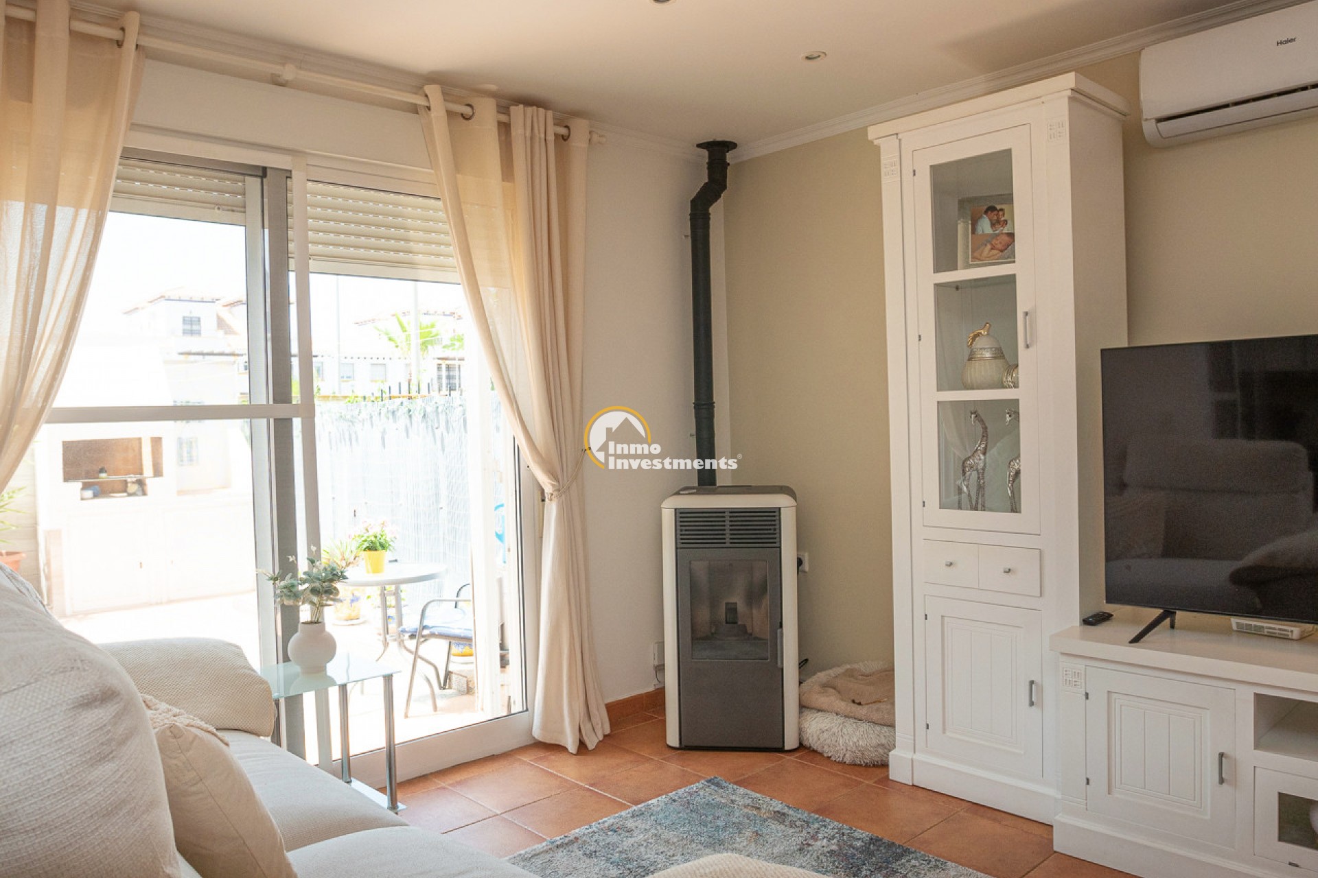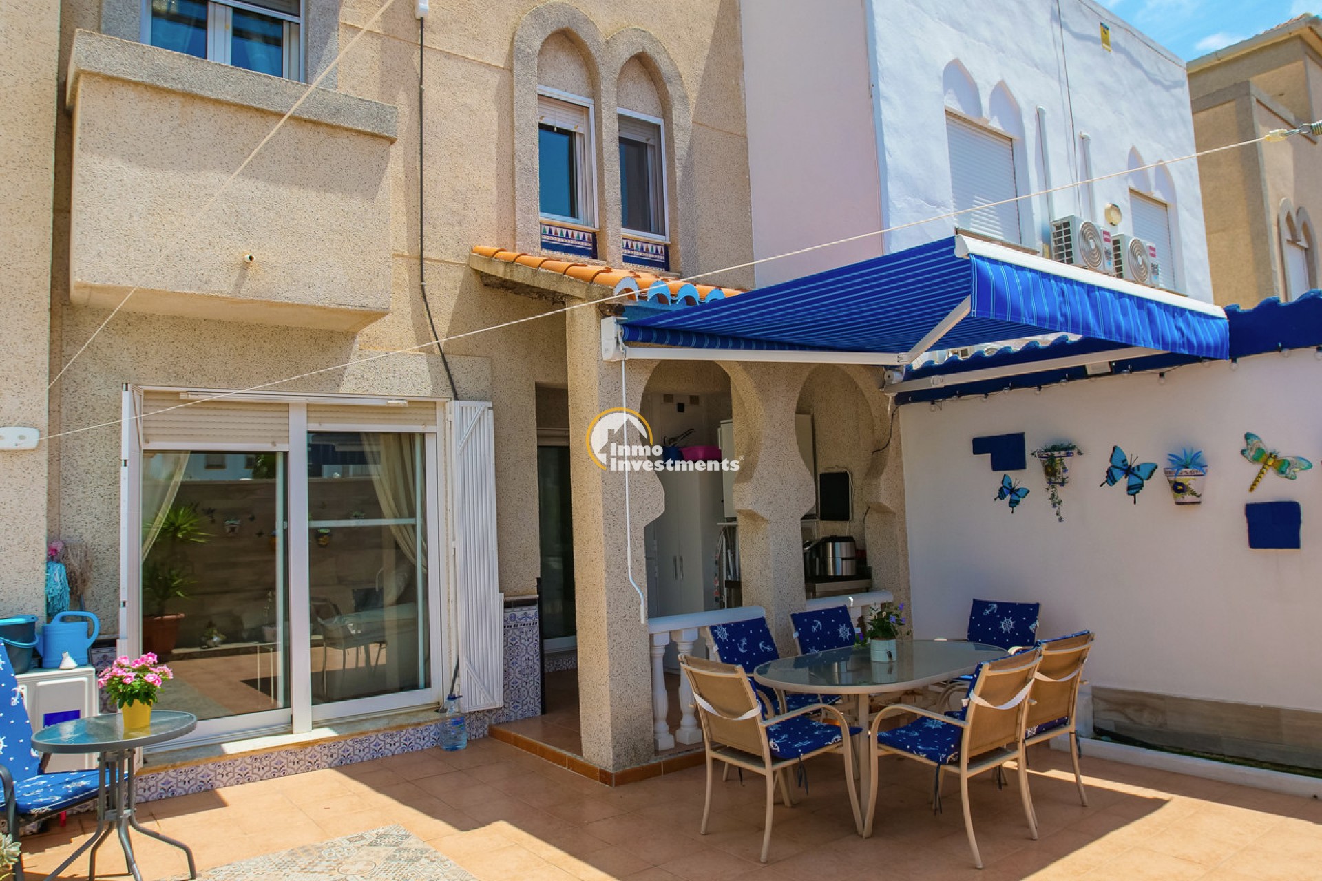 This well-presented 3 bedroom town house is located just a short walk from La Zenia beach. The property has been tastefully updated to include modern finishes while keeping some of its original features. At the front, there is an east-facing garden with direct access to the house. Inside, you'll find a bright living and dining area with a pellet burner and patio doors that lead to a spacious terrace, ideal for relaxing or dining outside. The separate kitchen has plenty of cupboard and worktop space and also has direct access to the rear patio. A family shower room and WC completes the ground floor. Upstairs on the first floor, there is a guest double bedroom with fitted wardrobes and a second modern bathroom. The main bedroom is very spacious, having been created by combining two original rooms and offers a sitting area and extensive fitted wardrobes. From the first floor, stairs lead to the third bedroom and out to the rooftop solarium, which has open views of the surrounding area and out to the Mediterranean Sea.