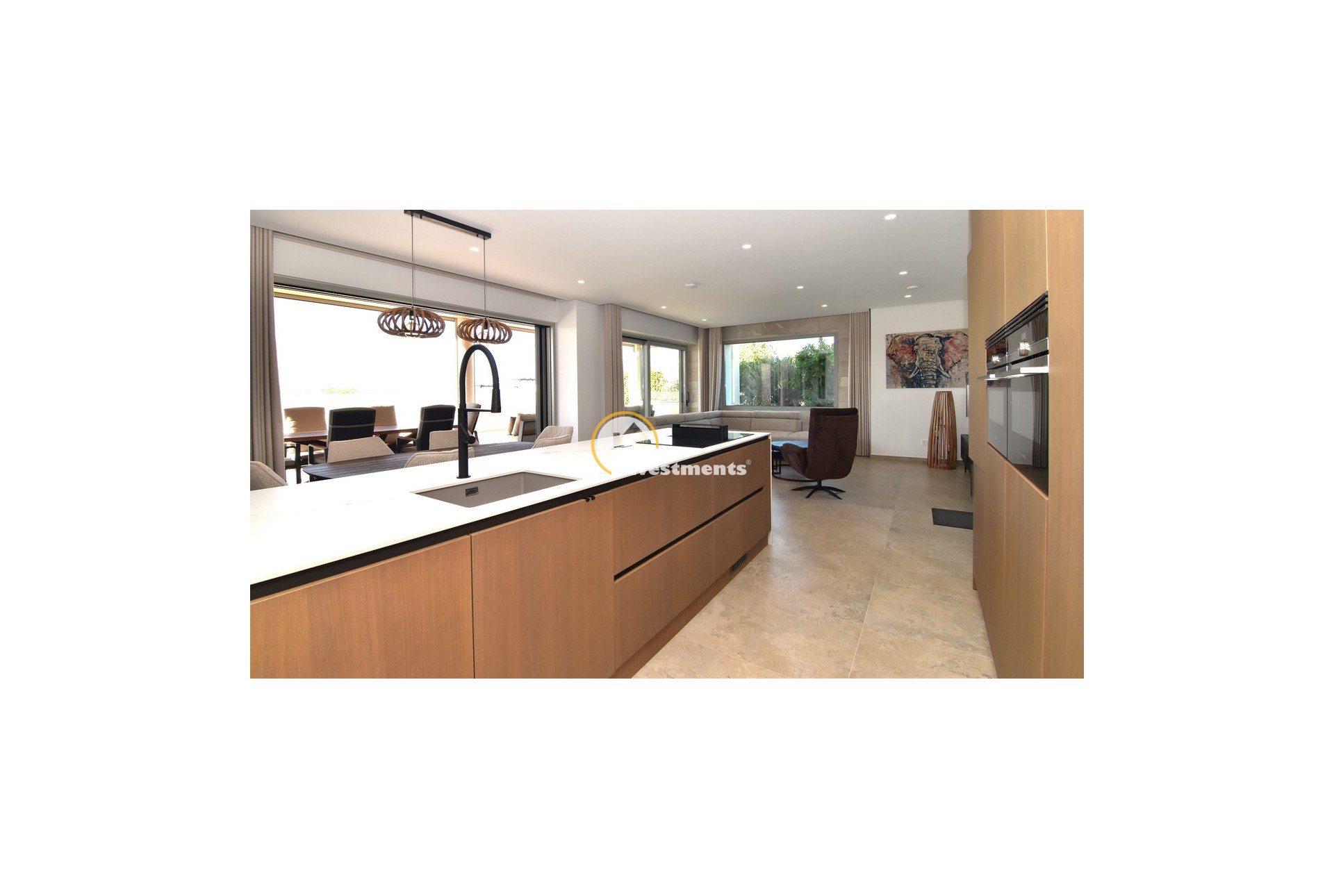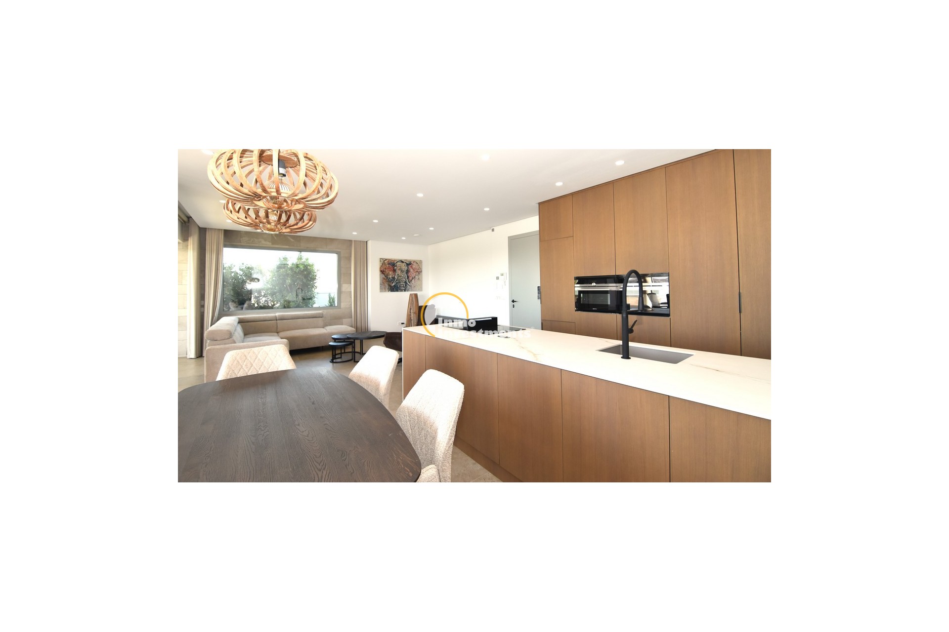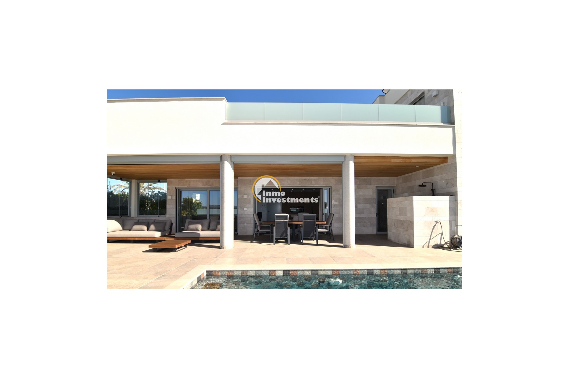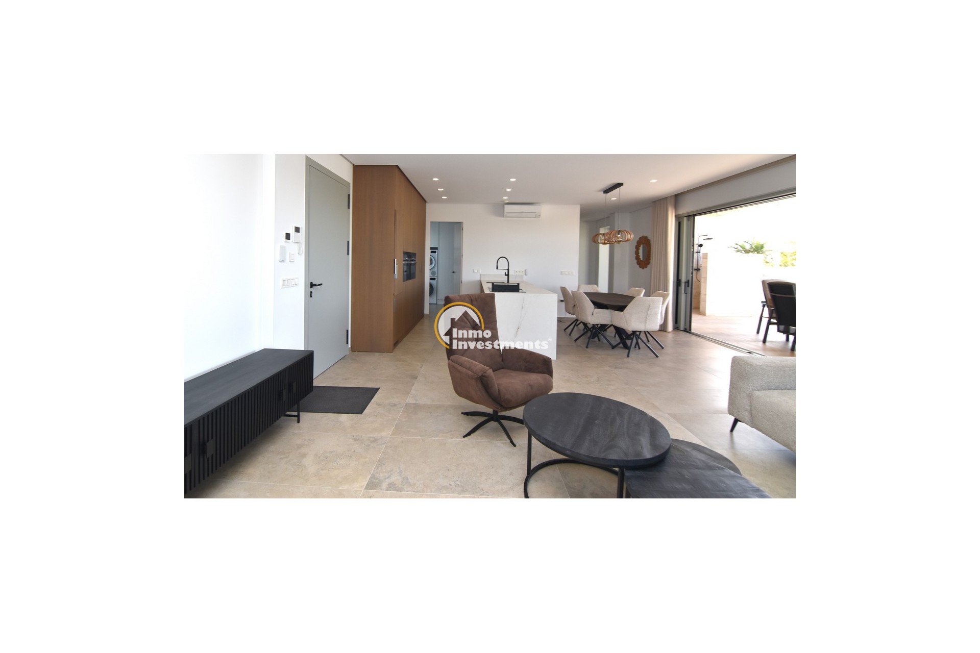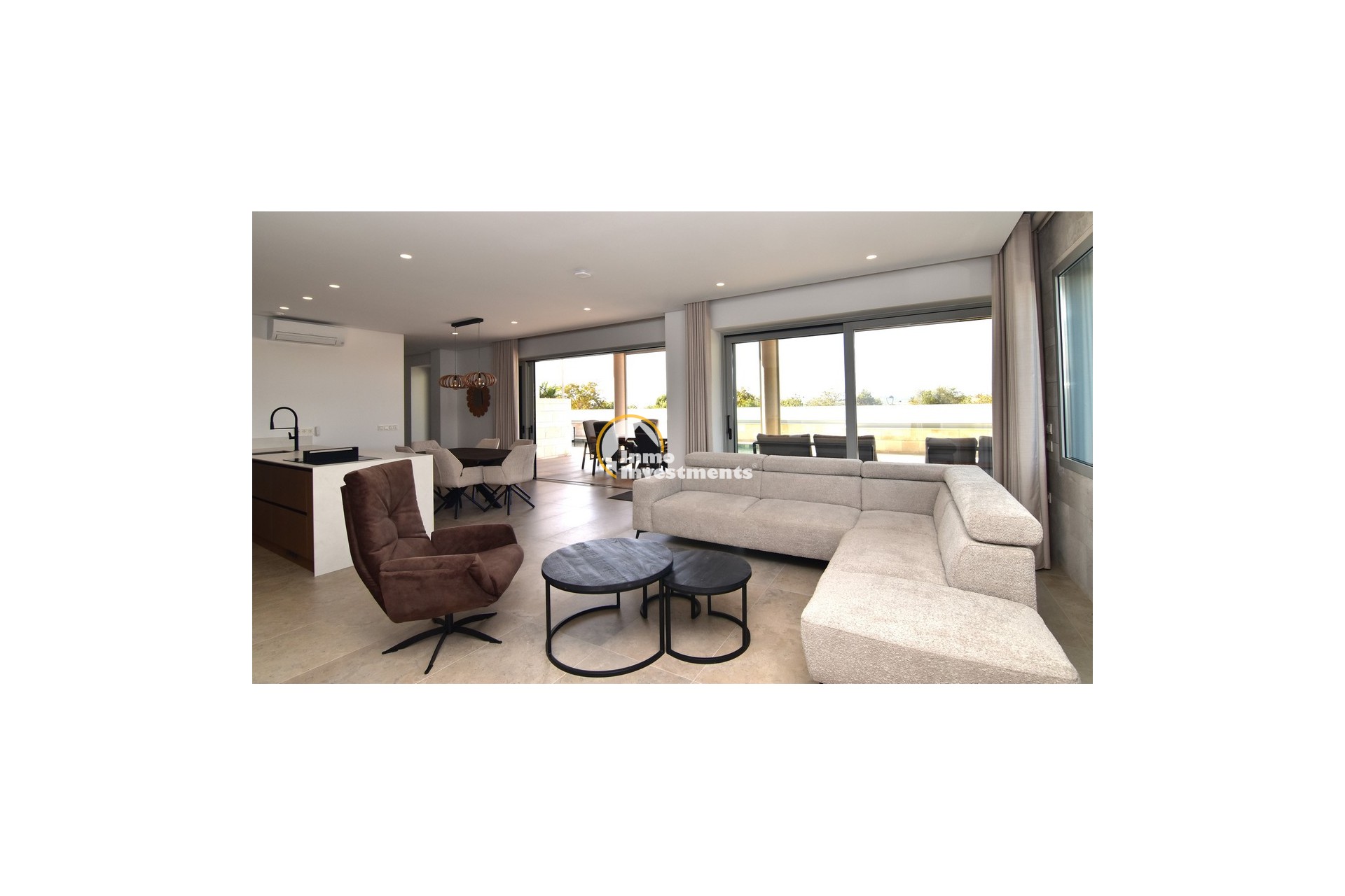 The open lounge extends out onto a large, covered terrace, perfect for al fresco living. This area has been fitted with high-quality electric screens that can fully enclose the space, creating a bug-free outdoor room. This feature alone represents a significant investment of around €20,000 and reflects the no-expense-spared approach to the build.