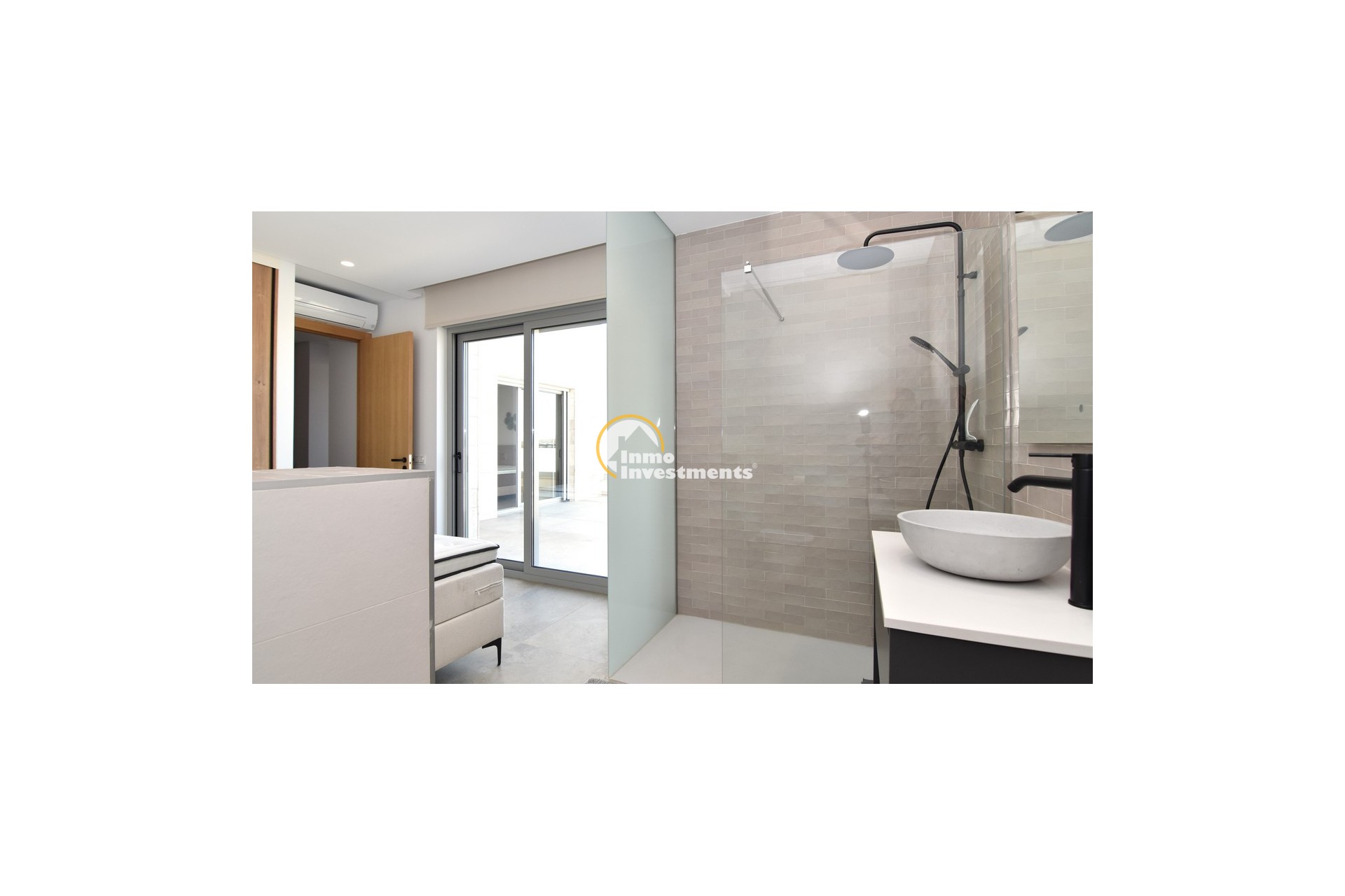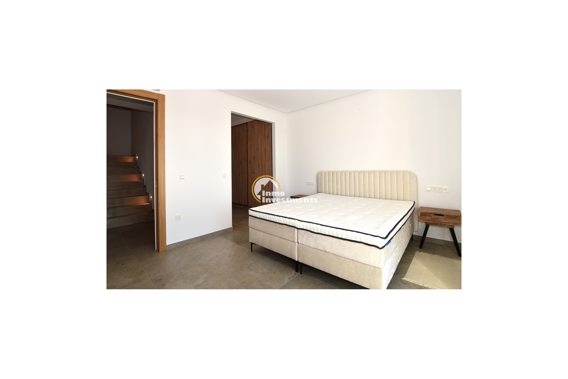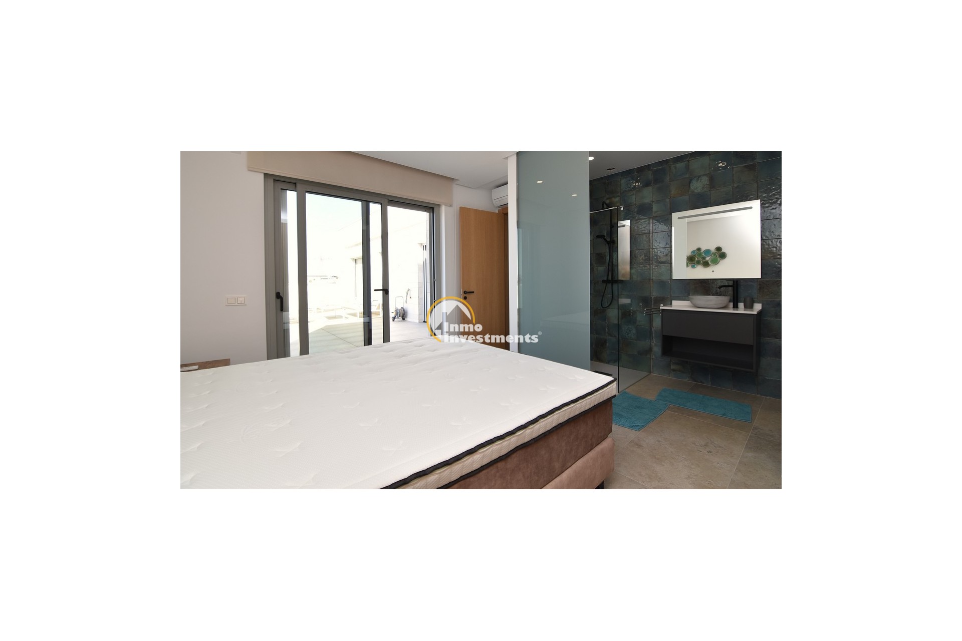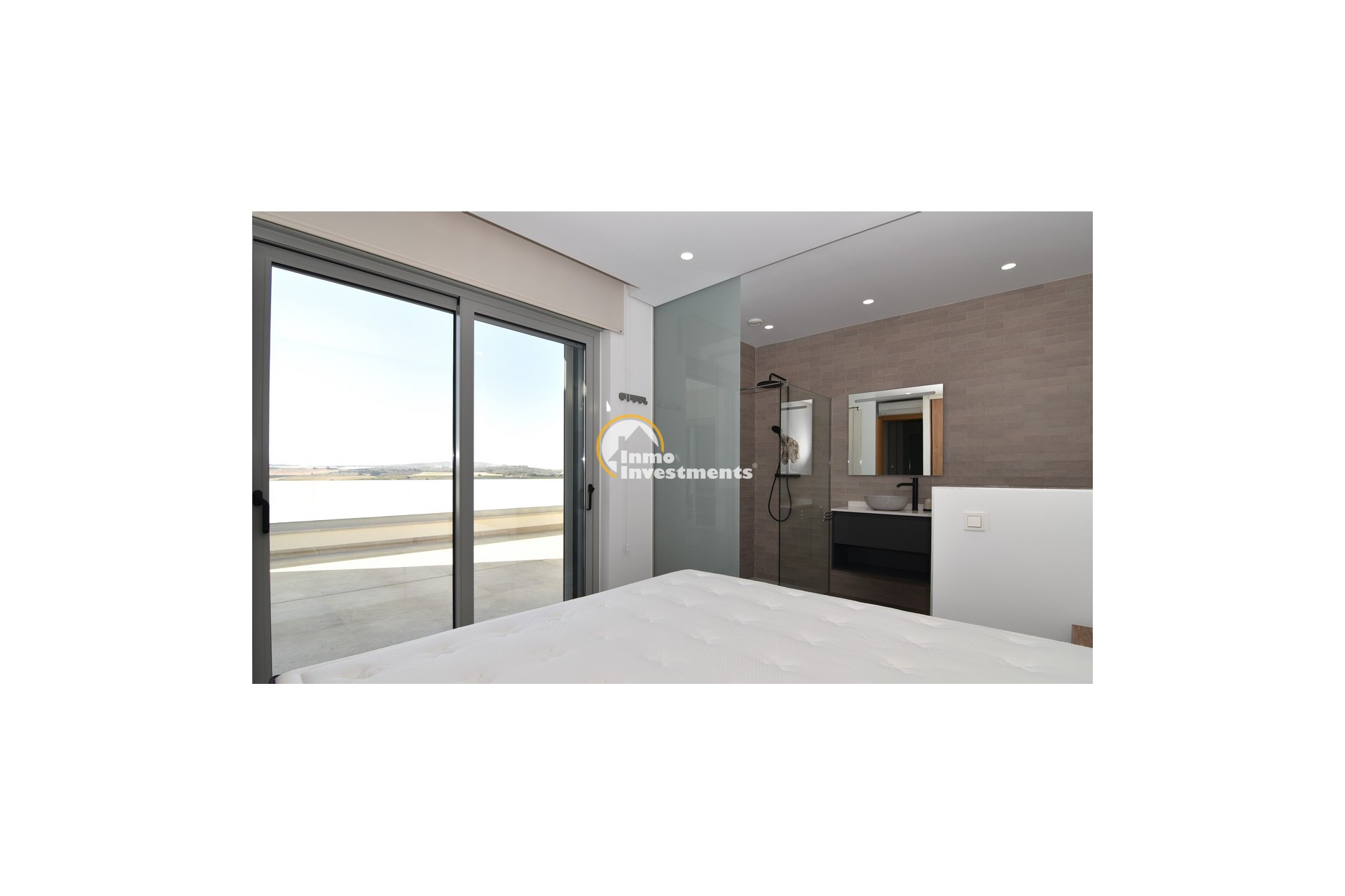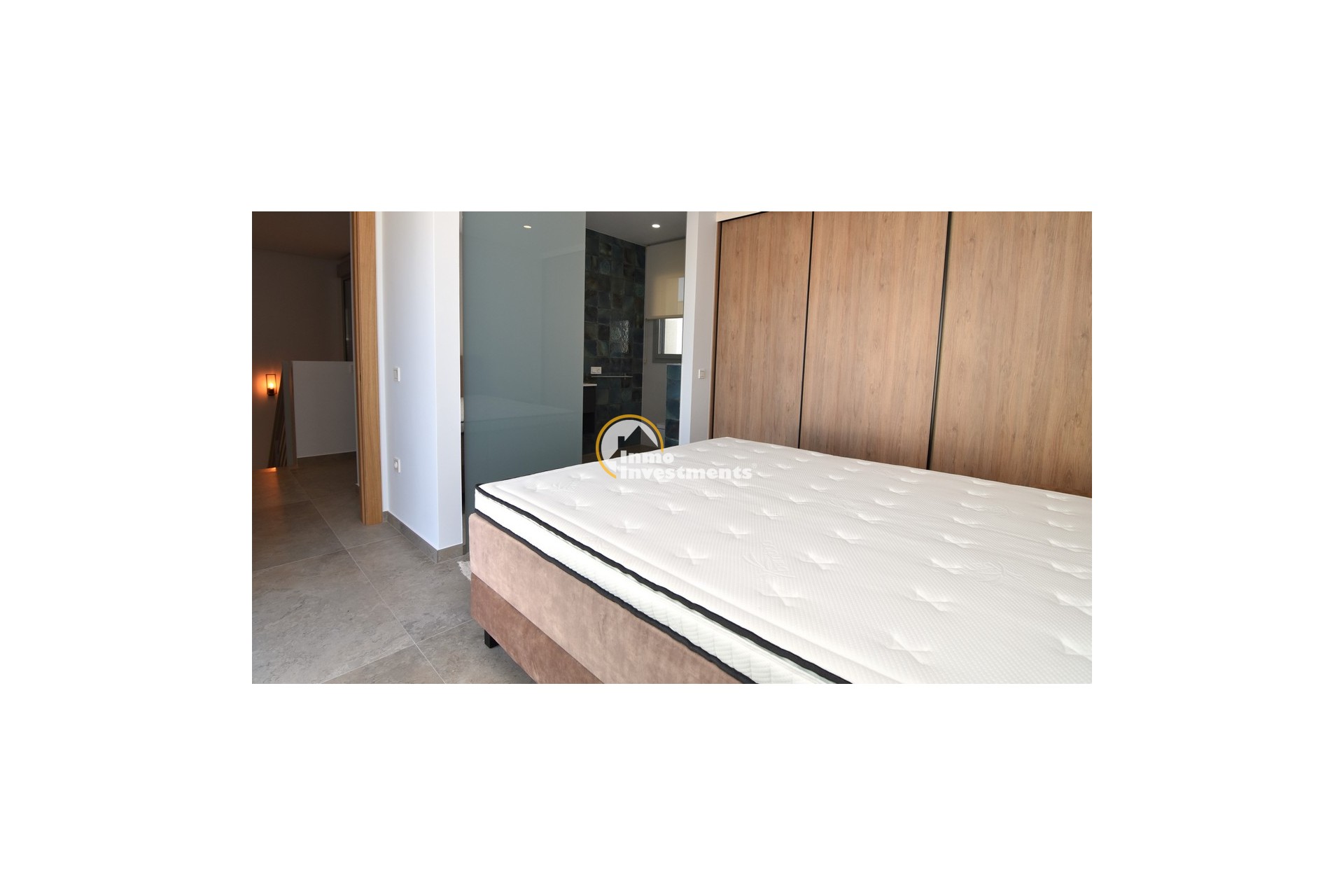 Upstairs, the home offers three further large double bedrooms, each with its own stylish open-plan bathroom. All bedrooms have direct access to a spacious upper terrace via sliding doors, offering panoramic views and ample outdoor space. A smaller balcony can also be found to the rear on this level. Motion-activated lighting in the hallway and subtle foot-level stair lighting add both safety and ambiance during evening hours.