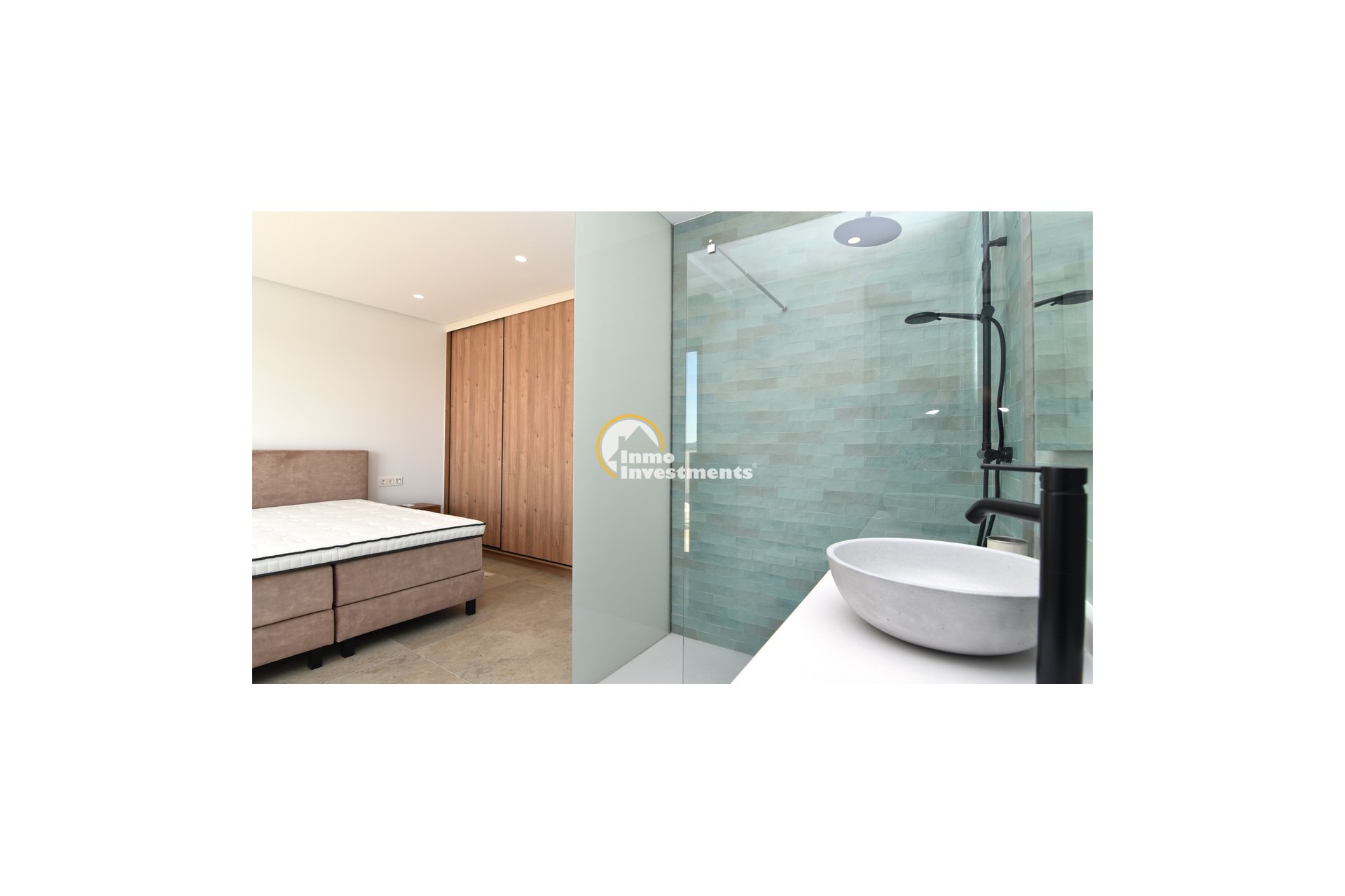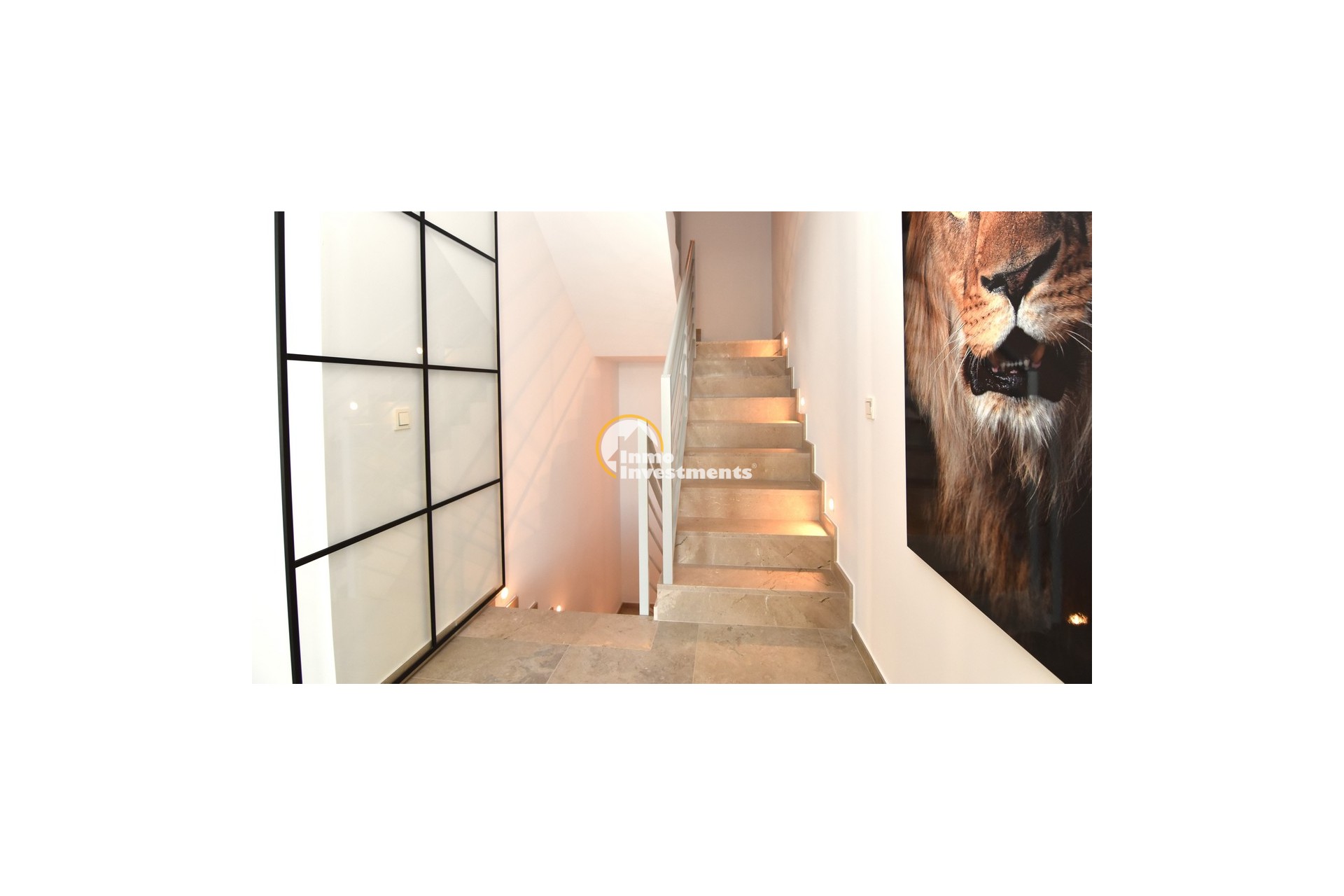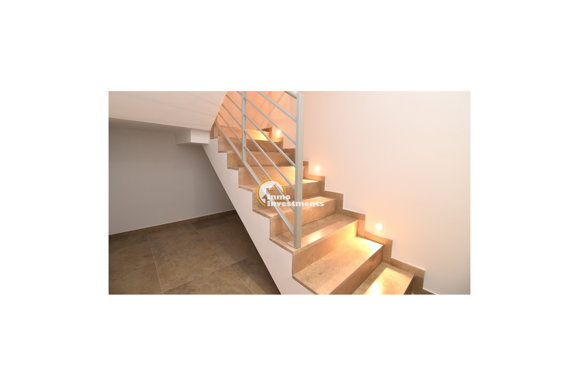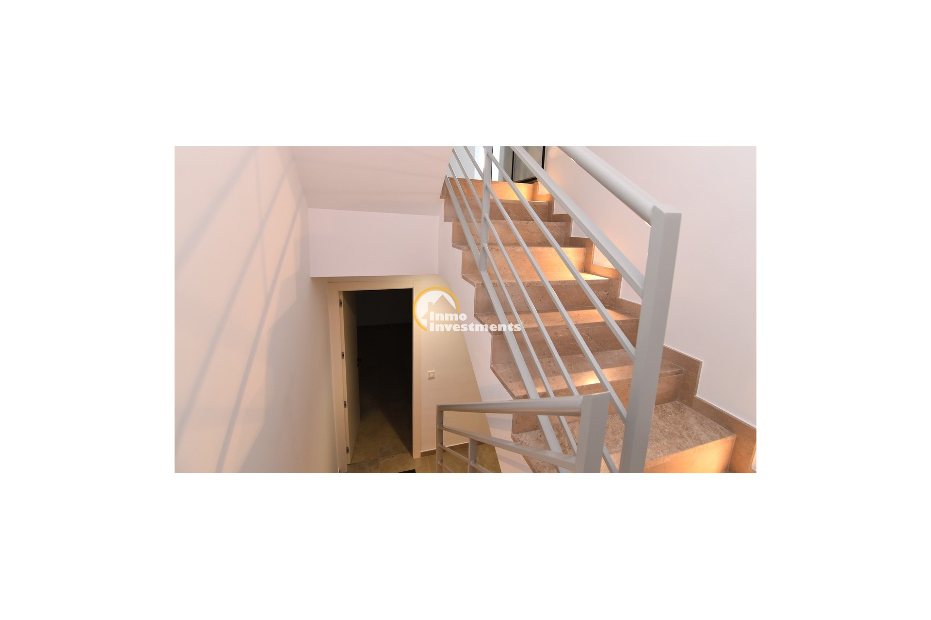 Upstairs, the home offers three further large double bedrooms, each with its own stylish open-plan bathroom. All bedrooms have direct access to a spacious upper terrace via sliding doors, offering panoramic views and ample outdoor space. A smaller balcony can also be found to the rear on this level. Motion-activated lighting in the hallway and subtle foot-level stair lighting add both safety and ambiance during evening hours.