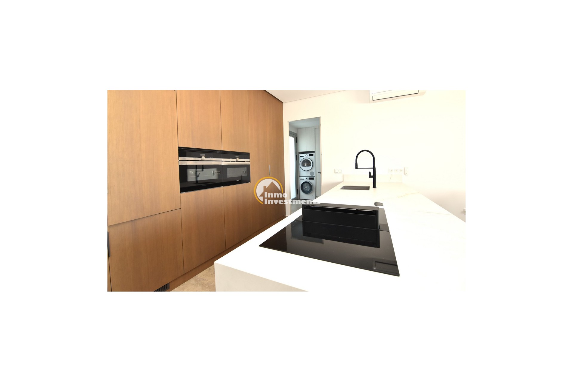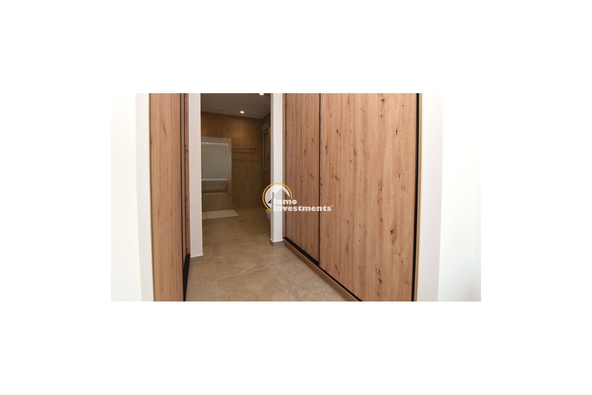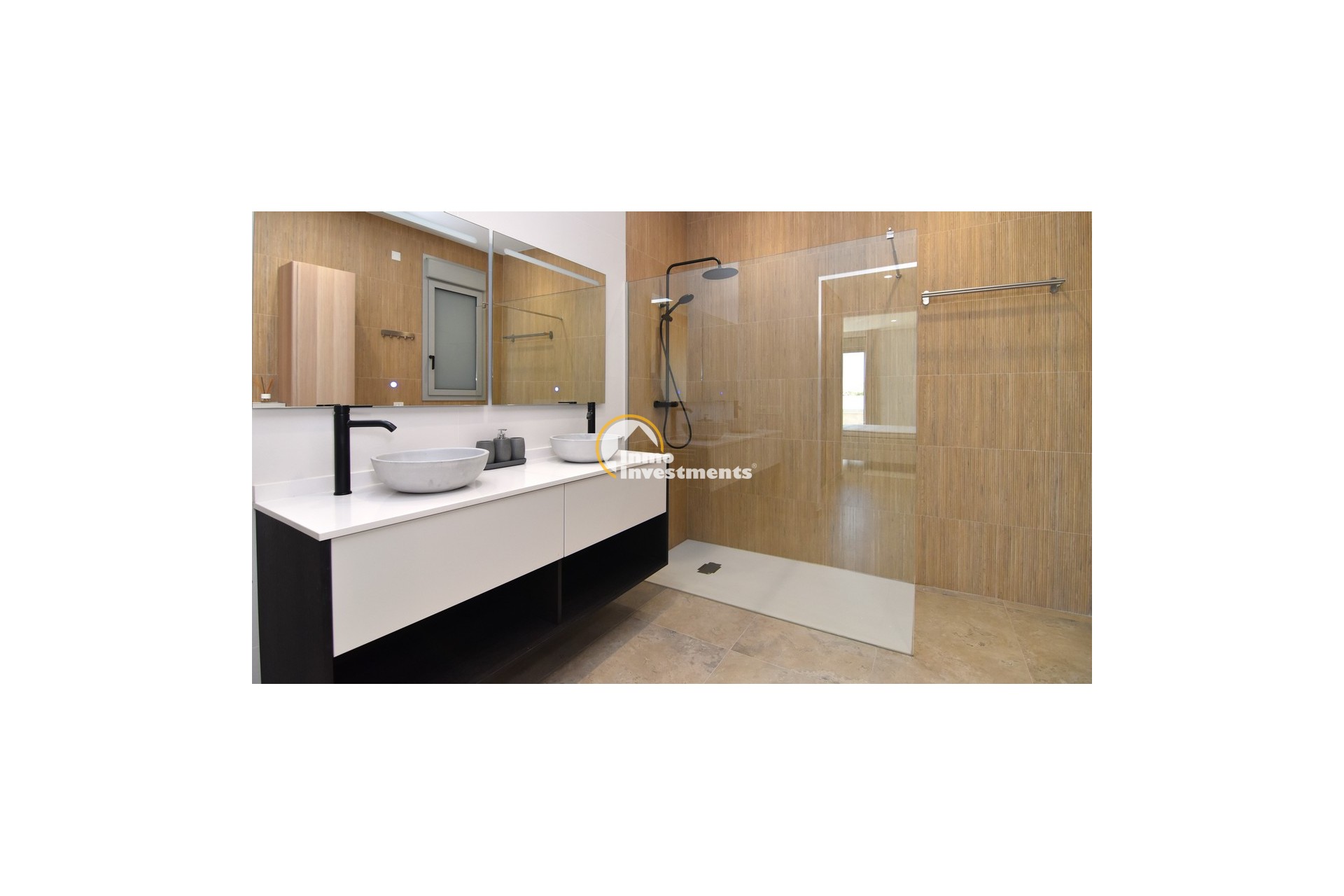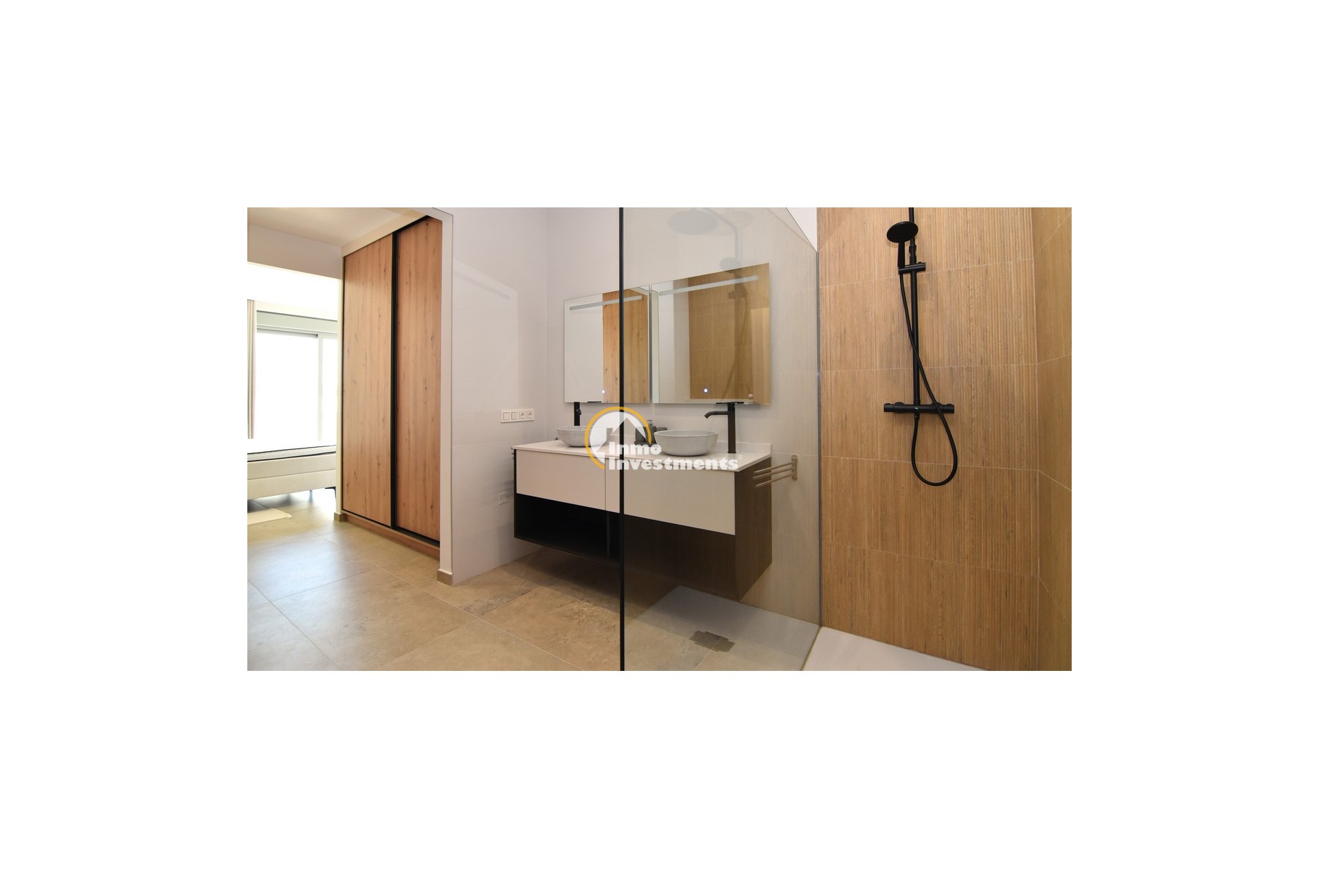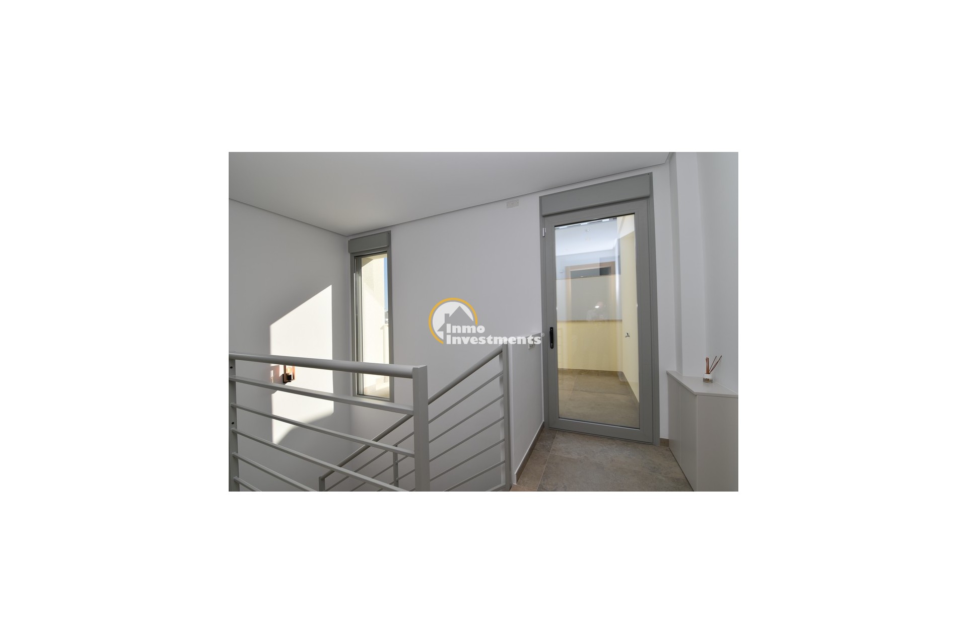 Upstairs, the home offers three further large double bedrooms, each with its own stylish open-plan bathroom. All bedrooms have direct access to a spacious upper terrace via sliding doors, offering panoramic views and ample outdoor space. A smaller balcony can also be found to the rear on this level. Motion-activated lighting in the hallway and subtle foot-level stair lighting add both safety and ambiance during evening hours.