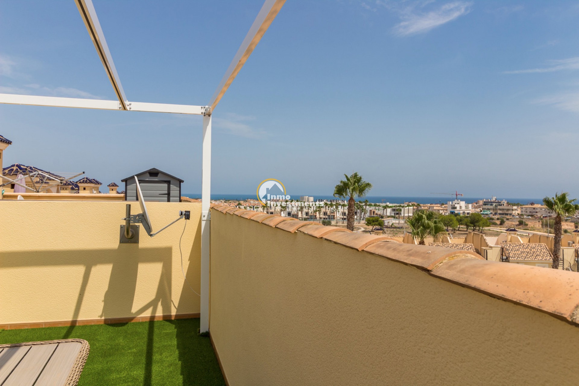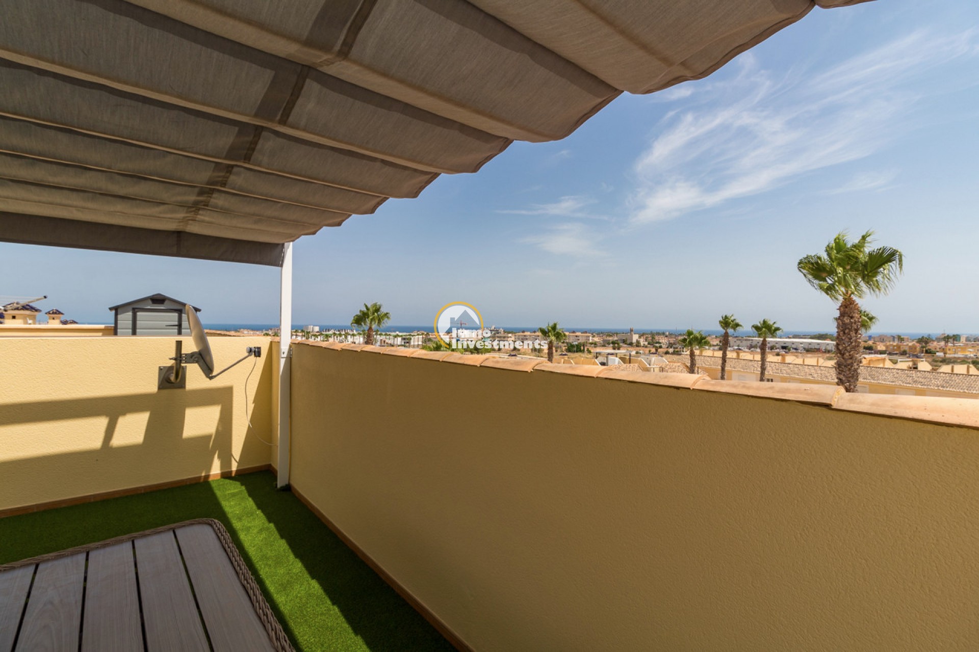 The outdoor space is a true highlight: from the balcony and the 25 m² roof terrace you can enjoy beautiful views of the Mediterranean Sea and the communal pool. The solarium has been tastefully finished with artificial grass including a drainage system, water and electricity connections, and a custom-made pergola that provides ample shade. Additional storage space is also available. The balcony has been fitted with a new awning, allowing both outdoor areas to be enjoyed all year round.