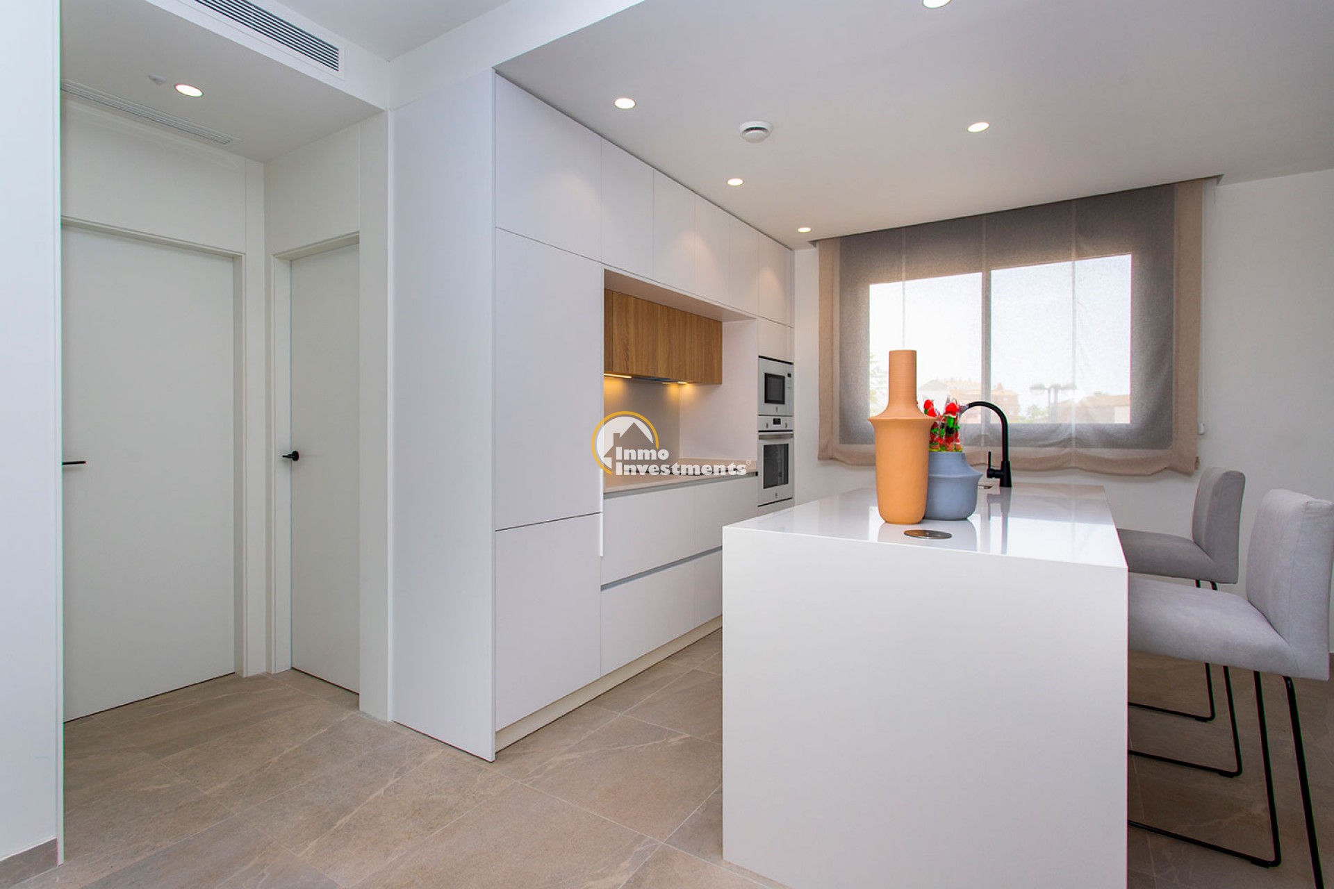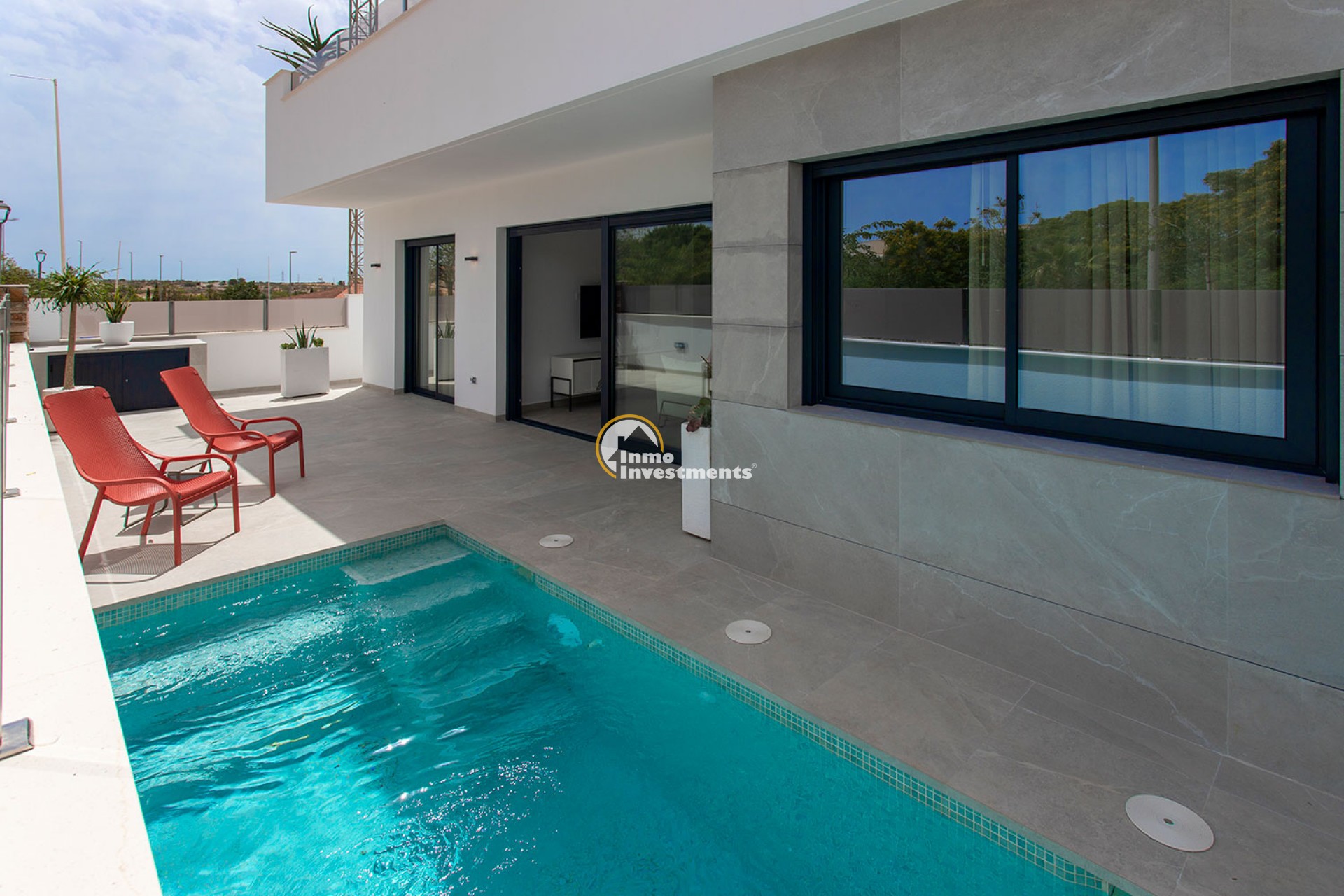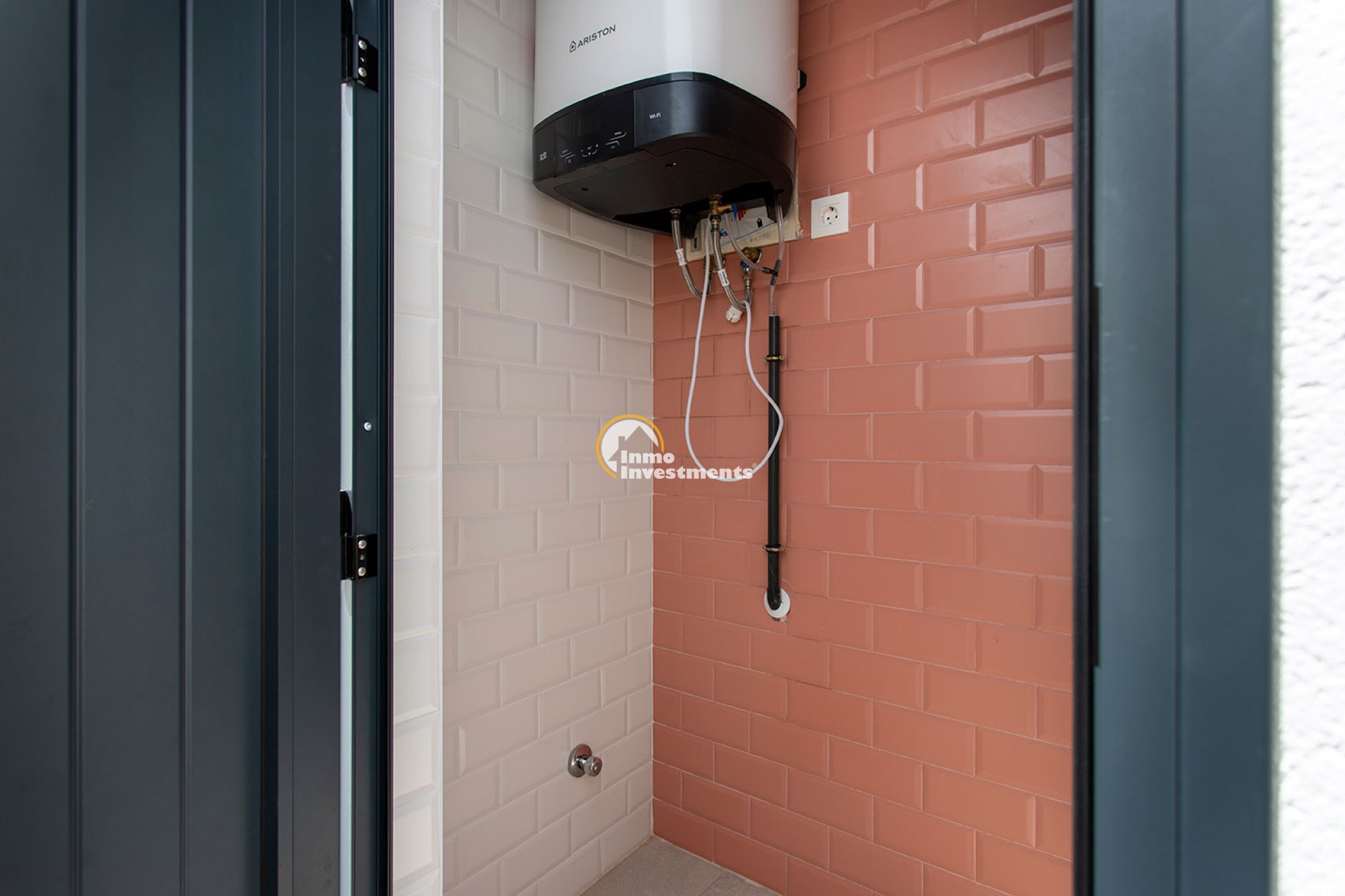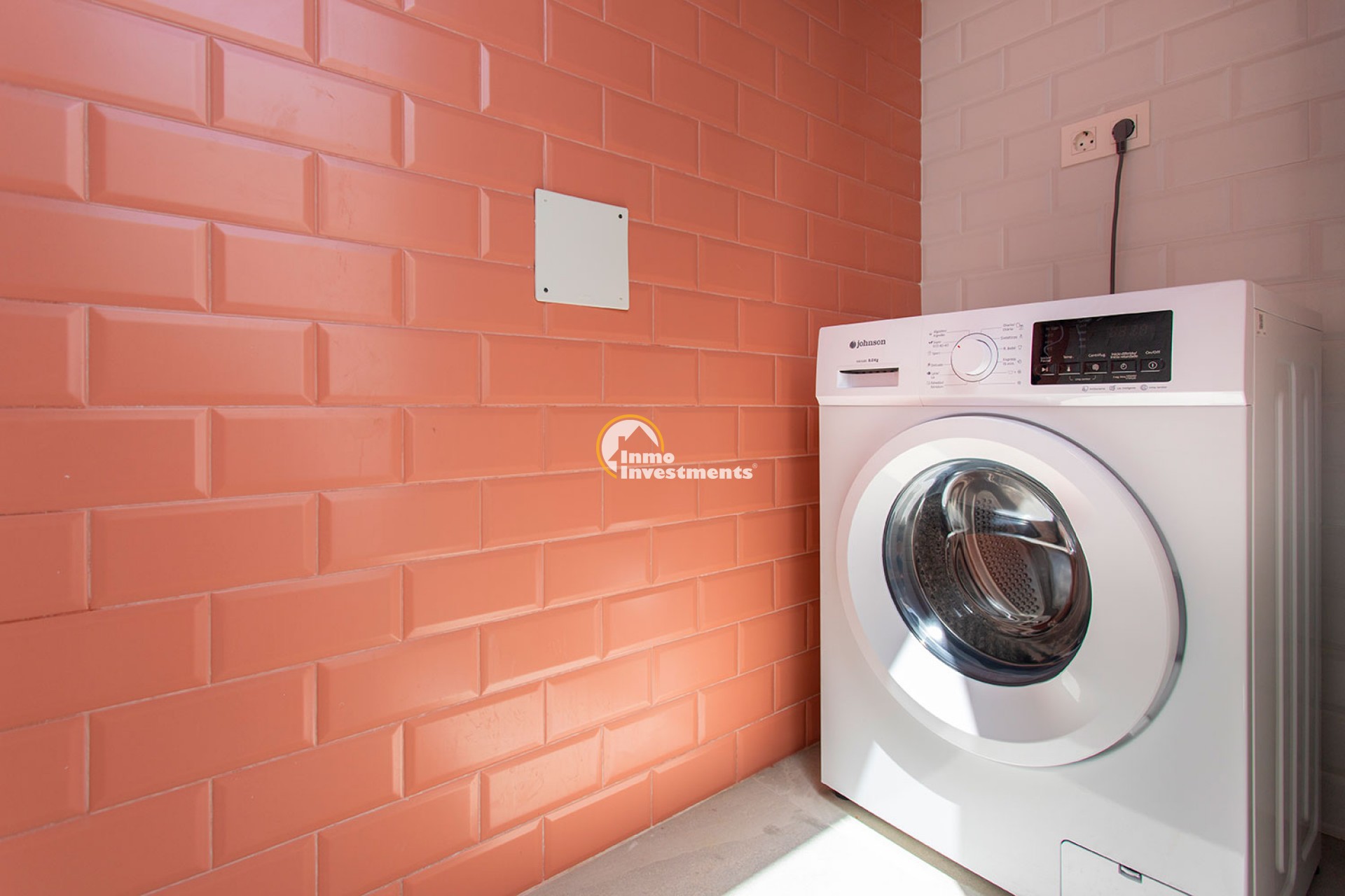 This contemporary villa combines bright, modern living with comfort and privacy. It features three bedrooms and two bathrooms, plus an outside toilet. The master suite includes a dressing room, en suite bathroom, and direct access to the terrace and pool. The open-plan living area flows seamlessly into the integrated kitchen and onto the terrace, creating a relaxed, airy space.