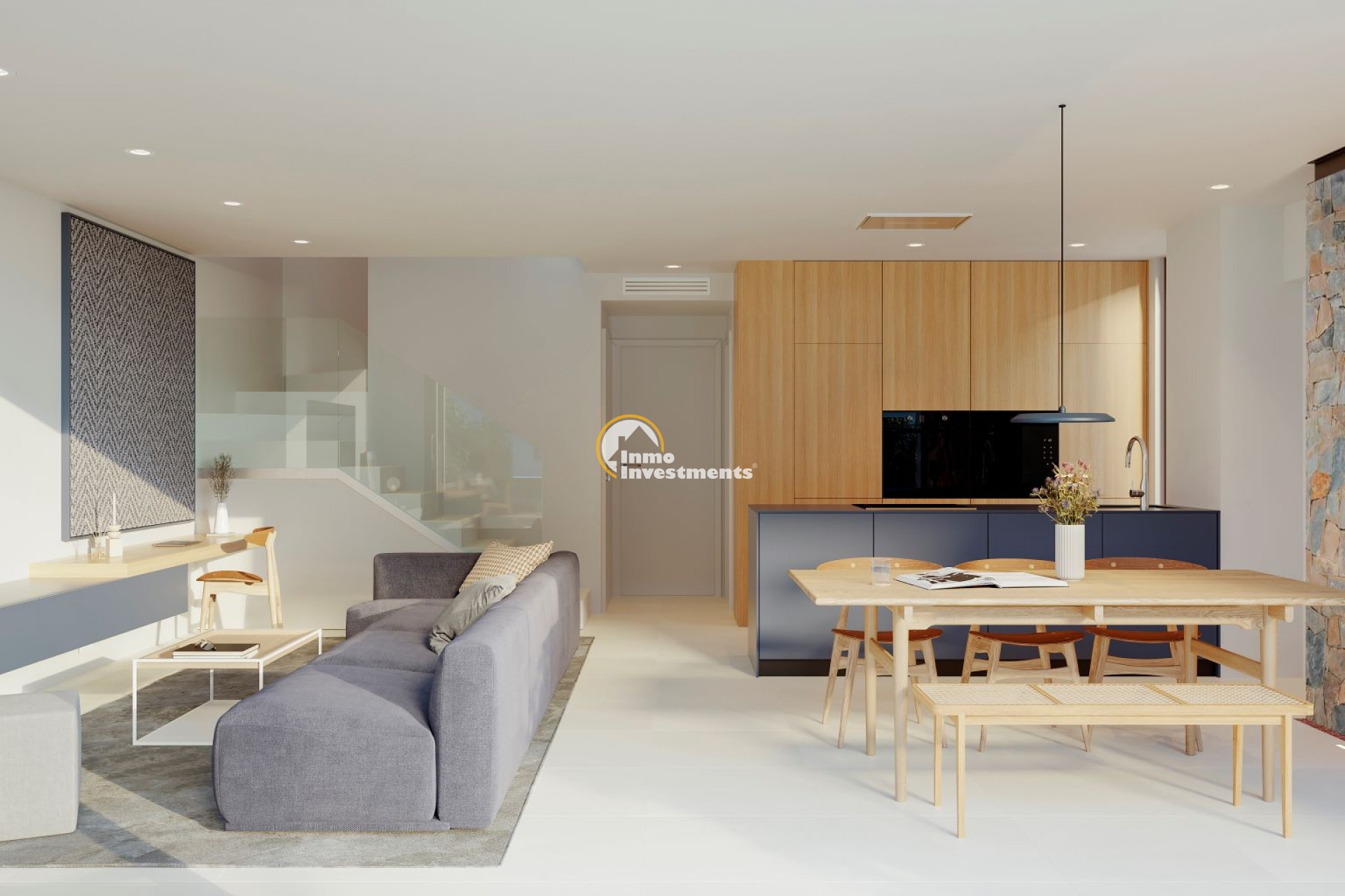 The interiors of these villas are designed to offer maximum comfort and functionality, with high quality materials and a layout that makes the most of natural light: 2 or 3 bedrooms with fitted wardrobes, designed to offer privacy and comfort. 2 complete bathrooms + 1 additional toilet, equipped with electric underfloor heating and premium materials. Open plan living/dining room, which connects to the kitchen and outdoor terrace for a feeling of spaciousness. Fully fitted kitchen with panelled cupboards and top of the range appliances (including ceramic hob, oven, microwave and extractor hood). Large floor-to-ceiling windows, allowing a direct connection to the outside and making the most of the natural light. Private basement, ideal as additional space for a games room, gym or leisure area. Pre-installation of ducted air conditioning and heat pump system for hot water. LED lighting package and domotic system that allows control of lighting and air conditioning from a mobile phone. The clean lines, high quality materials and neutral colours create a modern and welcoming atmosphere that invites you to relax and enjoy.