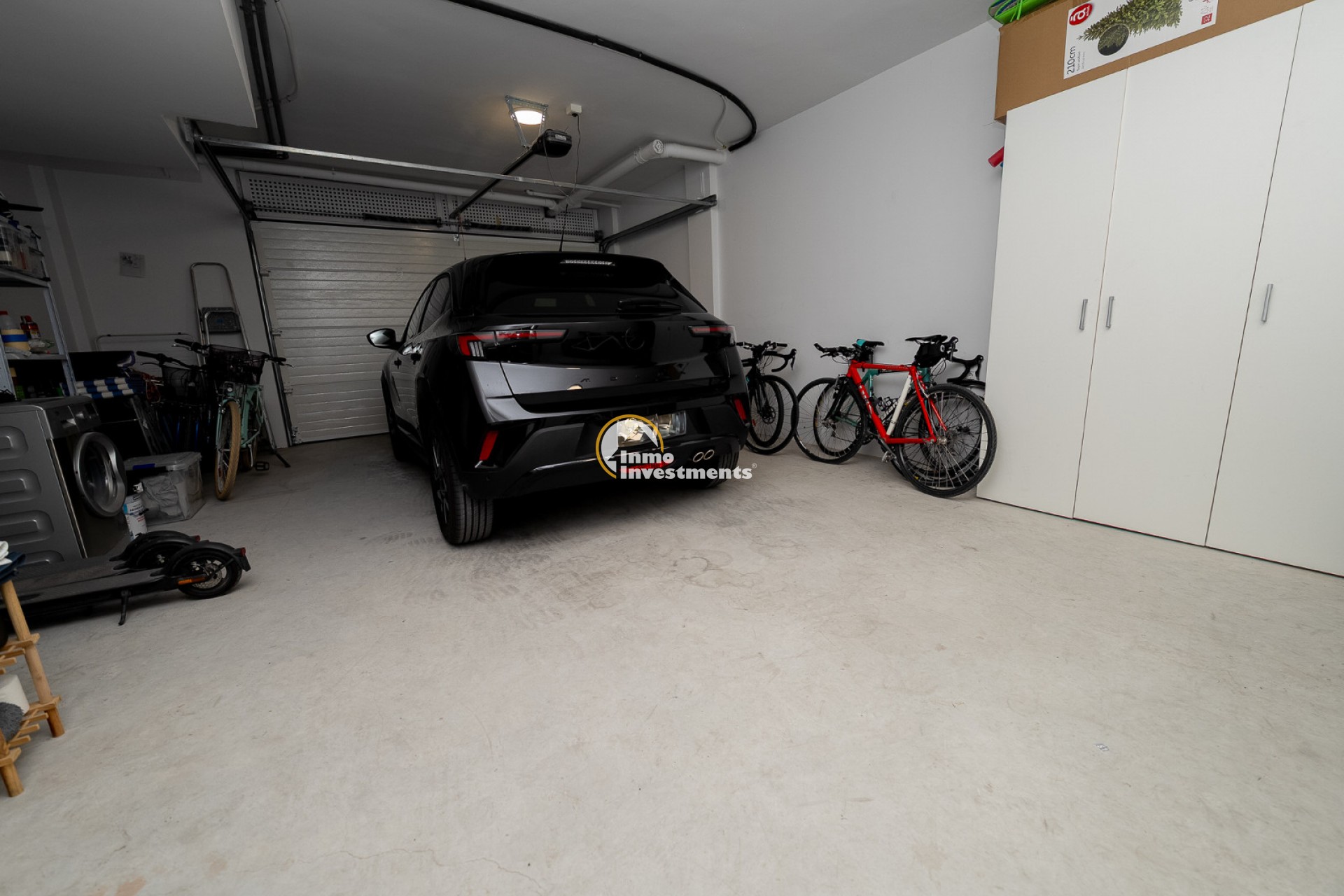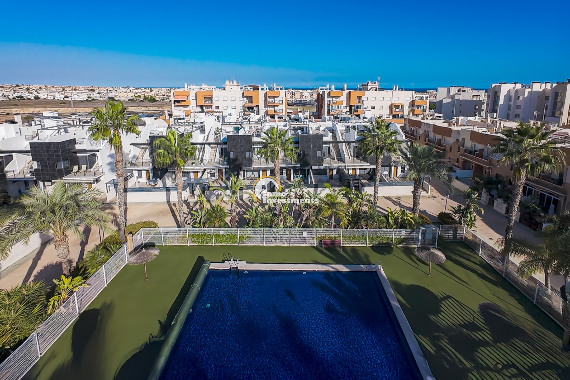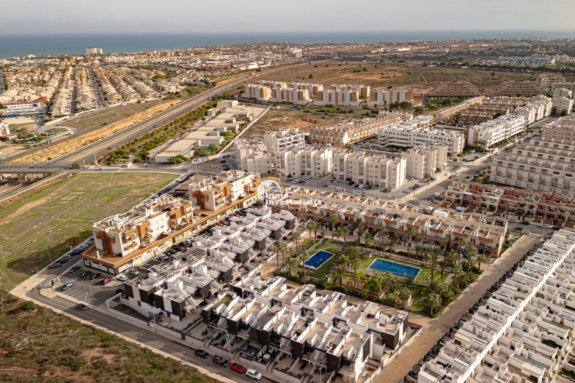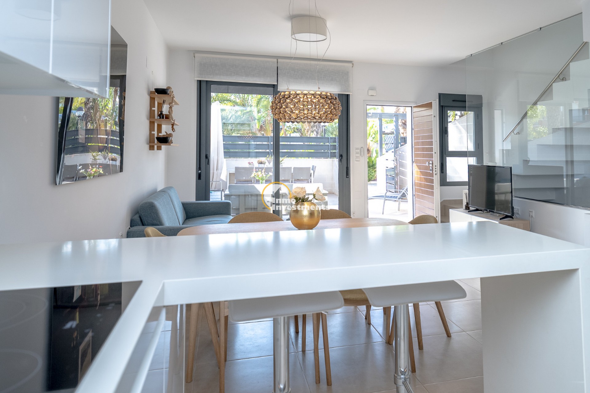 Located in the desirable area of Los Dolses, this well-presented townhouse is set across three levels and combines modern design with practical living. The main floor offers a bright open-plan living and dining area with a contemporary kitchen, an adjoining utility room with a fitted roof, and direct access from the living room to a terrace with an electric awning. The home comprises three double bedrooms and three bathrooms. The spacious underbuild, with heating cables, extra air conditioning, and direct access to the garage, is currently used as an additional living room and bedroom, adding valuable versatility. Steel railings have been fitted along the stairs for added safety. Outdoor living is equally inviting, with a private solarium, terraces overlooking the communal pool, and landscaped green areas within the community. The property is conveniently located within walking distance of local supermarkets, cafés, and restaurants. La Zenia Boulevard shopping centre is only a short bike ride away, while the Blue Flag beaches of the Orihuela Costa can be reached in just a few minutes by car or a pleasant walk.
