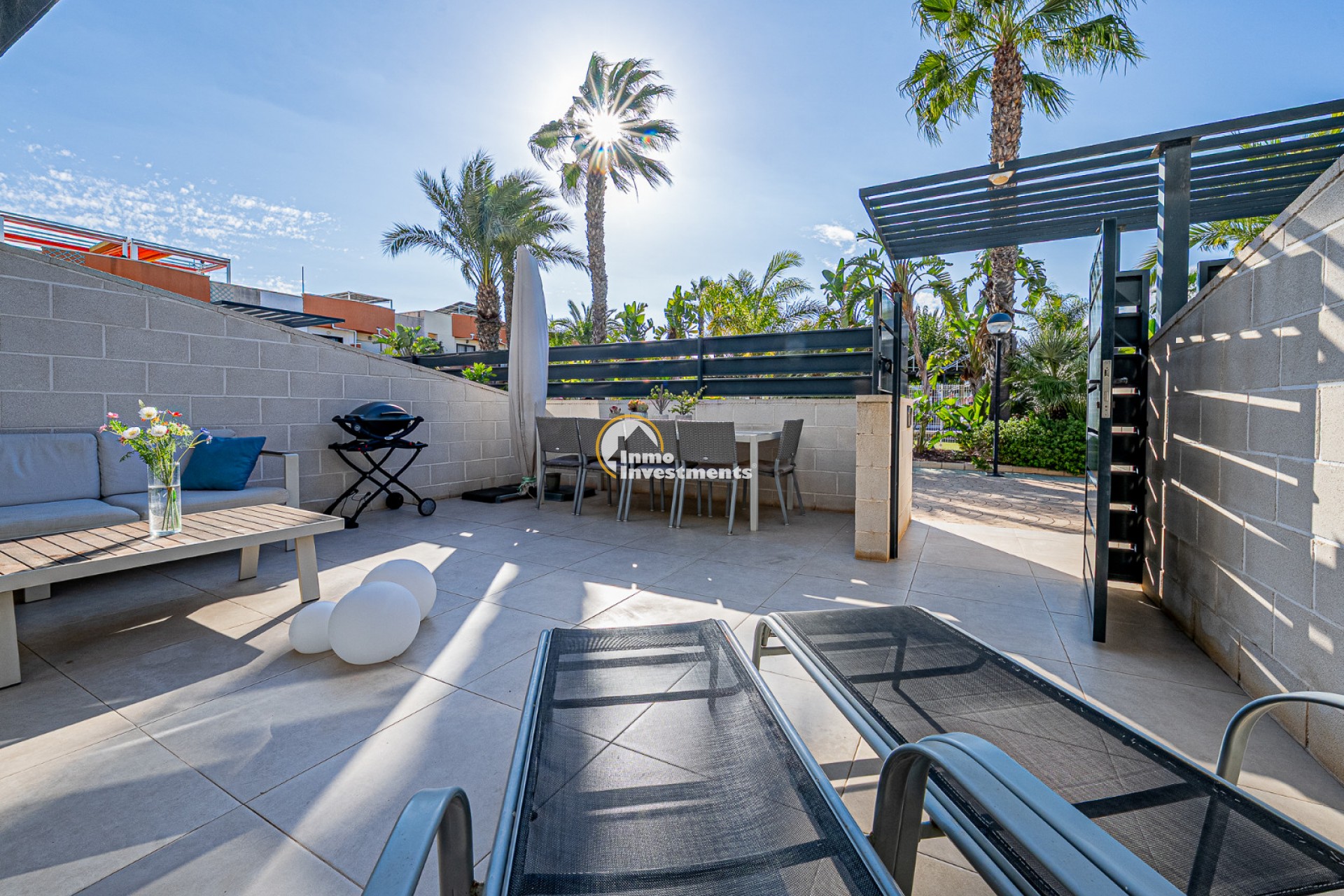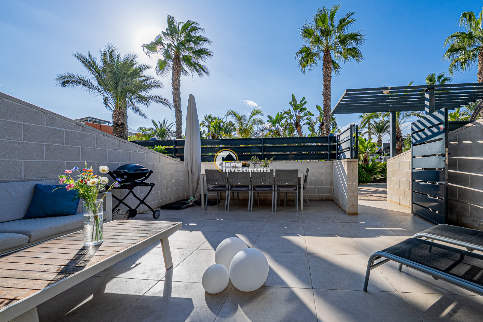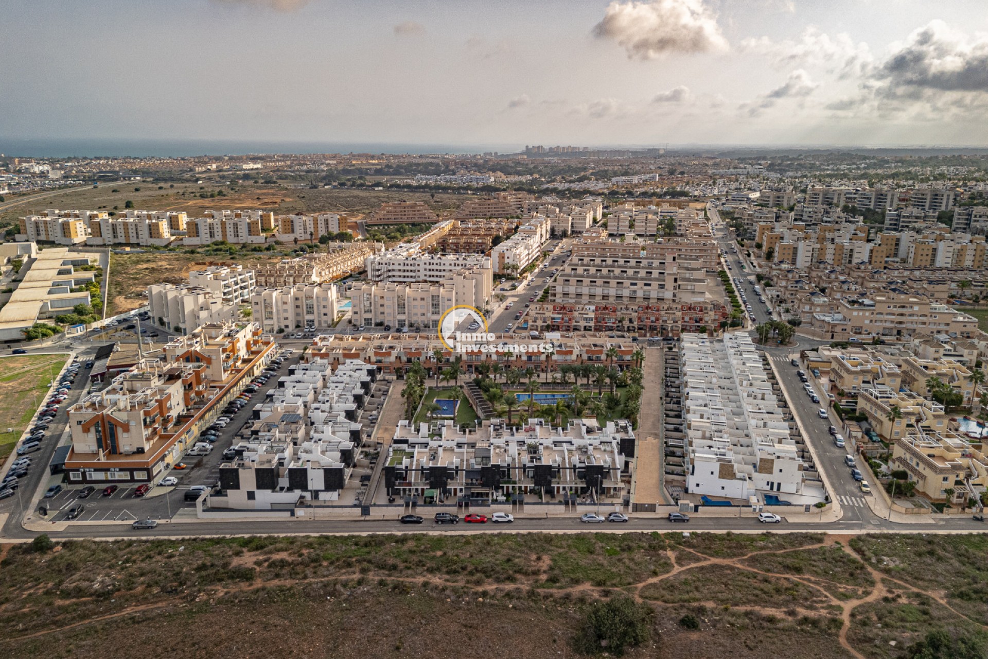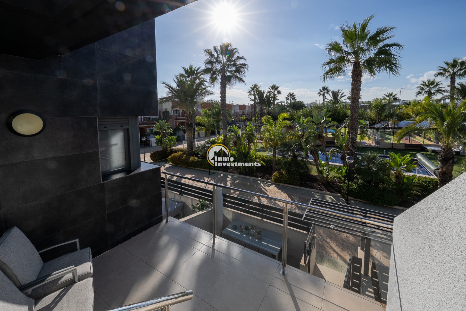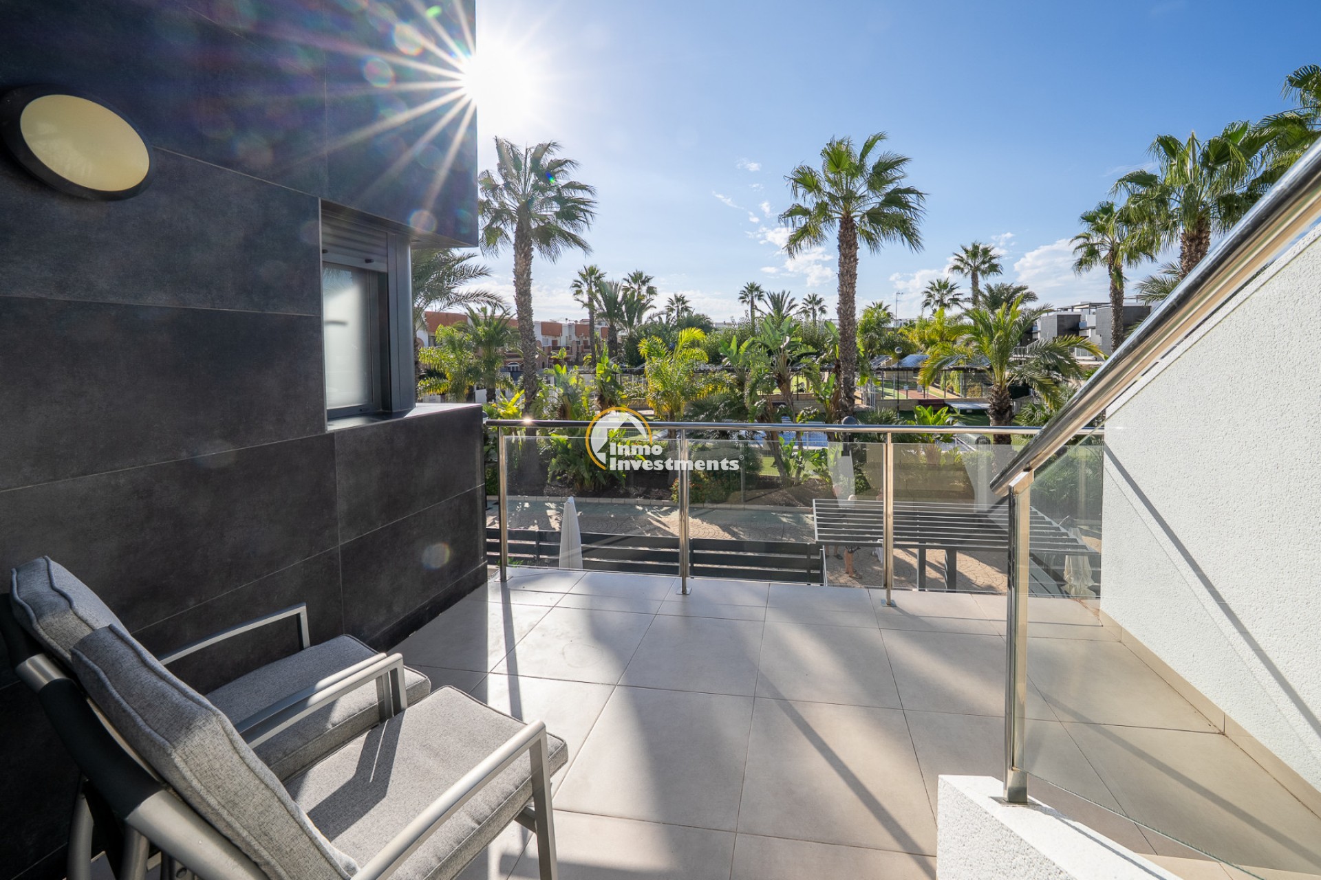 Located in the desirable area of Los Dolses, this well-presented townhouse is set across three levels and combines modern design with practical living. The main floor offers a bright open-plan living and dining area with a contemporary kitchen, an adjoining utility room with a fitted roof, and direct access from the living room to a terrace with an electric awning. The home comprises three double bedrooms and three bathrooms. The spacious underbuild, with heating cables, extra air conditioning, and direct access to the garage, is currently used as an additional living room and bedroom, adding valuable versatility. Steel railings have been fitted along the stairs for added safety. Outdoor living is equally inviting, with a private solarium, terraces overlooking the communal pool, and landscaped green areas within the community. The property is conveniently located within walking distance of local supermarkets, cafés, and restaurants. La Zenia Boulevard shopping centre is only a short bike ride away, while the Blue Flag beaches of the Orihuela Costa can be reached in just a few minutes by car or a pleasant walk.