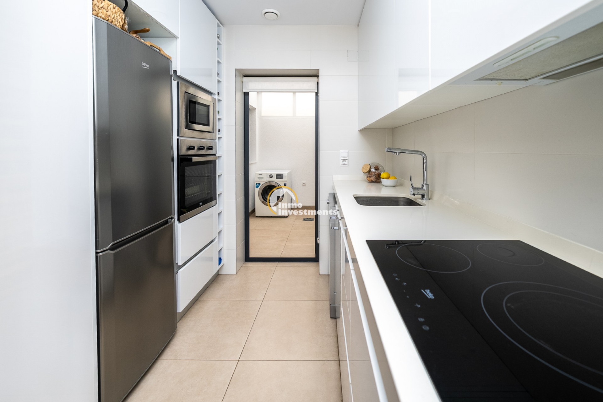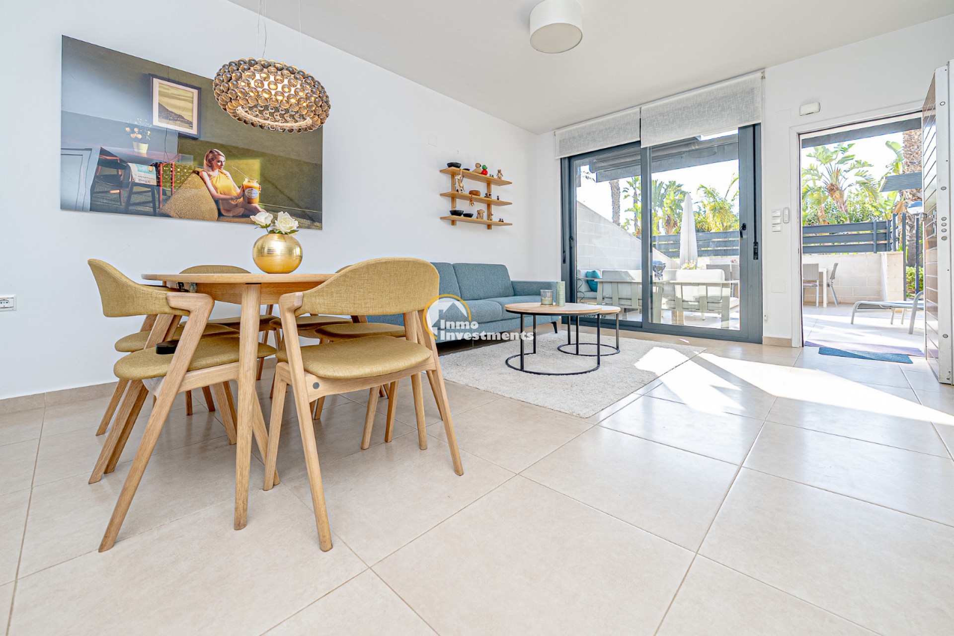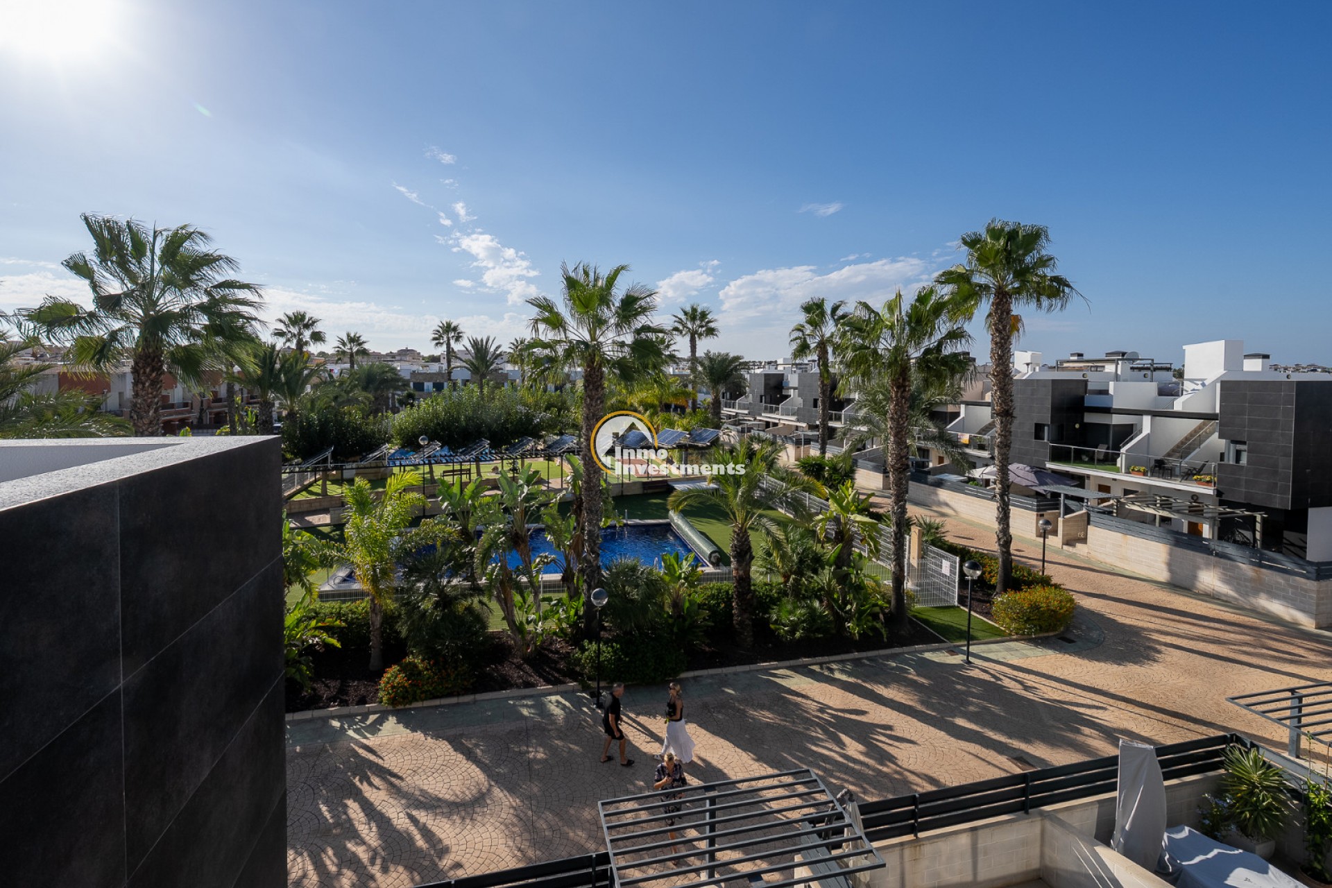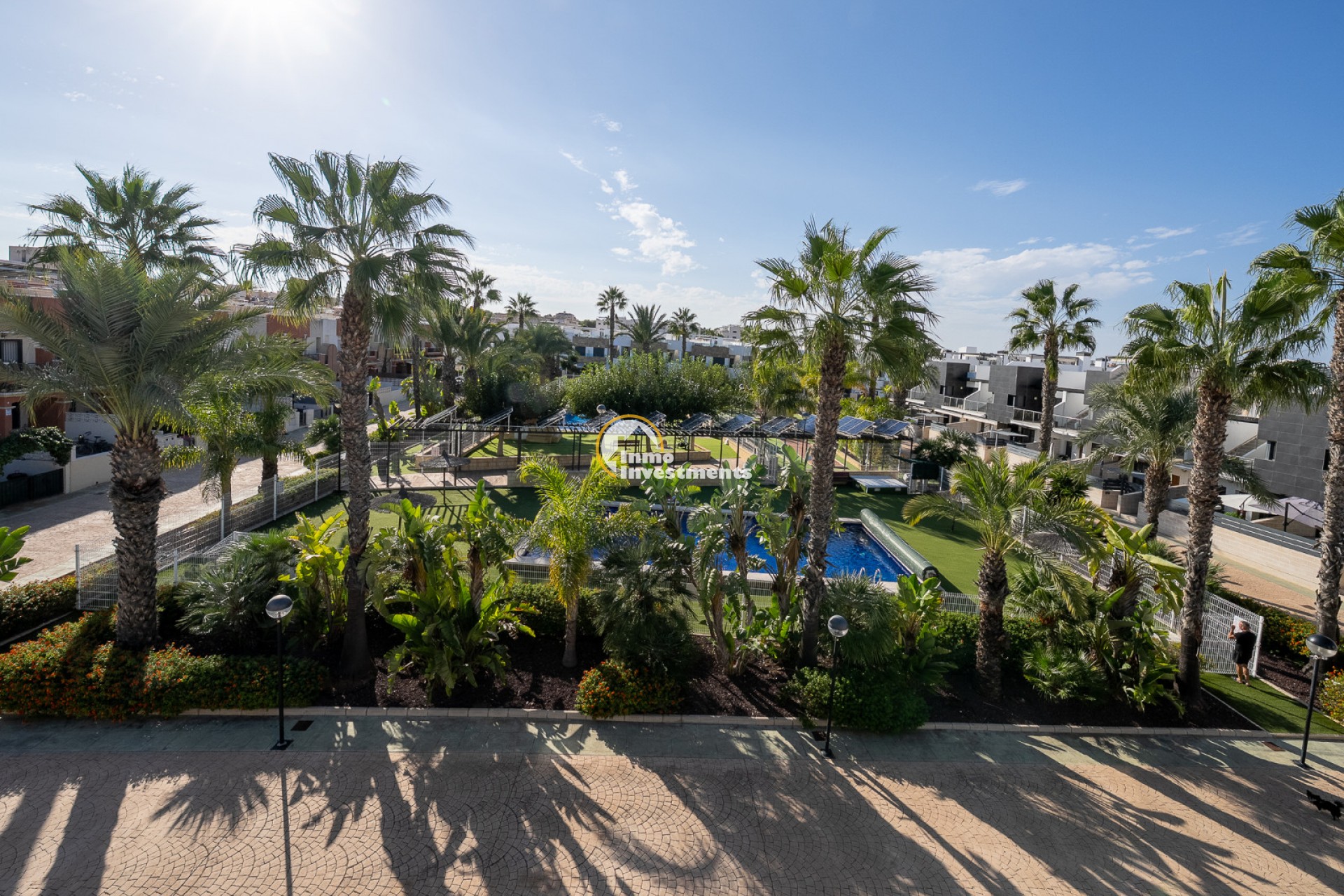 Located in the desirable area of Los Dolses, this well-presented townhouse is set across three levels and combines modern design with practical living. The main floor offers a bright open-plan living and dining area with a contemporary kitchen, an adjoining utility room with a fitted roof, and direct access from the living room to a terrace with an electric awning. The home comprises three double bedrooms and three bathrooms. The spacious underbuild, with heating cables, extra air conditioning, and direct access to the garage, is currently used as an additional living room and bedroom, adding valuable versatility. Steel railings have been fitted along the stairs for added safety. Outdoor living is equally inviting, with a private solarium, terraces overlooking the communal pool, and landscaped green areas within the community. The property is conveniently located within walking distance of local supermarkets, cafés, and restaurants. La Zenia Boulevard shopping centre is only a short bike ride away, while the Blue Flag beaches of the Orihuela Costa can be reached in just a few minutes by car or a pleasant walk.
