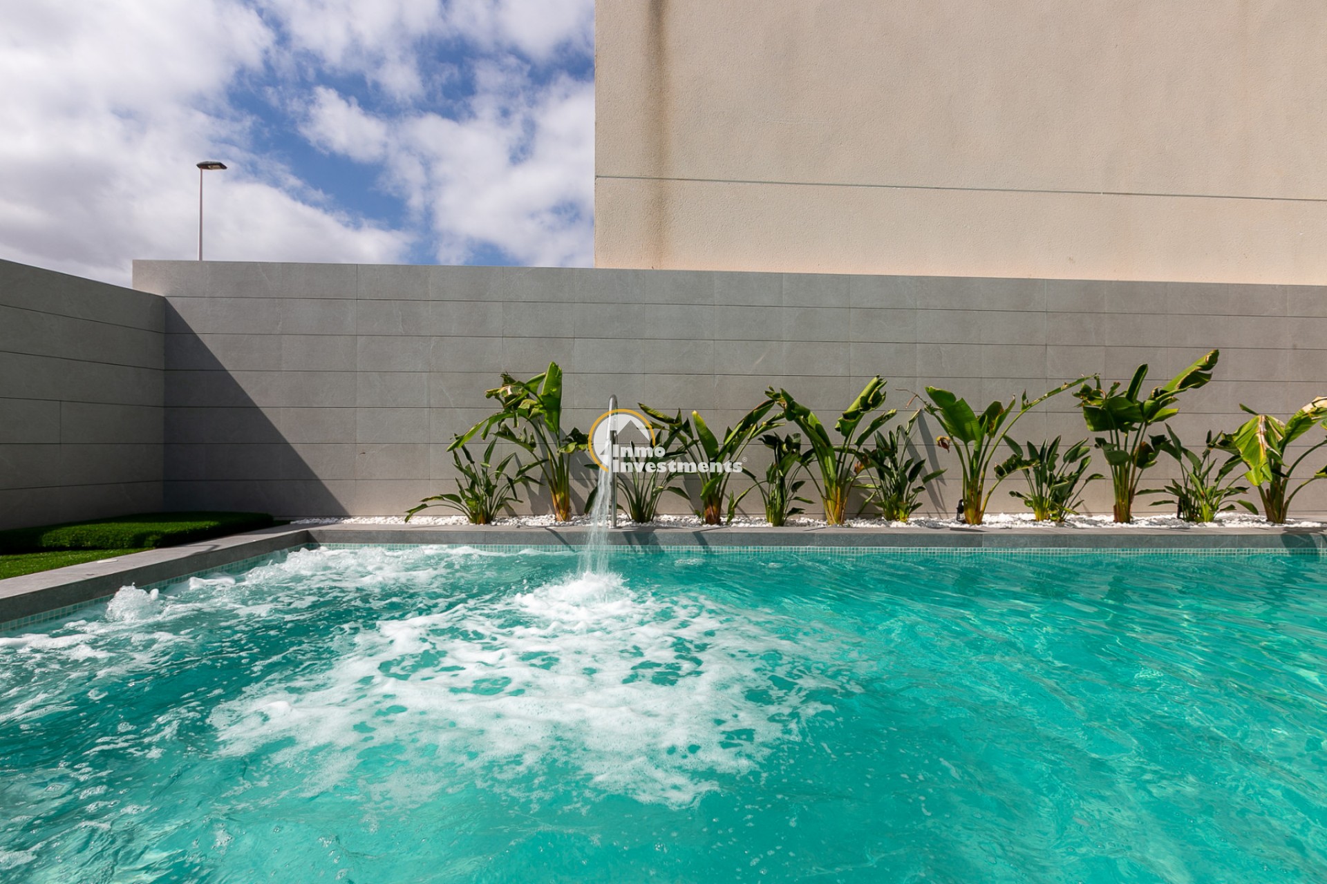 Private pool with hydromassage and waterfall.