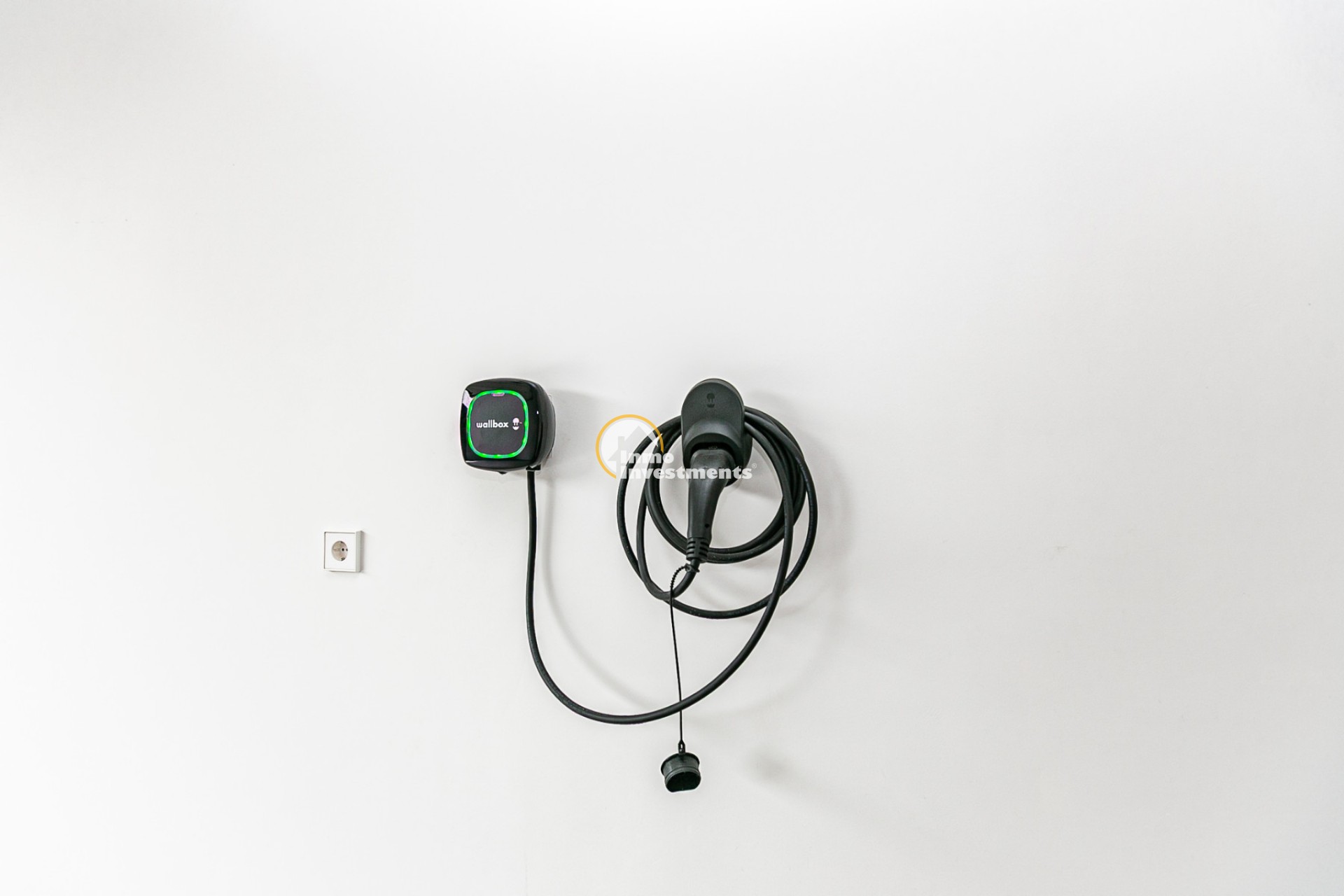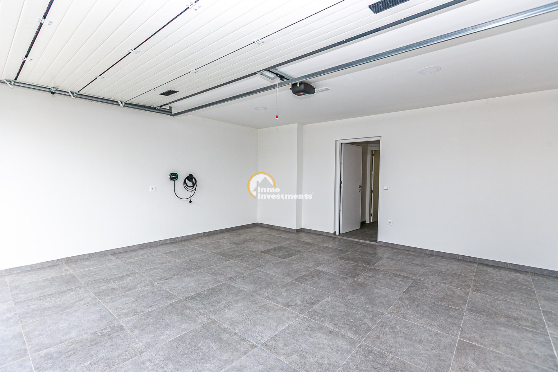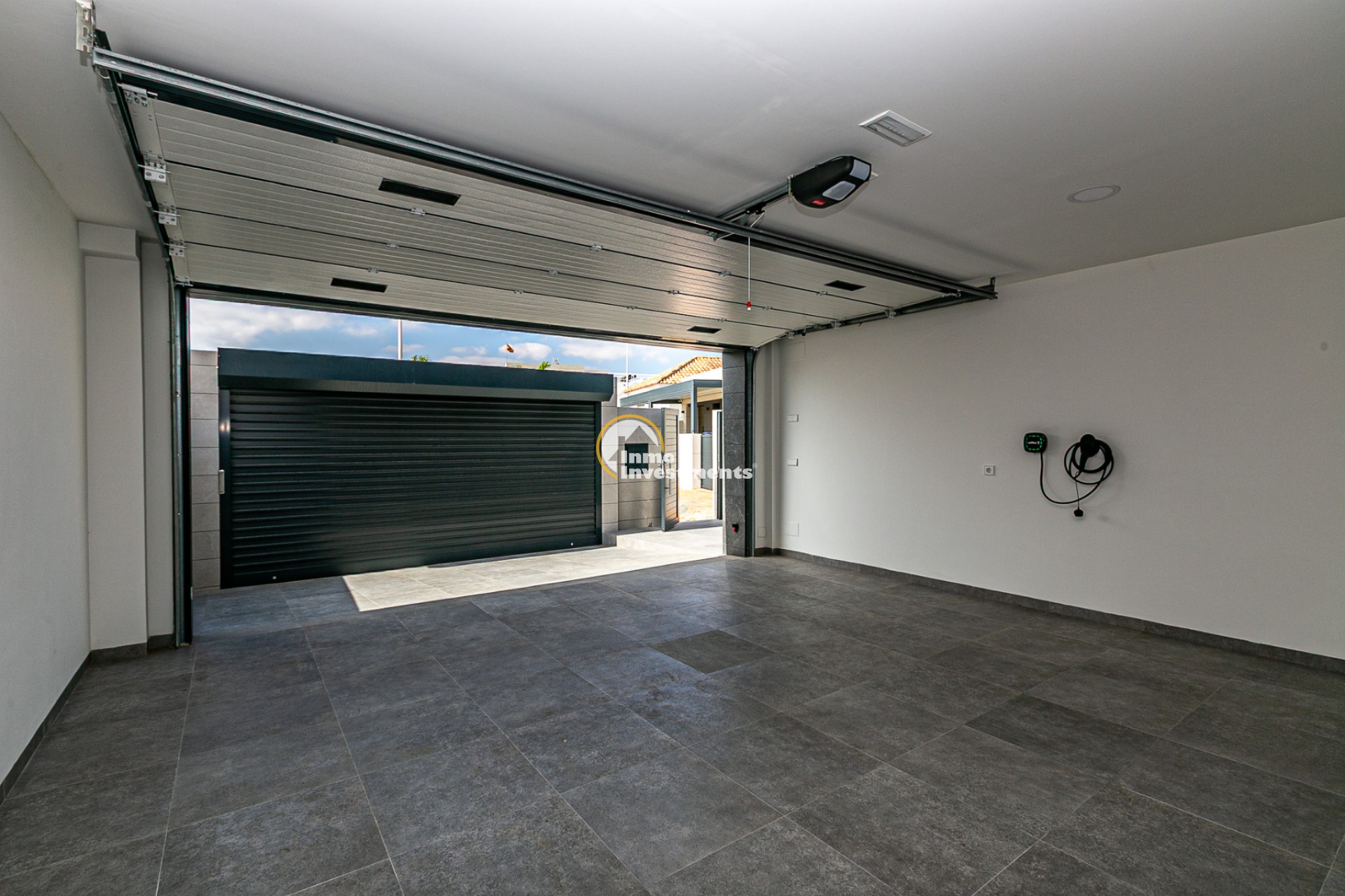 Covered garage with electric vehicle charging point.