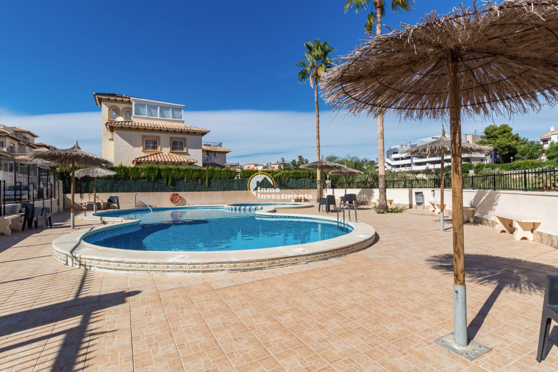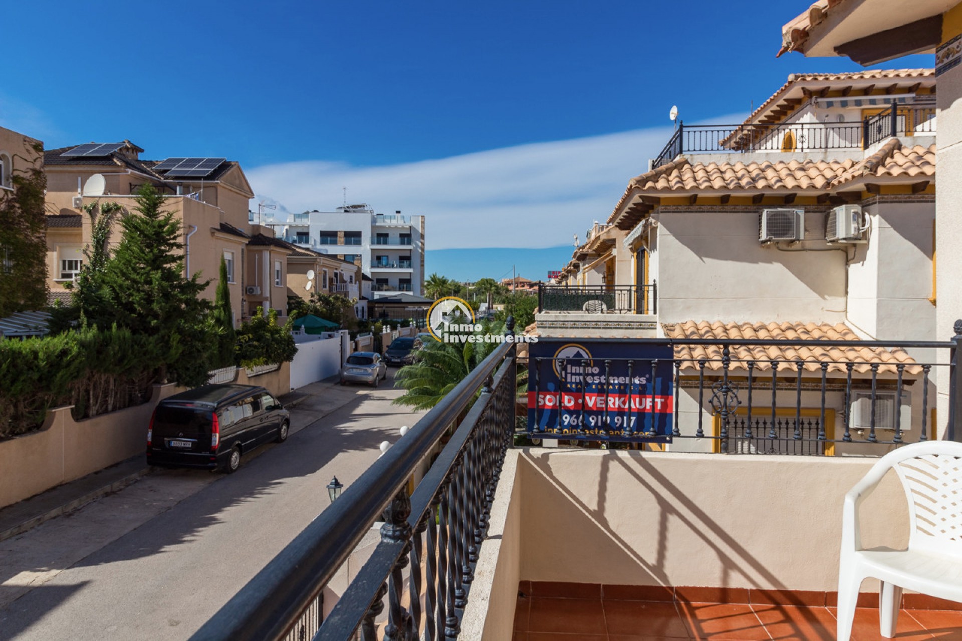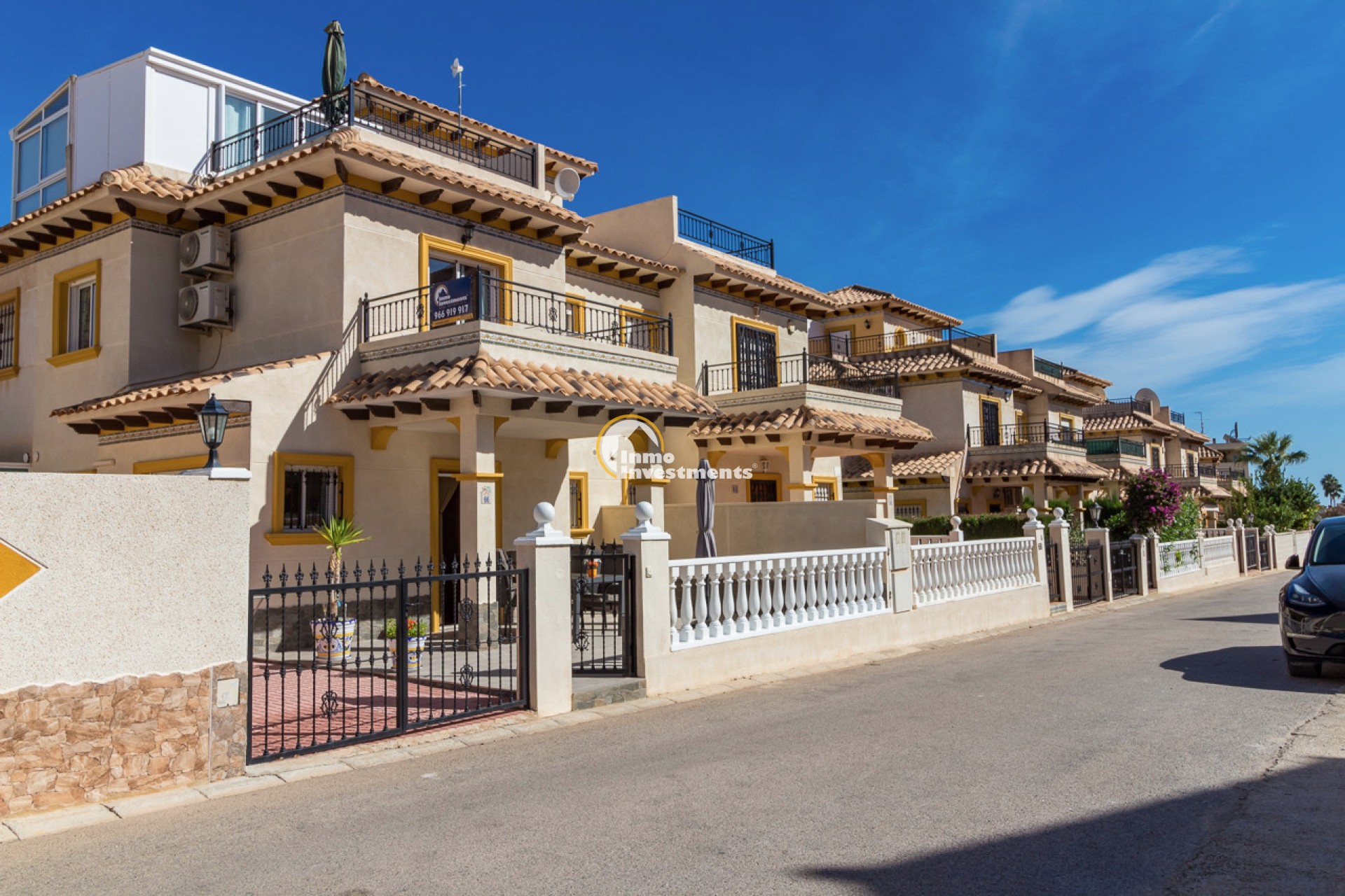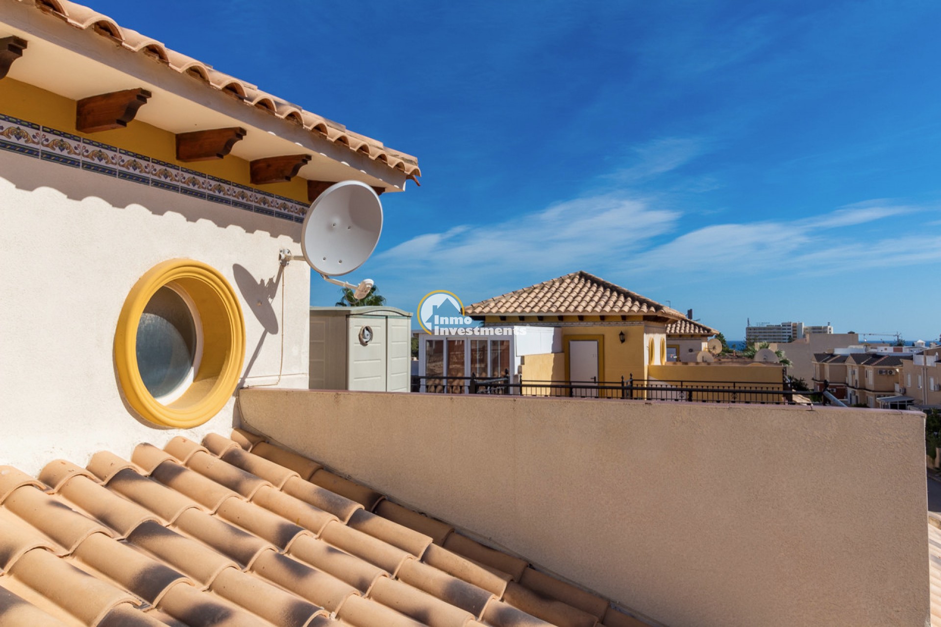 Outstanding location for this San Jose quad villa, located on the border of La Zenia and Playa Flamenca, located on the highly sought after Villas San Jose complex. The spacious villa offers 2 double bedrooms, master bedroom with sunny balcony terrace with lateral sea views, full family bathroom, downstairs WC, spacious lounge/dining room and fully equipped kitchen with breakfast bar. The lounge and dining area can easily be separated to add in a third downstairs bedroom. The villa also boasts a bonus room on the top floor with access to the sun roof terrace , this is currently serving as a bedroom but could equally be used as a studio, office or simply additional storage space. Outside space boasts, patio garden with renovated tile work giving it a clean and modern feel and on-site parking. The property is sold fully furnished as seen with extras including air conditioning, security shutters and grilles. Highly sought after residential complex with communal pool for adults and children. Walking distance to all necessary local amenities including the La Zenia Boulevard shopping mall, all local amenities of Playa Flamenca,the La Zenia beach and much more. Viewing highly recommended for this excellent value for money property. Contact Inmo Investments today for your viewing appointment.