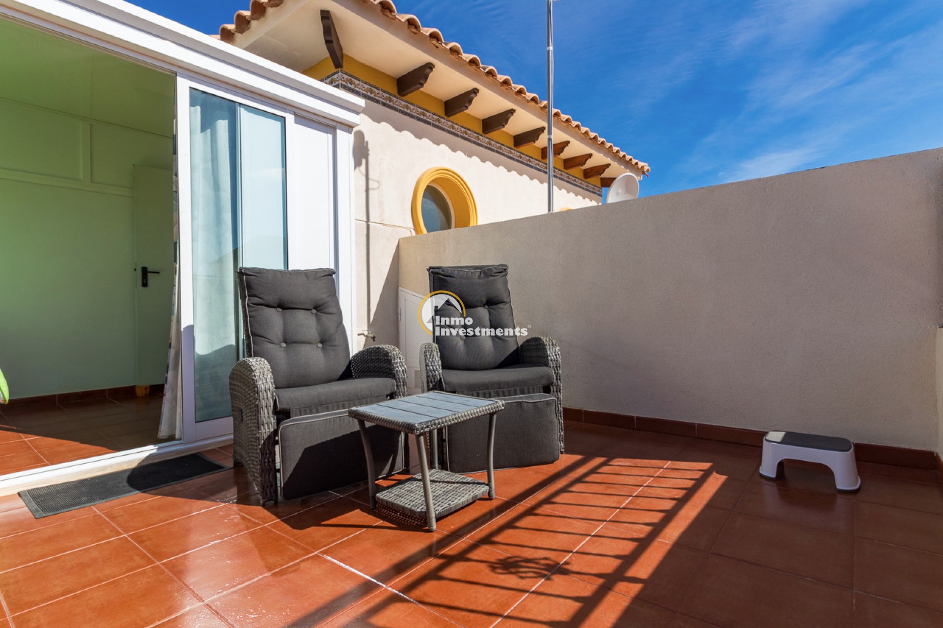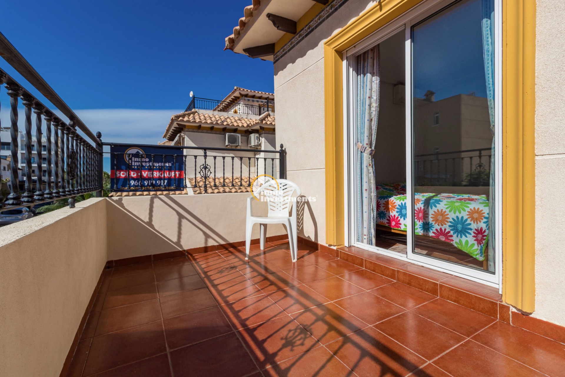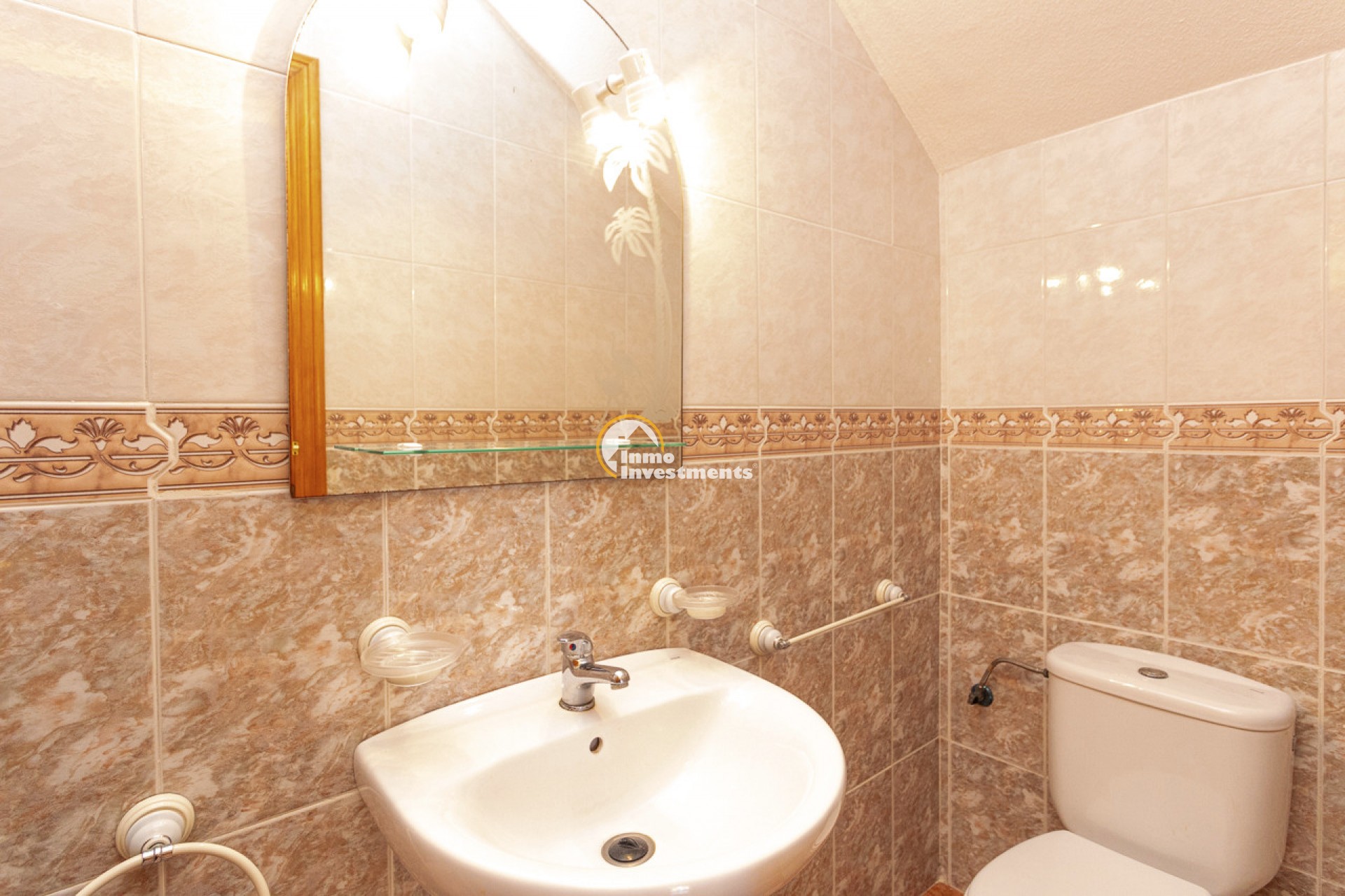 Outstanding location for this San Jose quad villa, located on the border of La Zenia and Playa Flamenca, located on the highly sought after Villas San Jose complex. The spacious villa offers 2 double bedrooms, master bedroom with sunny balcony terrace with lateral sea views, full family bathroom, downstairs WC, spacious lounge/dining room and fully equipped kitchen with breakfast bar. The lounge and dining area can easily be separated to add in a third downstairs bedroom. The villa also boasts a bonus room on the top floor with access to the sun roof terrace , this is currently serving as a bedroom but could equally be used as a studio, office or simply additional storage space. Outside space boasts, patio garden with renovated tile work giving it a clean and modern feel and on-site parking. The property is sold fully furnished as seen with extras including air conditioning, security shutters and grilles. Highly sought after residential complex with communal pool for adults and children. Walking distance to all necessary local amenities including the La Zenia Boulevard shopping mall, all local amenities of Playa Flamenca,the La Zenia beach and much more. Viewing highly recommended for this excellent value for money property. Contact Inmo Investments today for your viewing appointment.
