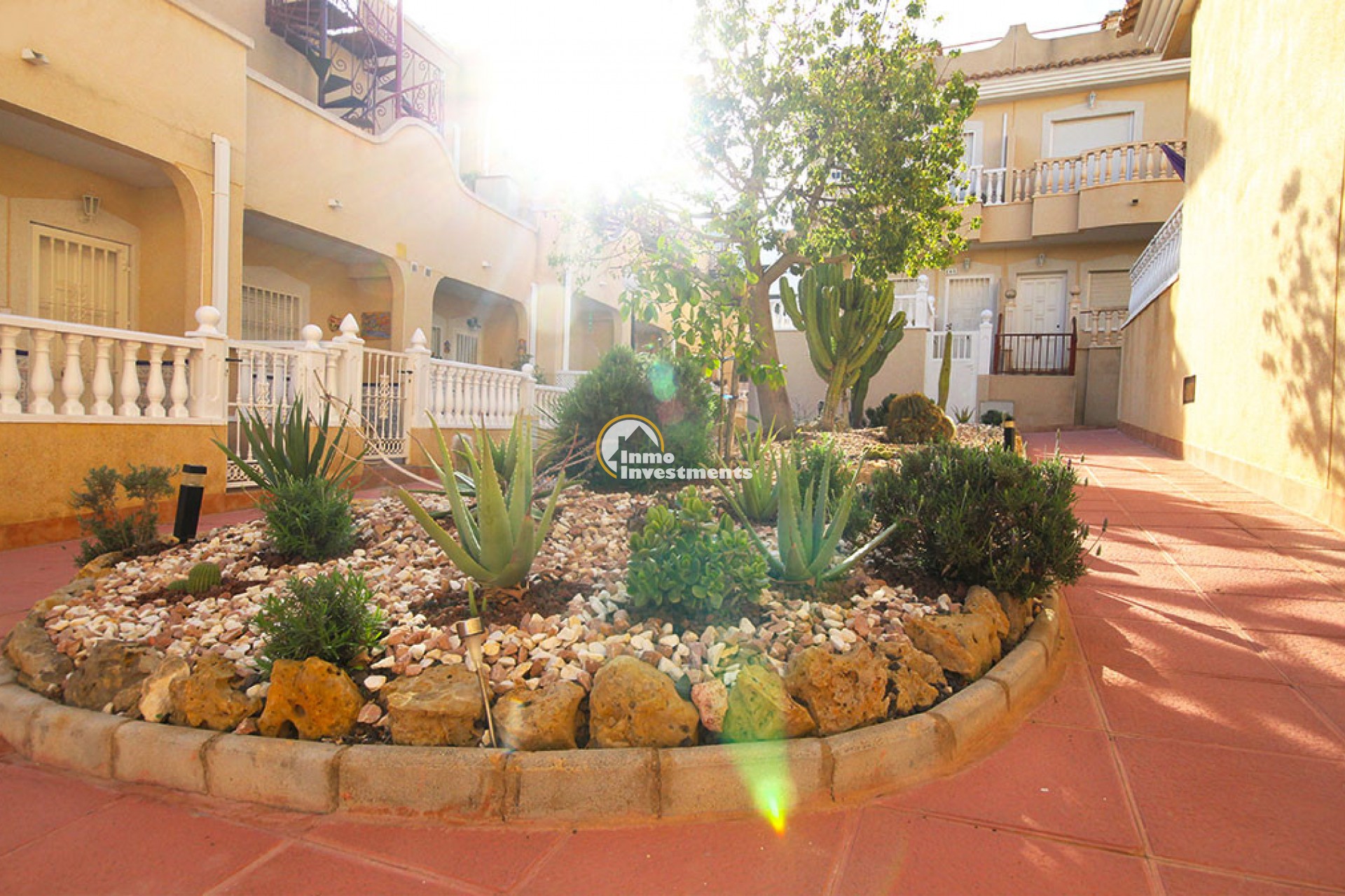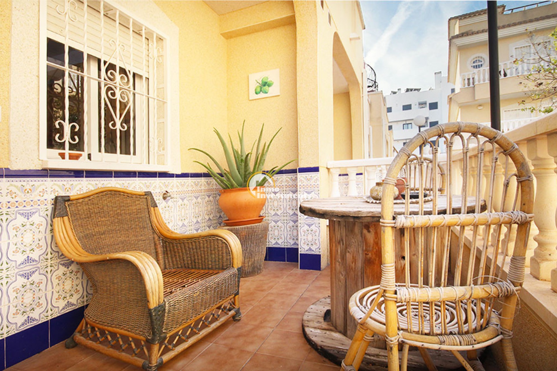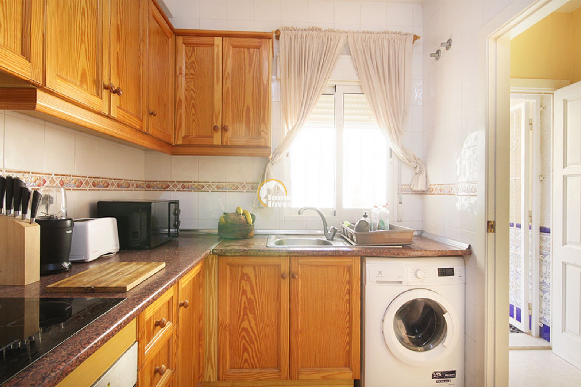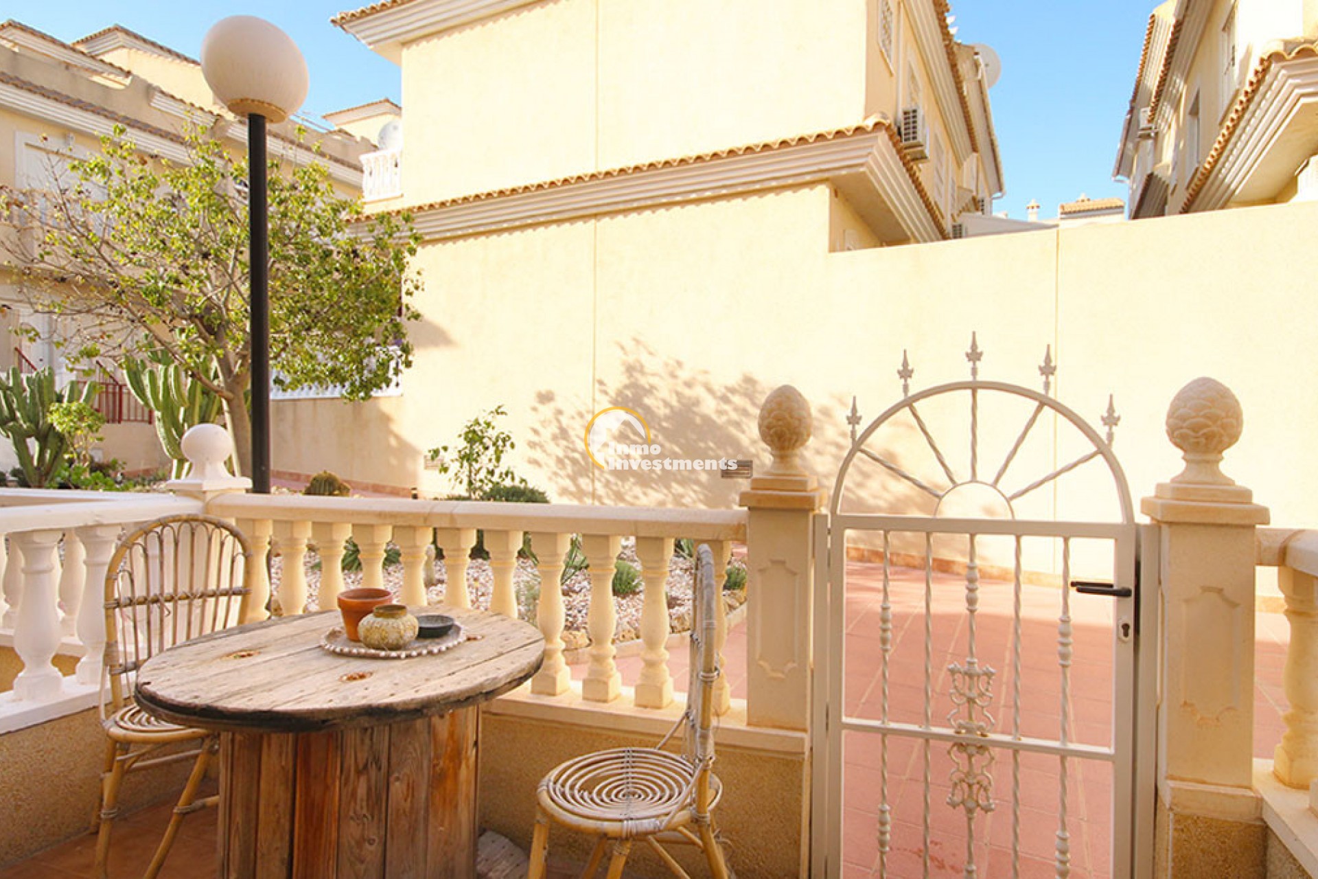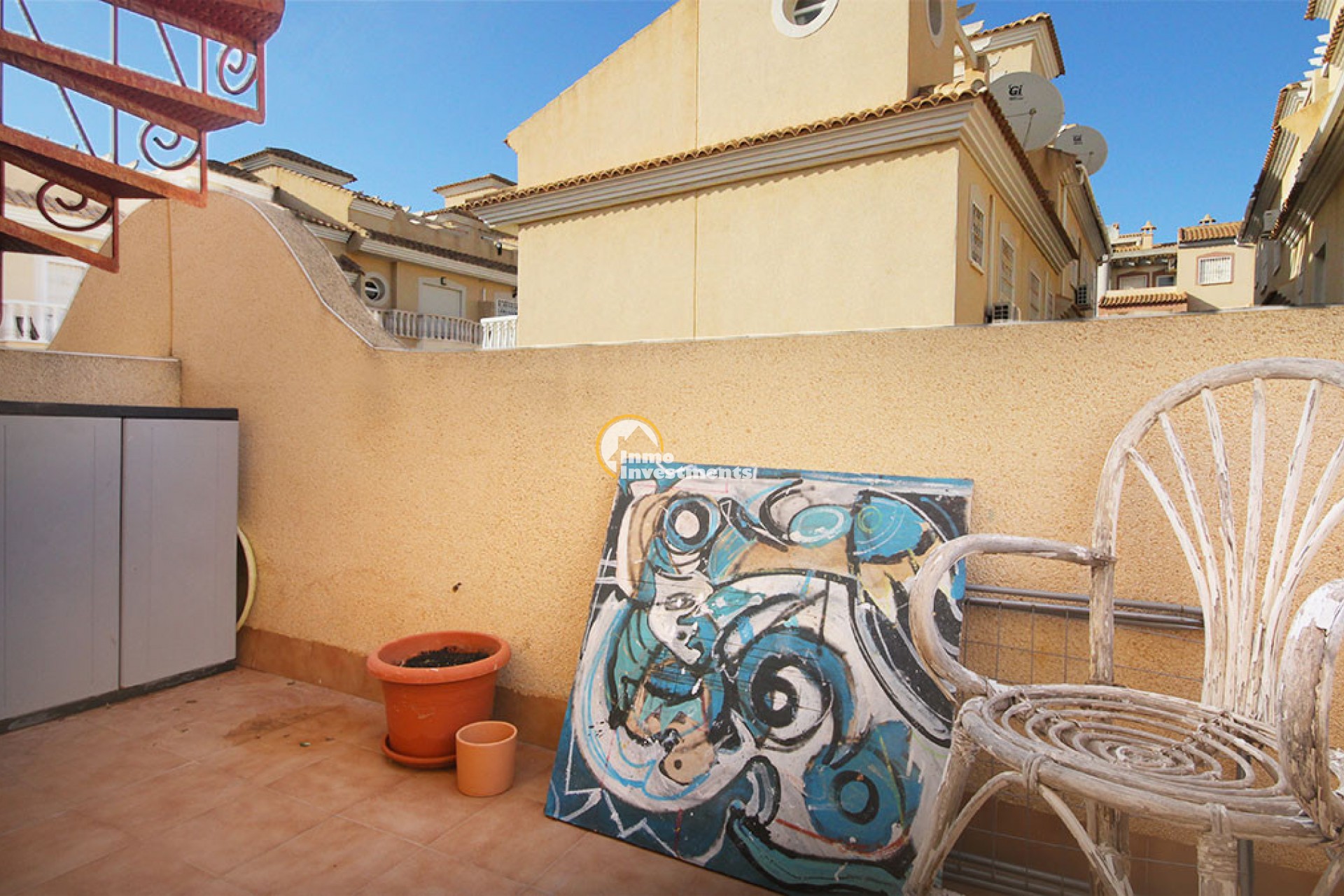 South facing town house in Las Filipinas, Villamartin offering 3 bedrooms and 2 bathrooms, lounge/dining room and kitchen. From the twin bedroom on the first floor there is a terrace overlooking a rock garden. This terrace has spiral stair-case access that leads up to the 33m² solarium offering more sunshine and views over the ramblas. From the street there is a gate opening onto a 20m² south-facing front garden that gets the sun all day long. This is a low maintenance paved space with potted plants. Sold part furnished including extras such as air conditioning. Set on a community with swiming pool for residents in Las Filipinas, Villamartin. There is a choice of clean, sandy, family friendly beaches just a 5 minute drive. 4 golf courses; Las Ramblas, Campoamor, Las Colinas and Villamartin are all within 10 minutes drive. The well known La Zenia Boulevard is also only a 7 minute drive away.