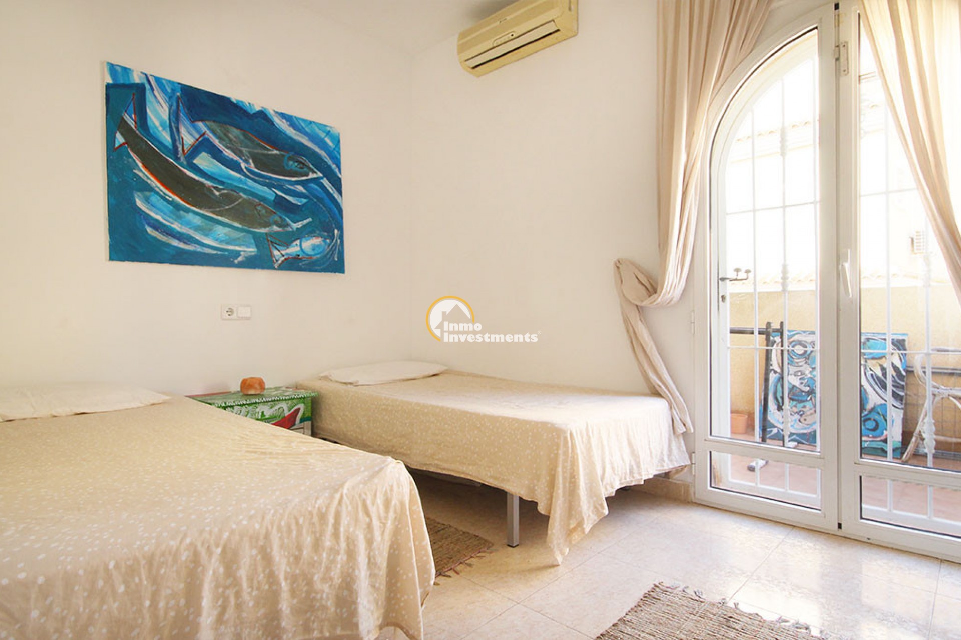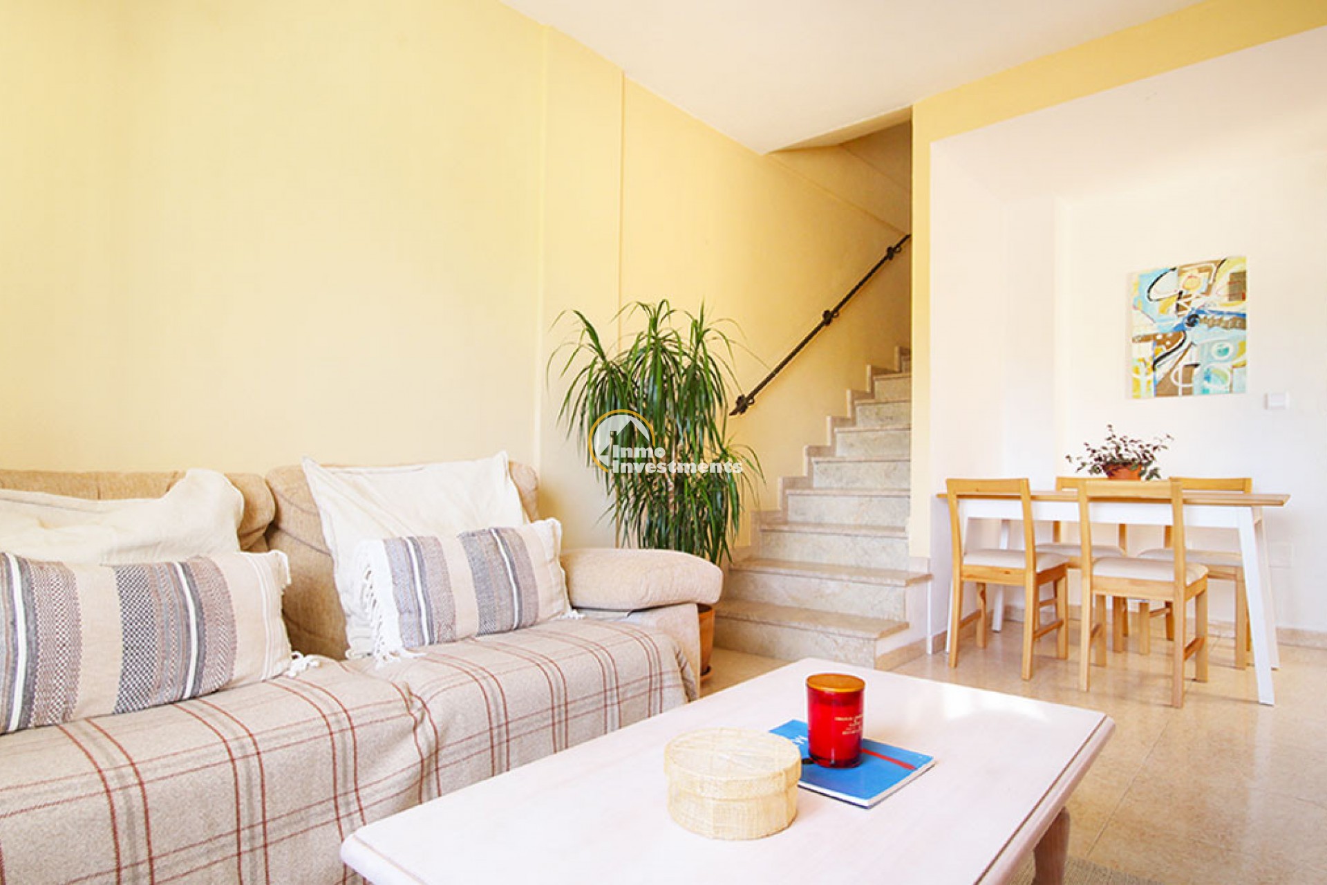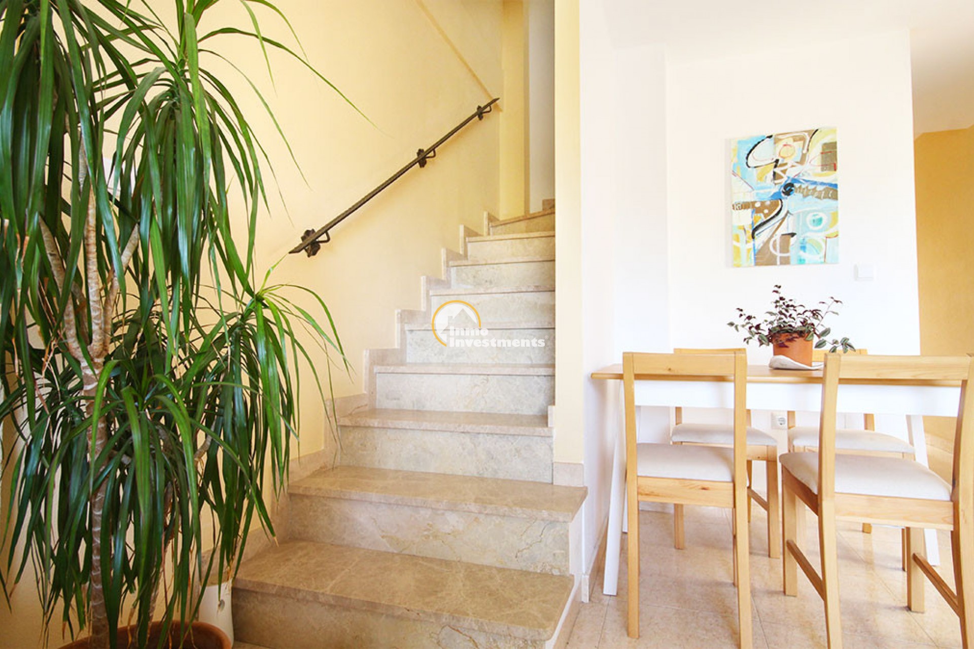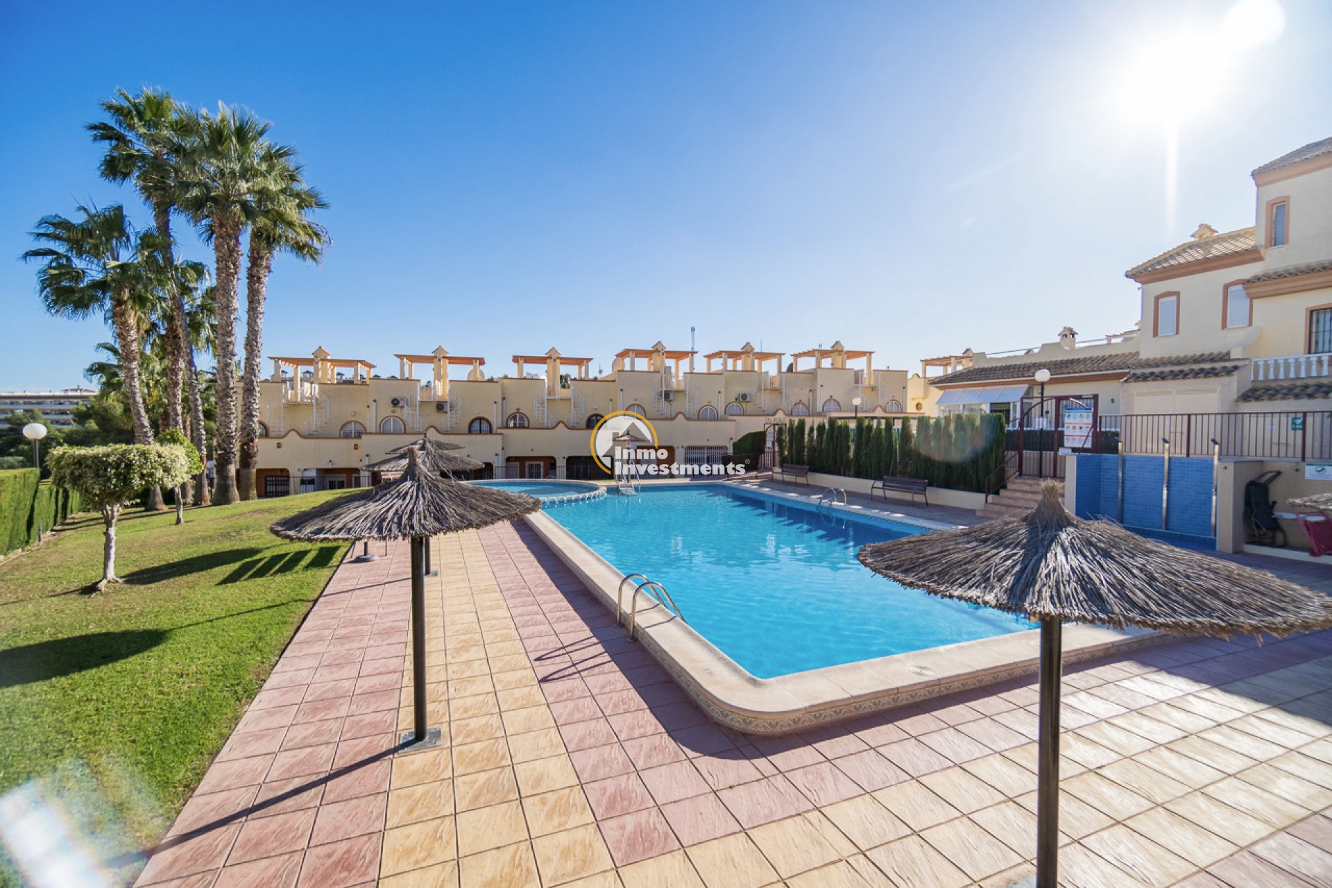 South facing town house in Las Filipinas, Villamartin offering 3 bedrooms and 2 bathrooms, lounge/dining room and kitchen. From the twin bedroom on the first floor there is a terrace overlooking a rock garden. This terrace has spiral stair-case access that leads up to the 33m² solarium offering more sunshine and views over the ramblas. From the street there is a gate opening onto a 20m² south-facing front garden that gets the sun all day long. This is a low maintenance paved space with potted plants. Sold part furnished including extras such as air conditioning. Set on a community with swiming pool for residents in Las Filipinas, Villamartin. There is a choice of clean, sandy, family friendly beaches just a 5 minute drive. 4 golf courses; Las Ramblas, Campoamor, Las Colinas and Villamartin are all within 10 minutes drive. The well known La Zenia Boulevard is also only a 7 minute drive away.