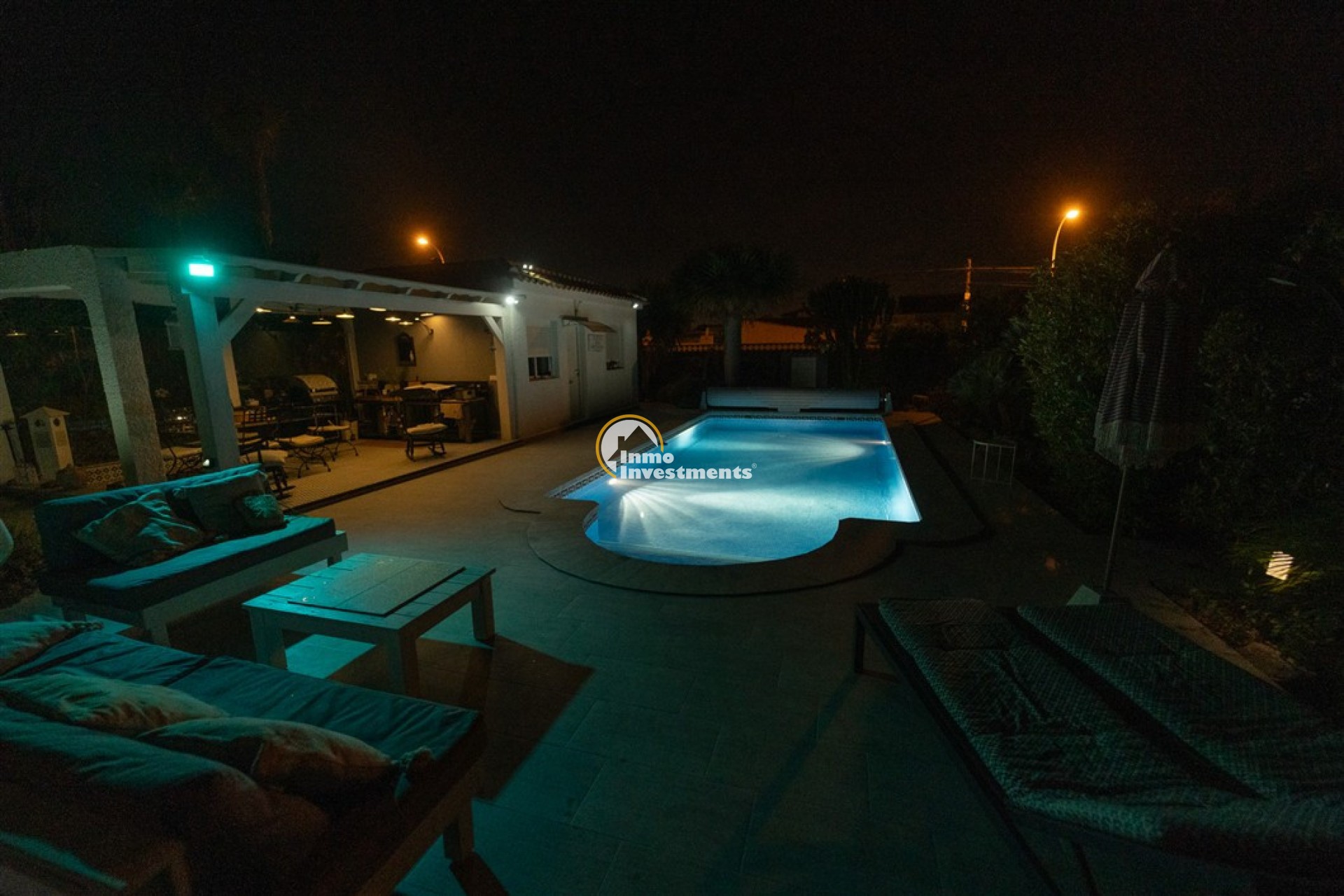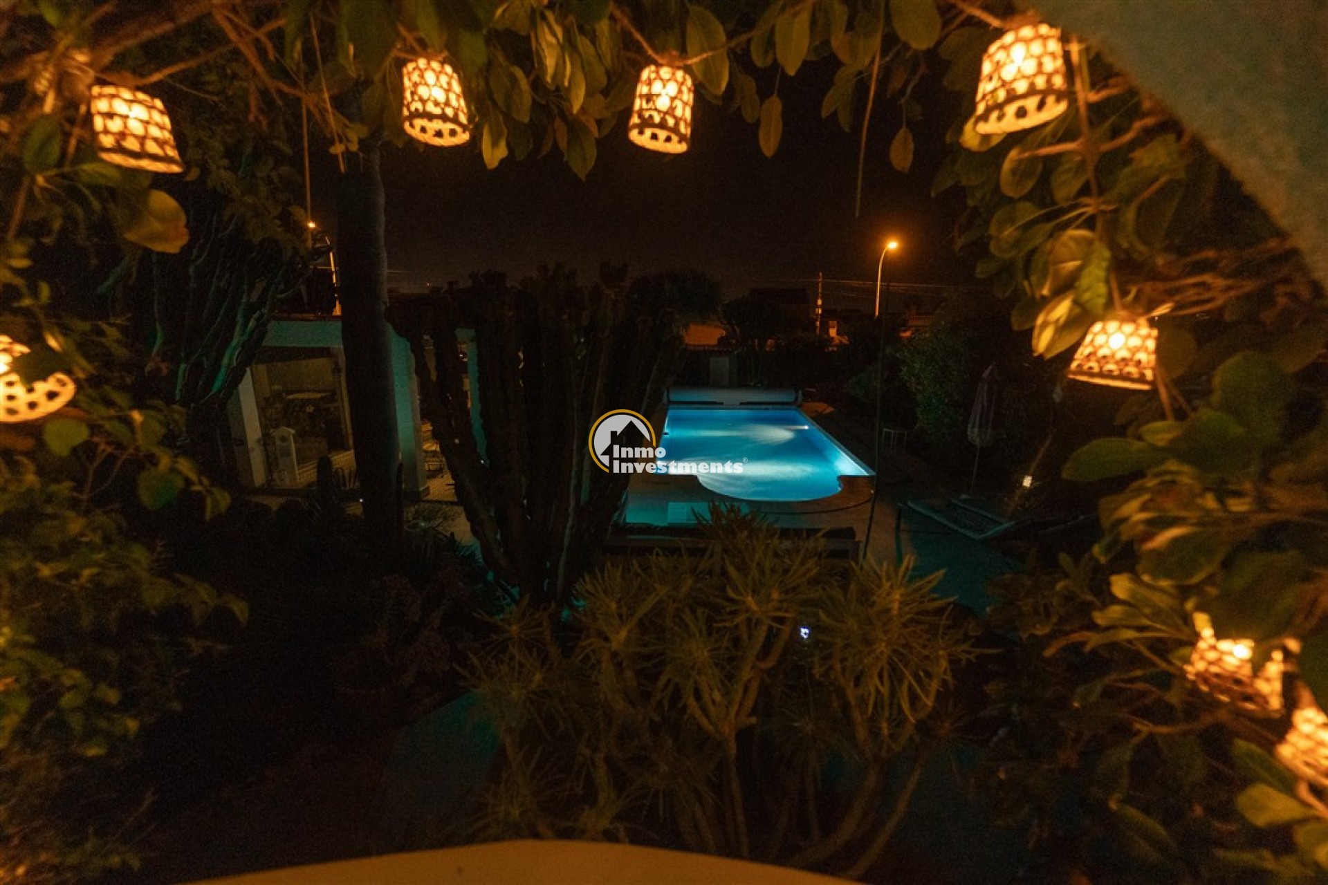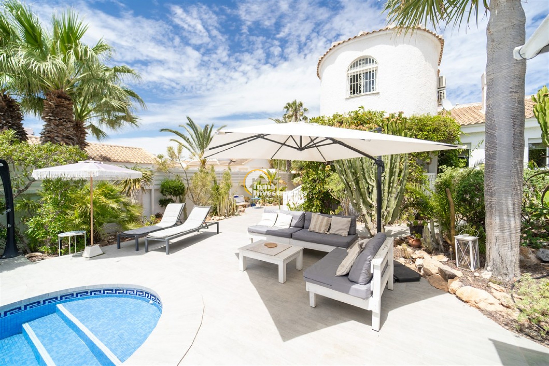 This detached villa is located in the established residential area of La Siesta and benefits from a south-facing orientation, providing good natural light throughout the day. The property offers 140 m² of built space on a 966 m² plot and includes four bedrooms, three bathrooms, and an independent fully equipped kitchen. Outside, there is a private 31 m² swimming pool, garden areas, a terrace with barbecue space, and a private garage.