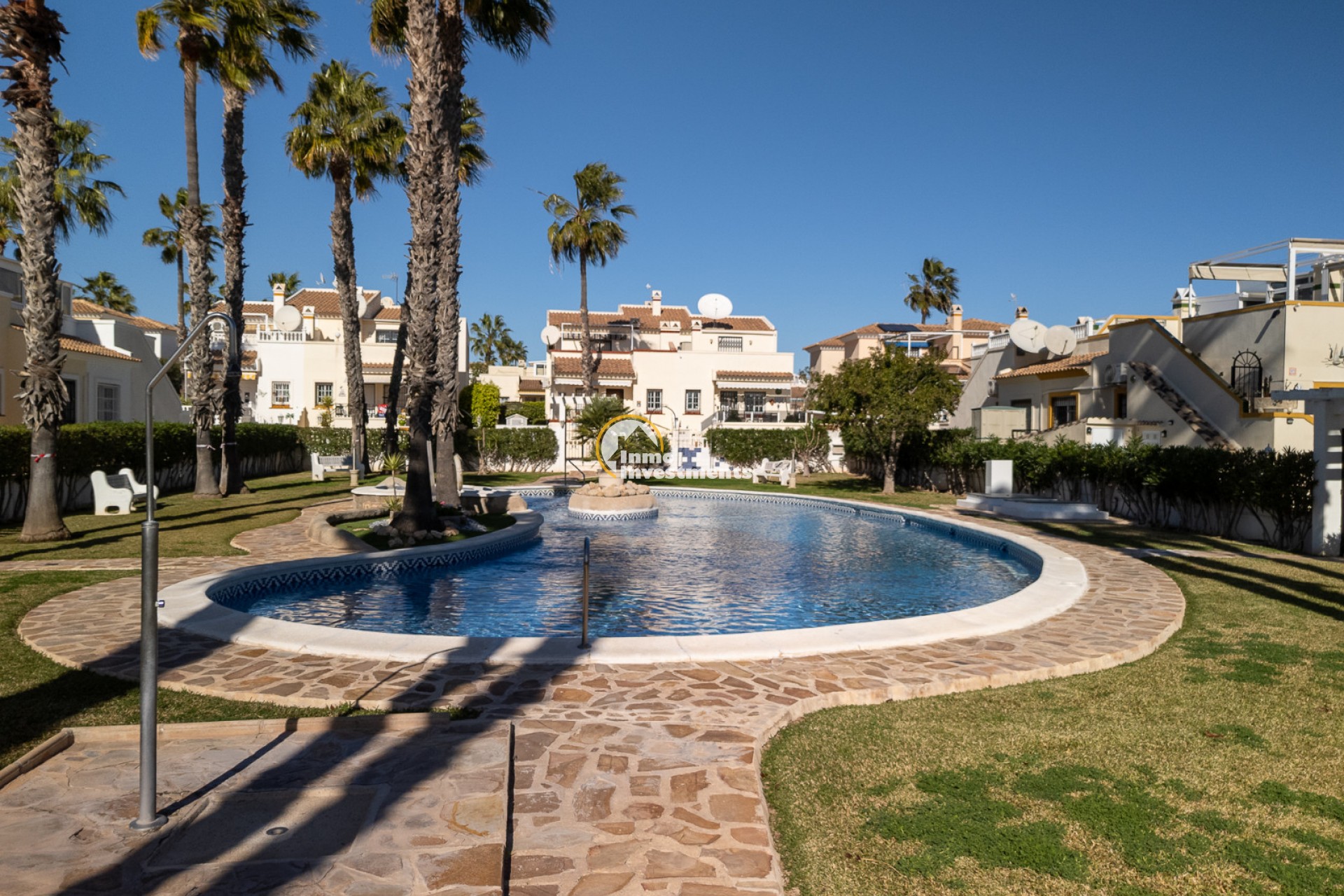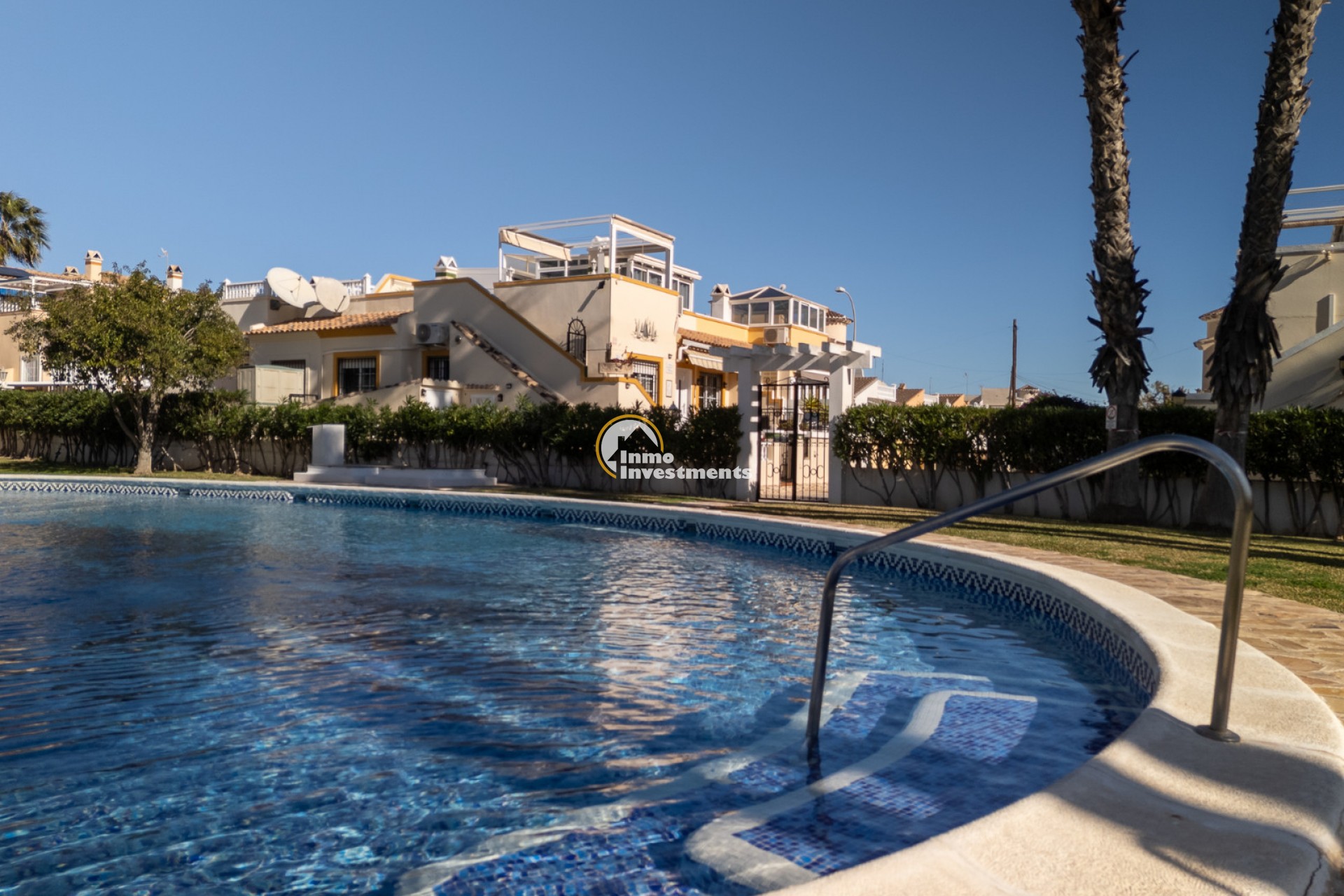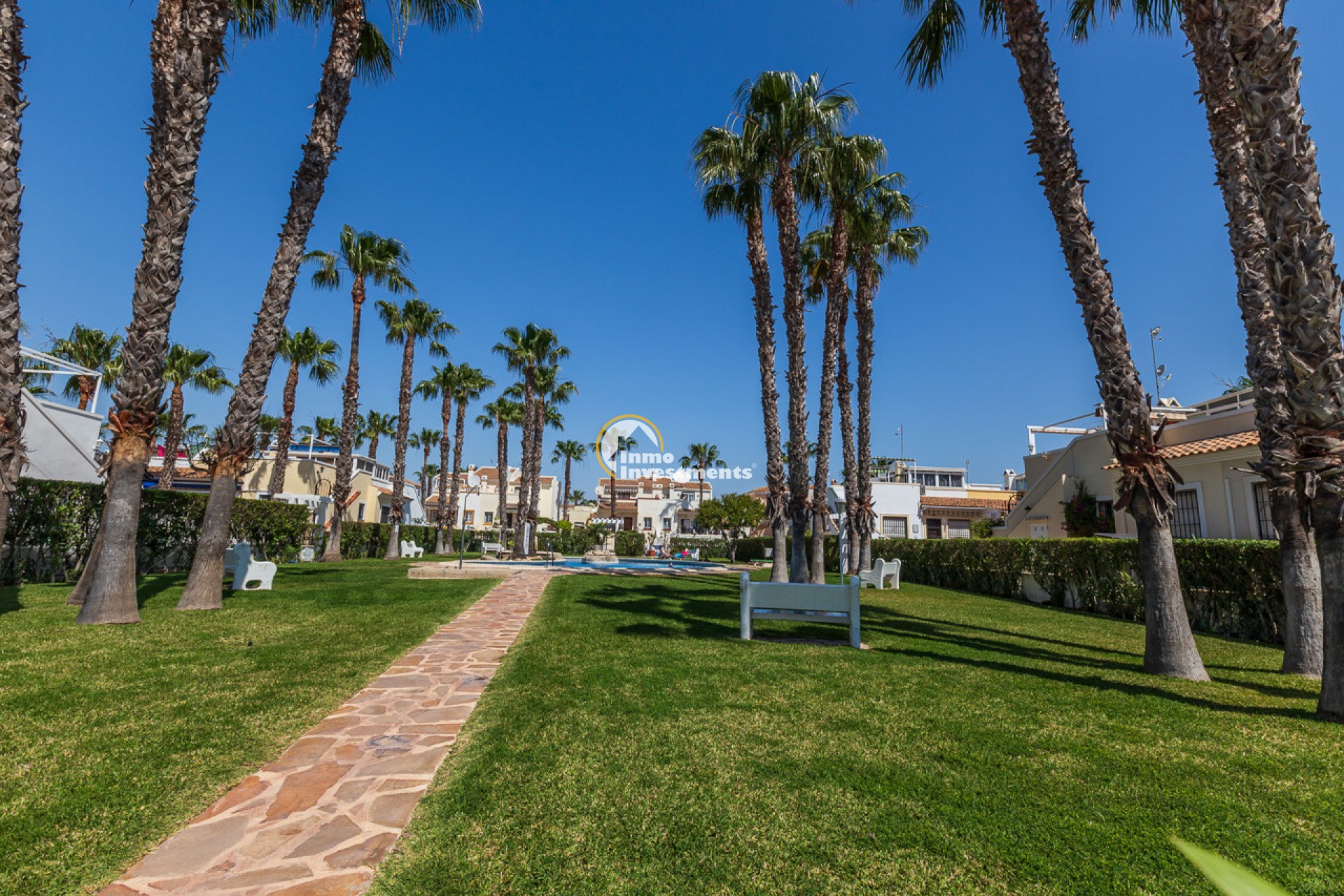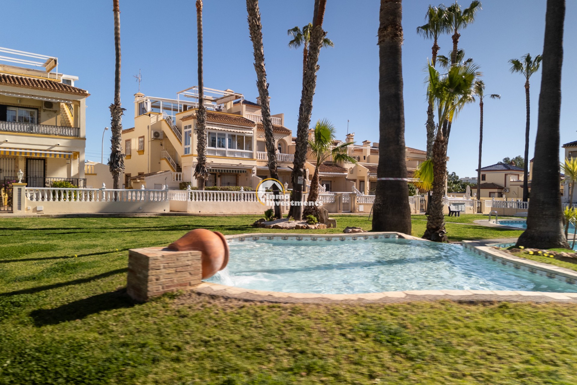 Discover this charming ground floor bungalow located in one of the most beautiful and characterful residential complexes in Playa Flamenca. A typically Mediterranean community, built in the traditional style that is no longer constructed today, with spacious green areas, palm trees and three magnificent communal swimming pools surrounded by natural grass, creating a peaceful and welcoming environment.