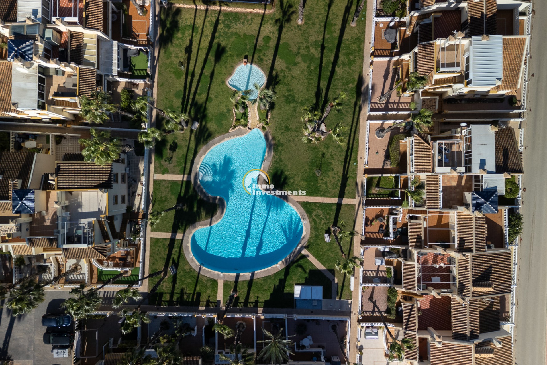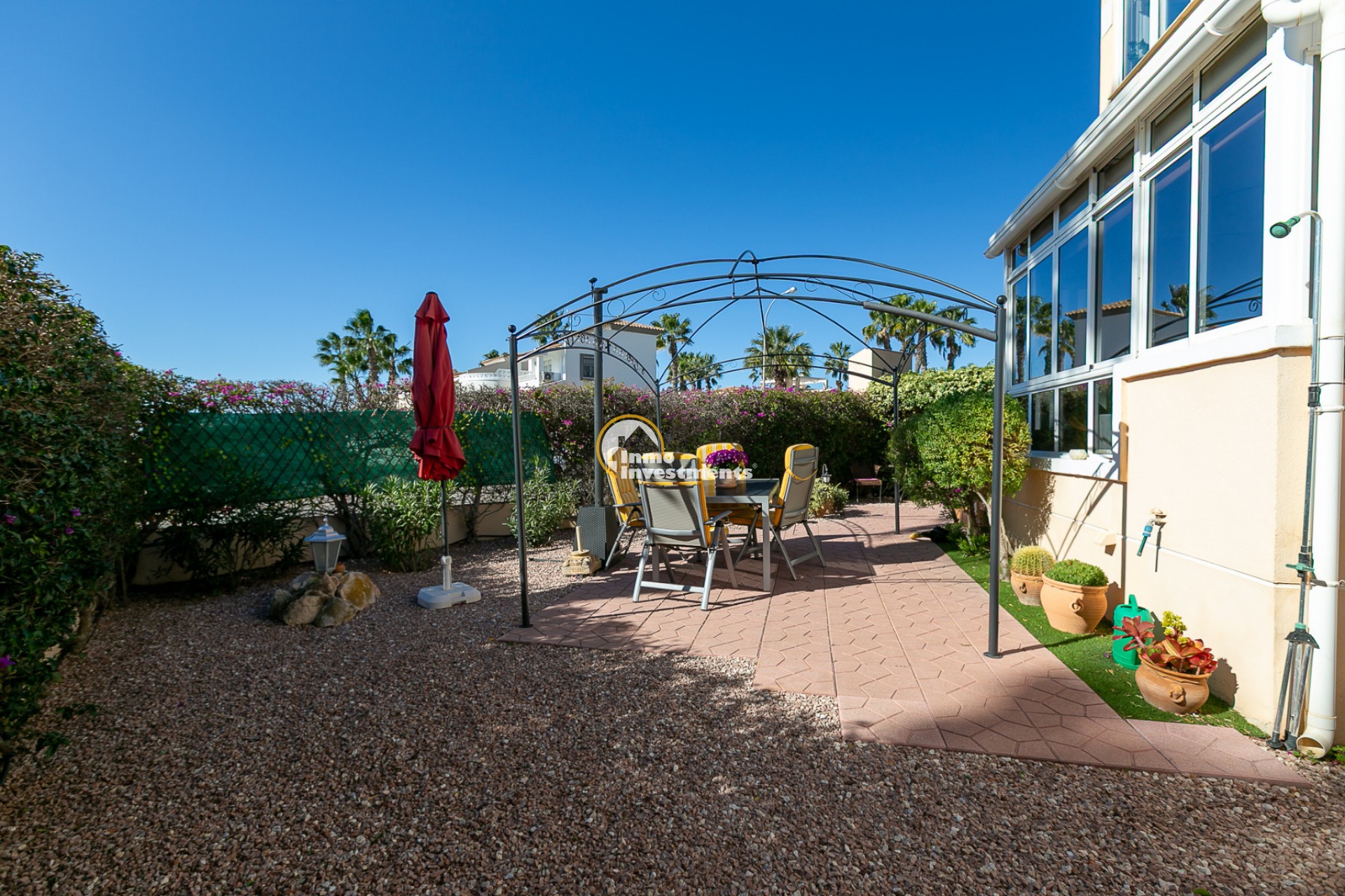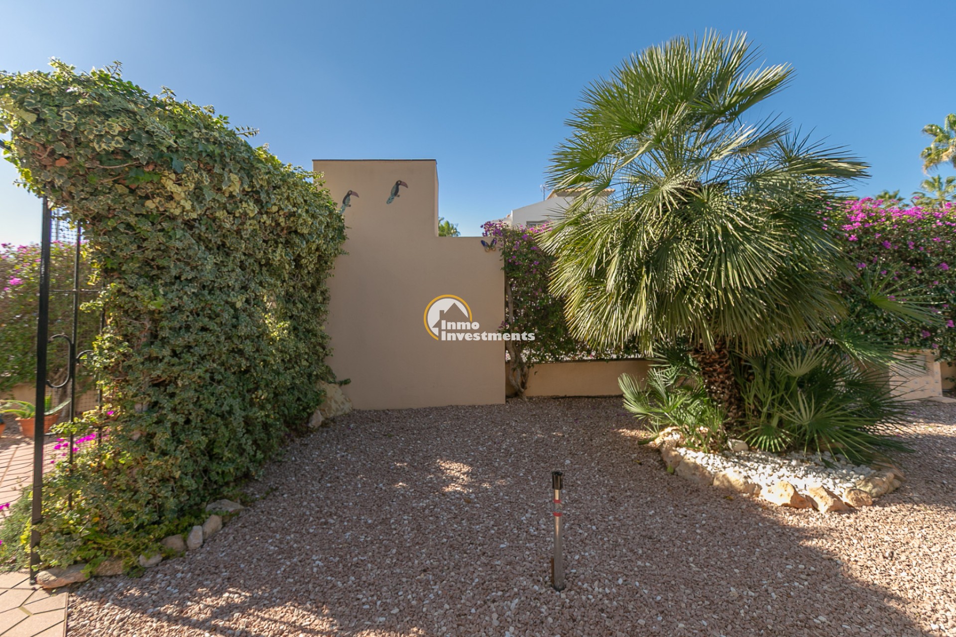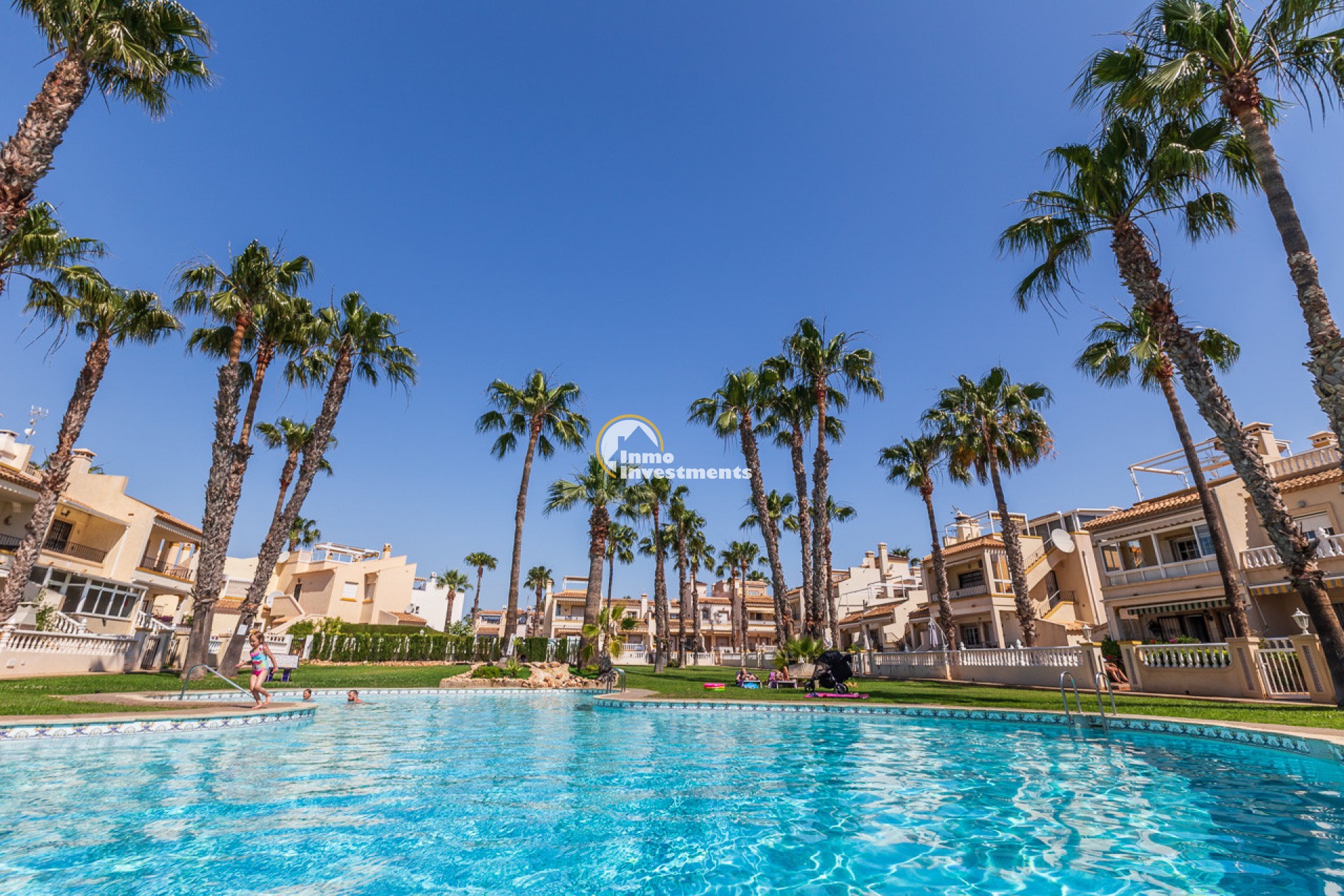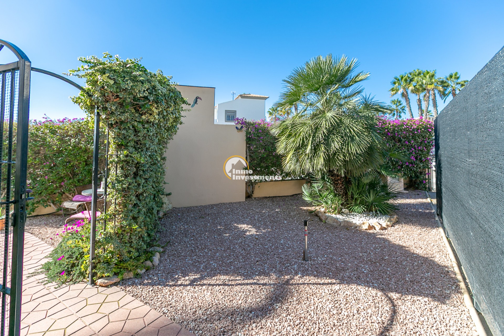 Discover this charming ground floor bungalow located in one of the most beautiful and characterful residential complexes in Playa Flamenca. A typically Mediterranean community, built in the traditional style that is no longer constructed today, with spacious green areas, palm trees and three magnificent communal swimming pools surrounded by natural grass, creating a peaceful and welcoming environment.
