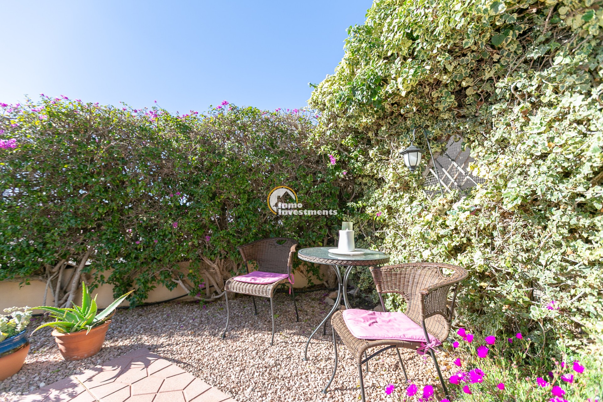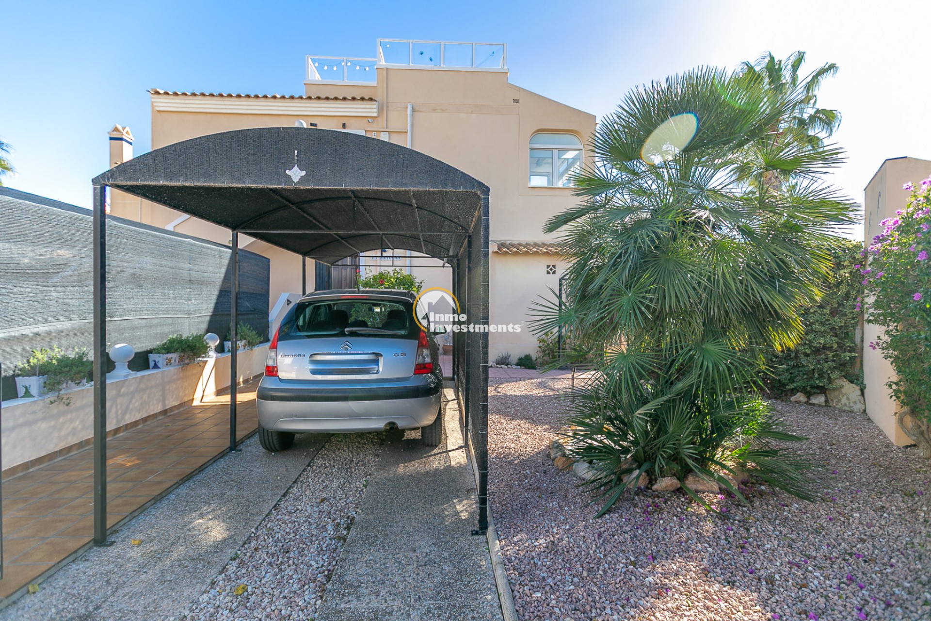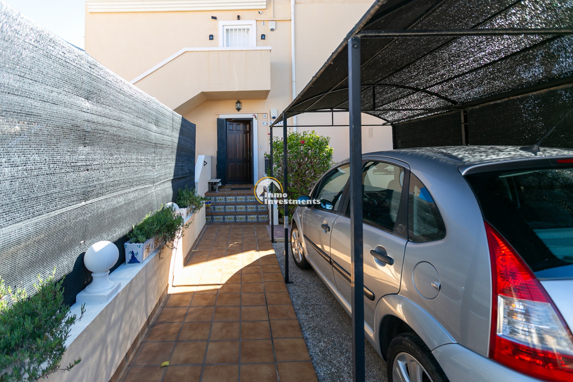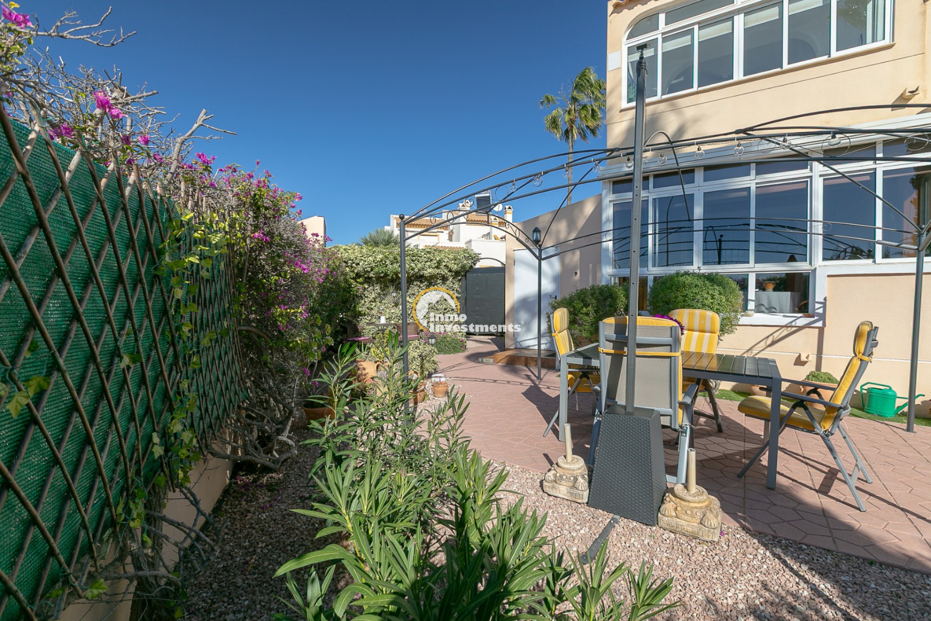 The property is a corner unit with its own independent entrance and offers the possibility to park the car inside the plot. Surrounding the home is a spacious and sunny south-facing garden, a true private oasis that is easy to maintain. The garden features different areas: a gazebo perfect for outdoor dining, a cosy corner with a small table and chairs ideal for enjoying your first coffee in the morning sunshine, and another space designed for relaxing or sharing moments with family. It also includes a practical storage room for garden tools or anything you prefer to keep outside the house.