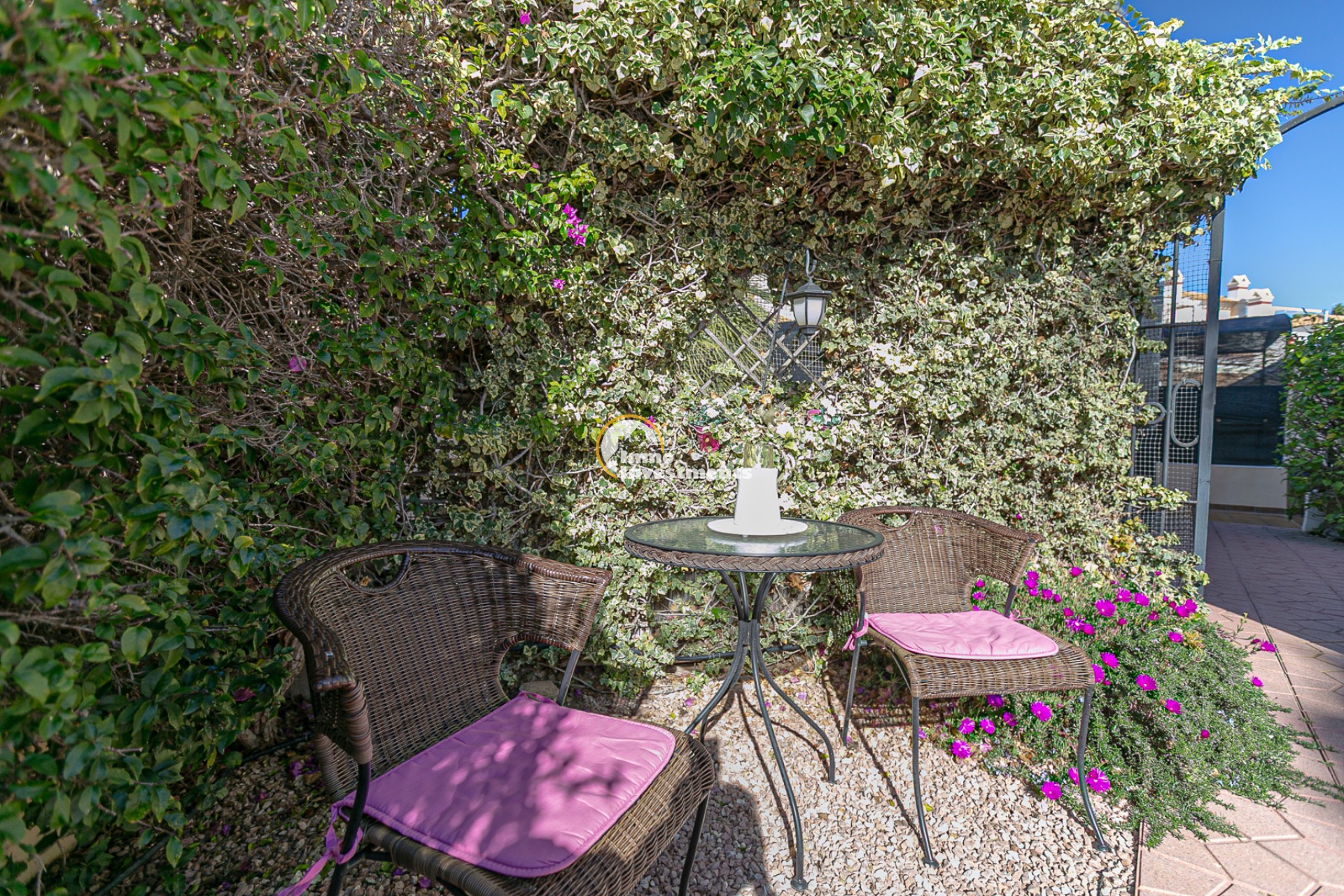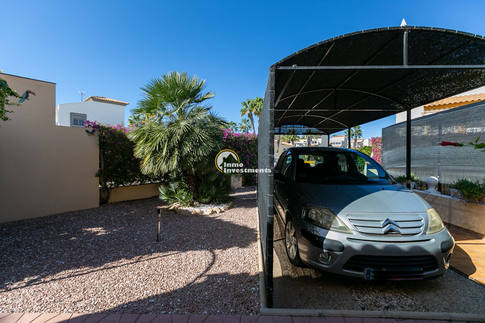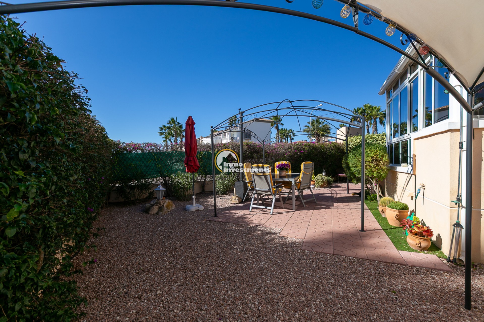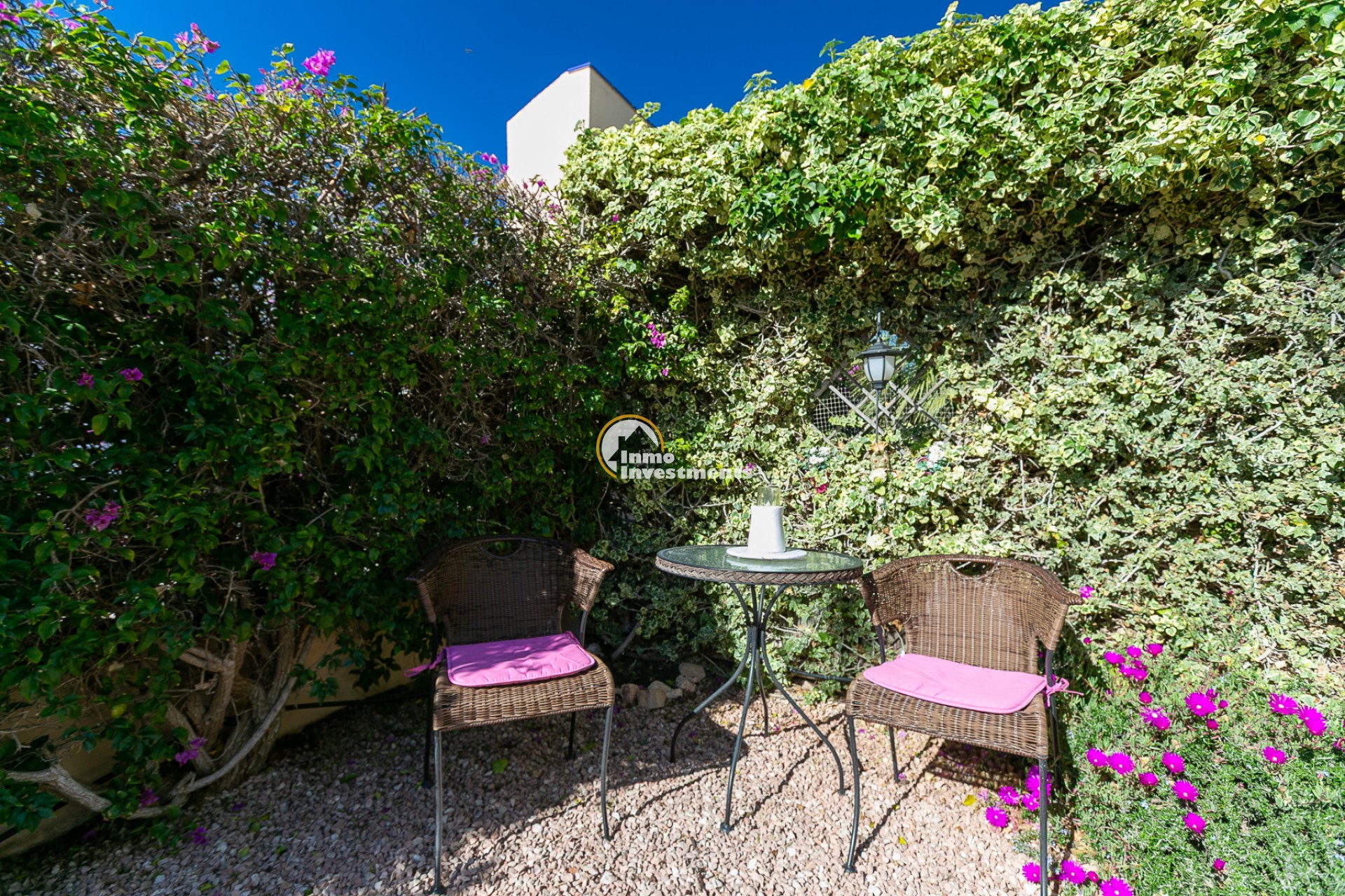 The property is a corner unit with its own independent entrance and offers the possibility to park the car inside the plot. Surrounding the home is a spacious and sunny south-facing garden, a true private oasis that is easy to maintain. The garden features different areas: a gazebo perfect for outdoor dining, a cosy corner with a small table and chairs ideal for enjoying your first coffee in the morning sunshine, and another space designed for relaxing or sharing moments with family. It also includes a practical storage room for garden tools or anything you prefer to keep outside the house.