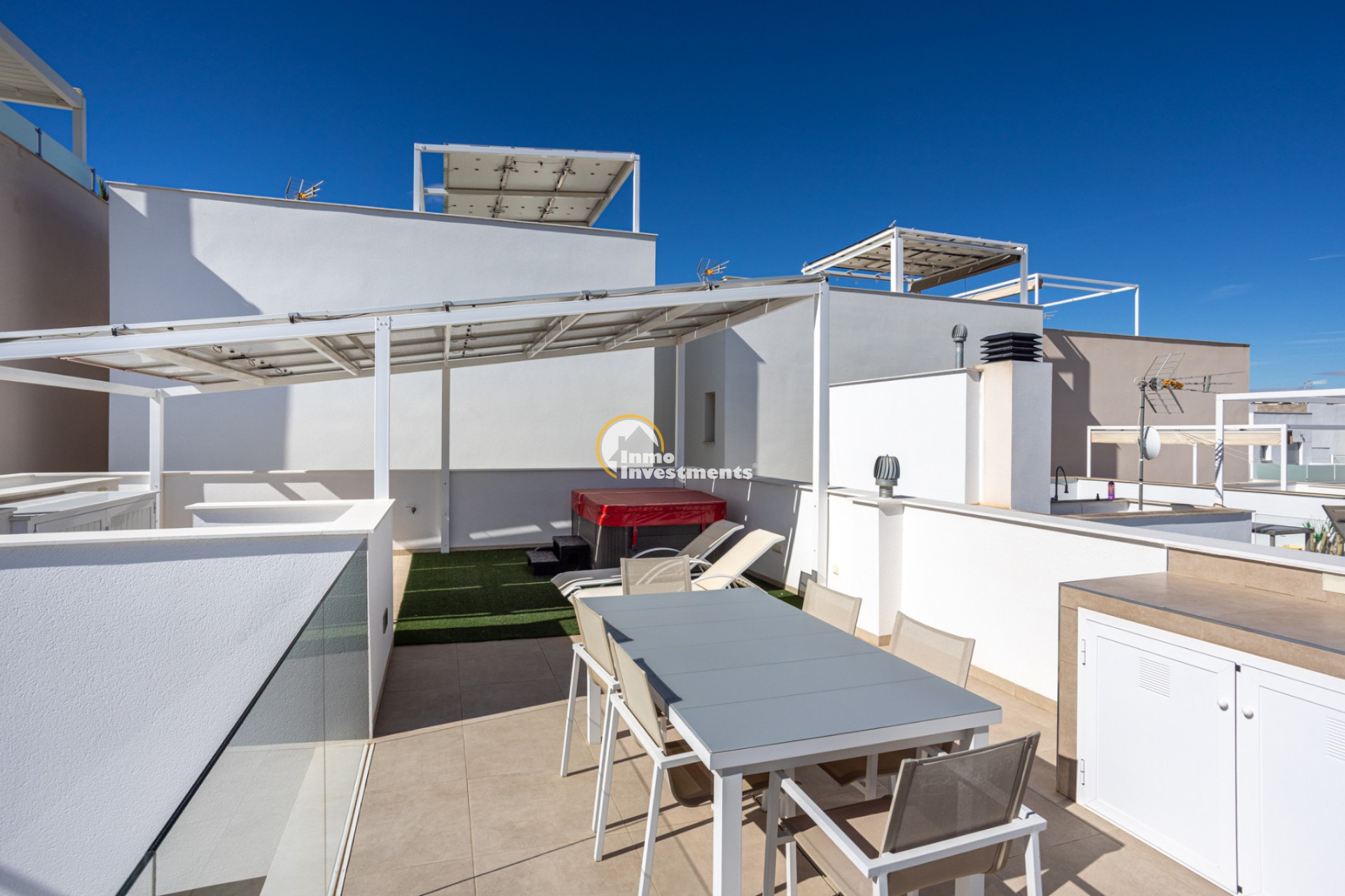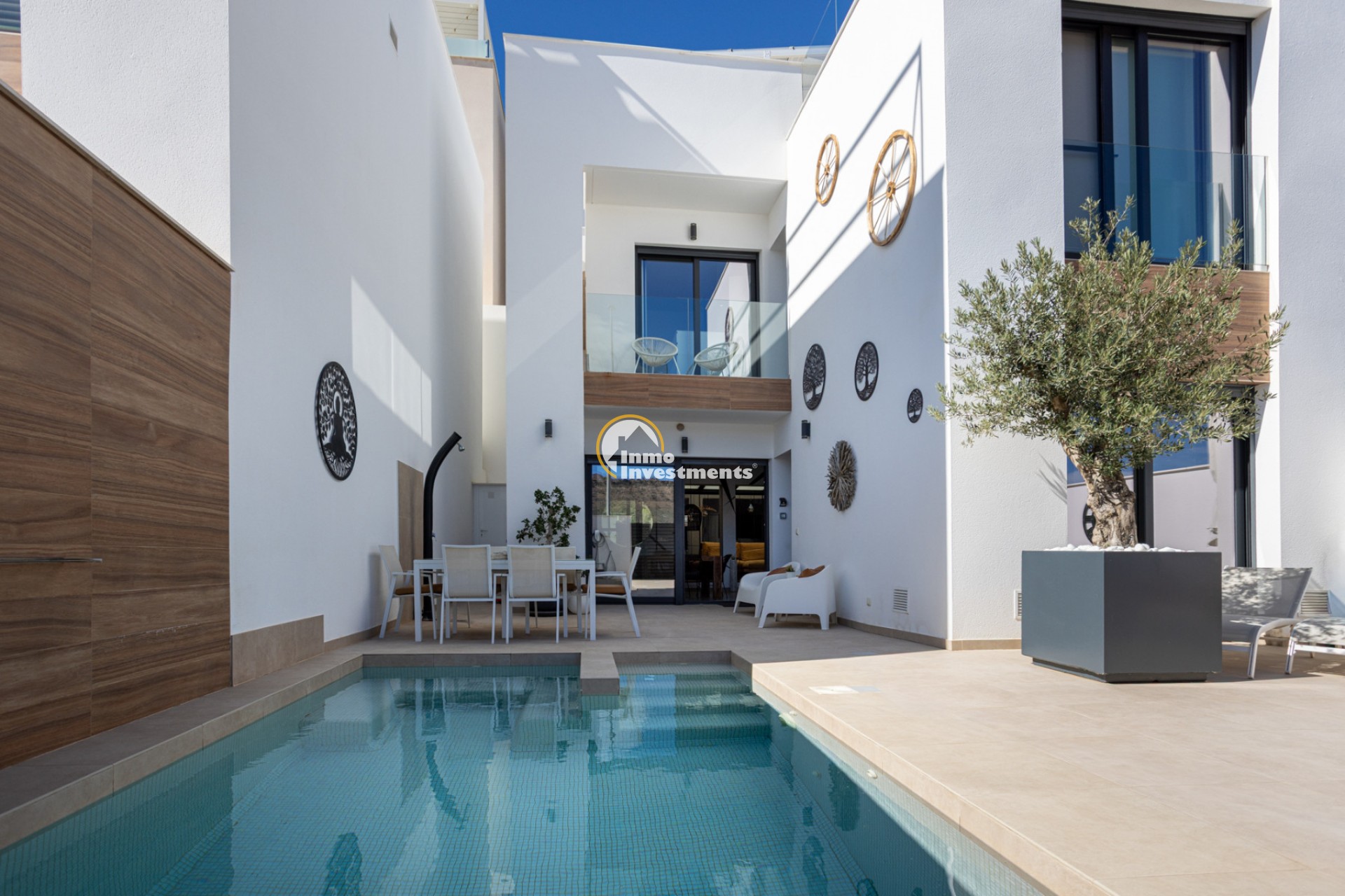 Modern town house in Benijófar, one of the most sought-after and fast-growing towns on the Costa Blanca. There are three bedrooms, each with its own en-suite bathroom. At the moment, one of the spaces is set up as a walk-in wardrobe and home office, but it can easily be converted back depending on what you need.The living area is bright and modern, with a fully equipped open-plan kitchen and large sliding windows that lead straight out to the terrace and pool area, giving it that perfect indoor-outdoor Mediterranean feel. The pool is private & heated so you can use it all year round, plus a large rooftop solarium with beautiful open views. It also comes with solar panels, an electric car charging point and plenty of storage space. The property is sold fully furnished and tastefully decorated, so it’s completely ready to move into. Built in 2018 and in immaculate condition, it sits right opposite a lovely park where no building is permitted, so you’re guaranteed open views and total peace and quiet. At the same time, you’re just a short walk from the town centre, restaurants and all local amenities. Contact us today for your viewing