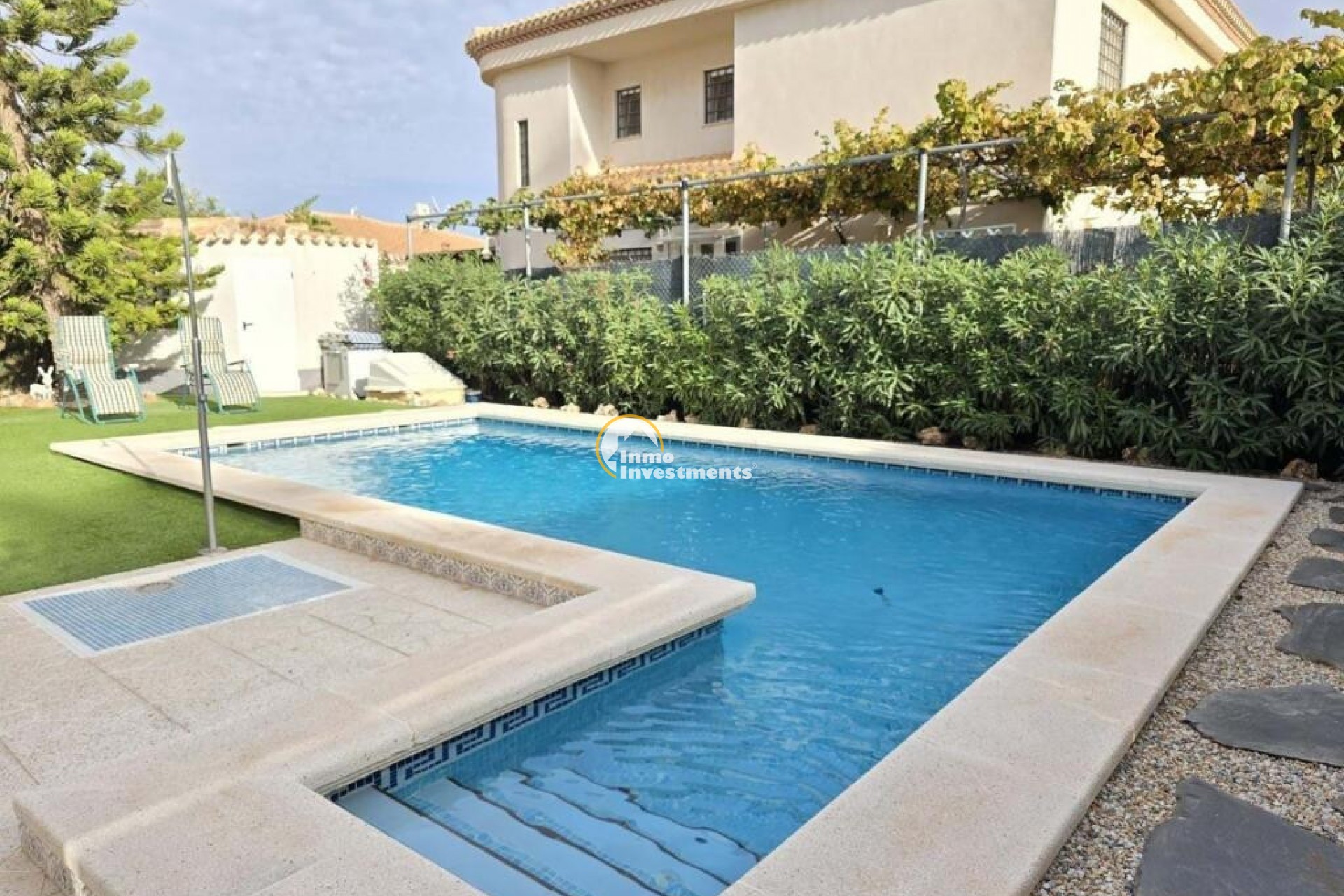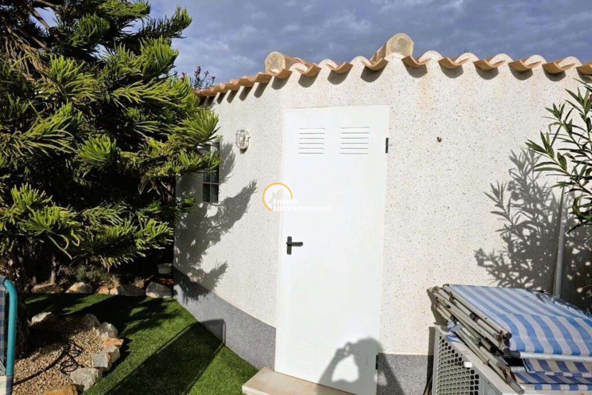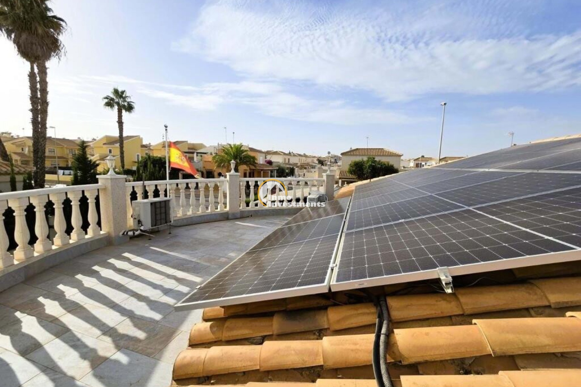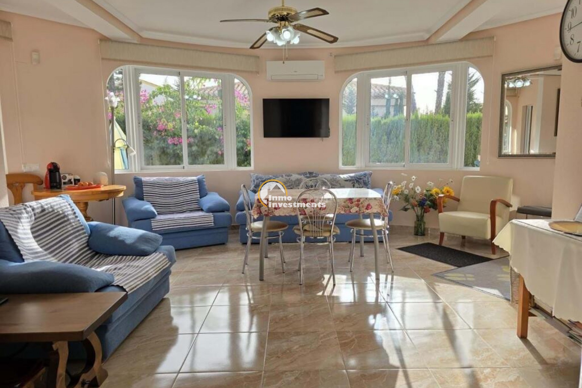 Traditional Spanish villa in the heart of Playa Flamenca, within walking distance to La Zenia Boulevard. Built in 1998, the property offers 150 m² of living space on one level, with 3 bedrooms, 2 bathrooms. On entering the property, you are welcomed by a bright conservatory currently used as a second living area, fitted with sofas, TV, air conditioning and ceiling fans. The main lounge is spacious and well-lit, with large windows, a fireplace and air conditioning, and leads through to a fully equipped kitchen with oven and dishwasher, along with a separate utility area housing the washing machine, dryer and boiler .All bedrooms are double rooms with fitted wardrobes and air conditioning. The master bedroom includes a renovated en-suite bathroom with walk-in shower, while the main bathroom is also fitted with a shower.Additional features include electric underfloor heating with temperature control, 10 kW solar panels, an alarm system, internal and external storage, and a 25 m² underbuild providing further storage space. The property benefits from a south-facing orientation, ensuring sunlight throughout the day. A well-maintained property offering practical living space in a convenient location close to the coast. Set on a 500 m² plot, it features a private 4x8 heated pool, landscaped gardens with fruit trees, and a carport. Sold partly furnished (subject to inventory), the house includes extras such as underfloor heating and air conditioning in all rooms. Located close to all amenities and approximately 15 minutes from the beach. Contact us for further information!